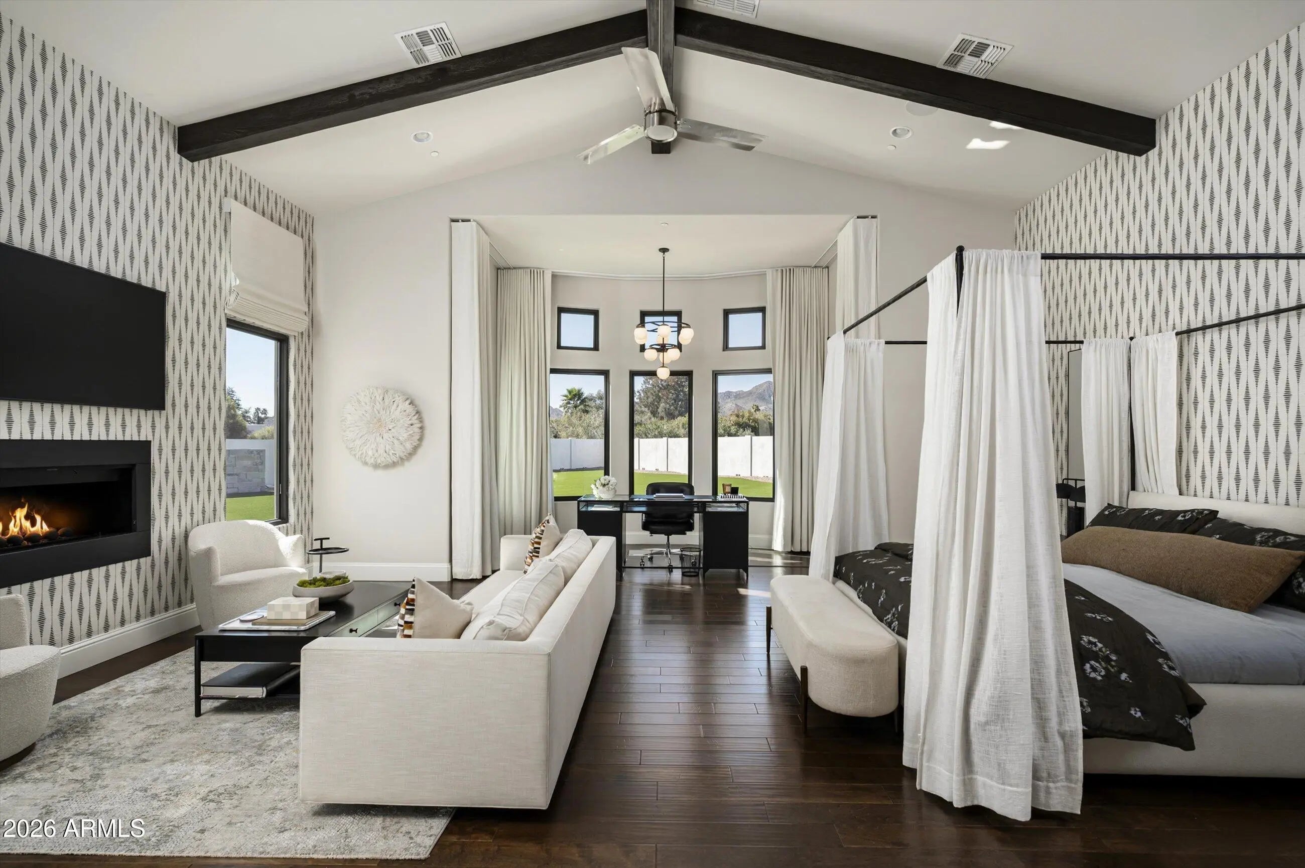 Set in the heart of prestigious Paradise Valley, this property is a private desert retreat surrounded by luxury estates and breathtaking mountain scenery. This single level residence offers 5 en-suite bedrooms, 5.5 bathrooms, a game room, study and approximately 6,744 square feet of thoughtfully designed living space. The home welcomes you with generous living and entertaining areas filled with natural light, high ceilings and seamless indoor-outdoor flow. The kitchen features beautiful custom cabinetry, high end appliances, quartz countertops, ample storage and an ideal layout for both everyday living and hosting. The primary suite serves as a private retreat, complete with fireplace, spa-style bath, walk-in closet and patio access. Outdoors, the property is designed for true Arizona living, featuring pool/spa with water and fire features and a swim up bar, expansive covered patio space, multiple seating areas, in ground trampoline, large grassy turf spaces, outdoor kitchen, mature desert landscaping and privacy. Enjoy views of Mummy Mountain and surrounding peaks, vibrant sunsets, and tranquil desert skies from your own backyard oasis. Ideally located just minutes from world-class resorts, fine dining, championship golf, hiking trails, and the best of Scottsdale and Phoenix, this home combines peaceful seclusion with unmatched convenience. Whether enjoyed as a primary residence or seasonal escape, this Paradise Valley property offers timeless appeal in one of Arizona's most coveted locations.
