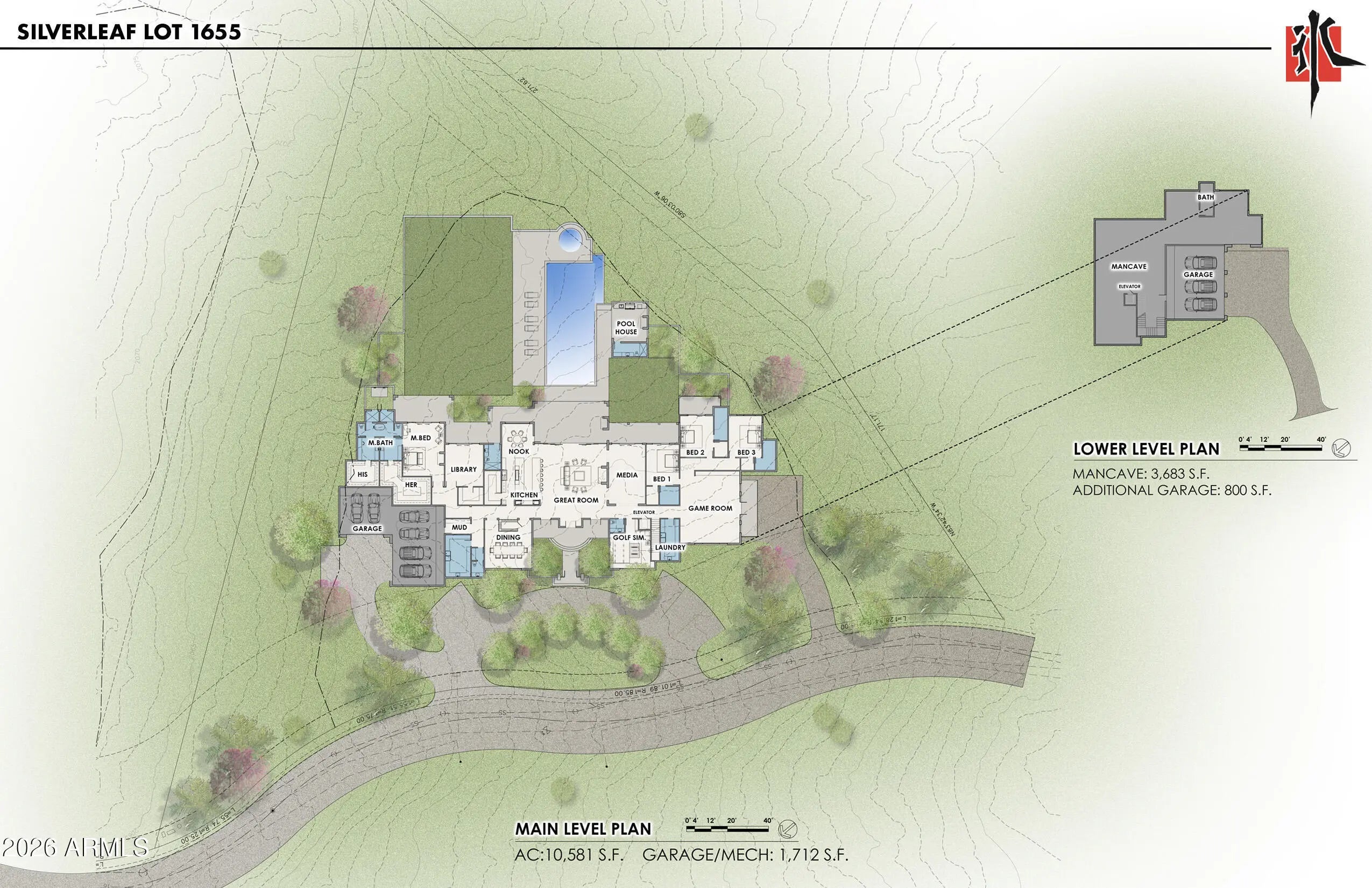 Amazing opportunity to purchase a Brand-New Luxury Estate in the highly desirable Silverleaf Upper Canyon community with spectacular Mountain and City Light views. This masterpiece was created by renowned architect Bing Hu and will be artfully crafted by Sommer Custom Homes. The home will sit on a pristine and tranquil 1.45-acre property with almost an acre of useable land providing expansive outdoor living areas and showcases a very functional 10,581 livable sq ft home with no steps on the main level floor and backyard areas. There is an additional 3,683 livable sq. ft. space in the walkout basement below for flexible space to be created for just about any purpose that is needed. The main level of the home offers 4 or 5 full bedroom suites, spacious Great room, Kitchen w/ two islands ...& large walk-in pantry, Breakfast nook, formal Dining room, Wine room, 2 powder baths, a huge Game/Entertainment room plus a separate Media room, a Golf Simulator room, two laundry rooms, mud room, and an Elevator to the lower level basement area. The Library/Office space can remain as is or it can be the 5th bedroom suite. The walkout basement is a very flexible space and can be used for many activities and purposes and includes a full bathroom, three car garage, and has interior main floor access by use of the elevator or the staircase. This walkout basement can be a full guest house with a separate bedroom and living space and kitchen if needed. It could also be used as a Wellness Center with a sauna, cold plunge, steam room, and there would still be plenty of space left for a large gym and other fitness uses. This space can also be used for a kids retreat & play area which could be designed into unique spaces for gaming, indoor sports, a movie room, reading room, game table areas, etc. Another use could be a Man Cave with a full bar, media area, collectables room, a variety of simulator equipment, additional wine storage, cigar area, and other adult game tables, etc. One more possibility is to use this entire space for additional climate-controlled car storage fitting up to a dozen or more cars on the floor and close to twice that if car lifts were used. The backyard has a gorgeous 60' x 24' pool with a separate hot tub and plenty of room for lounge chairs and a huge 50' x 80' lawn area on one side of the pool for lawn games, playground, and putting green, etc. with an additional 30' x 30' lawn area on the opposite side of the pool for additional uses. There are several covered patios across most of the rear of the home providing outdoor dining and entertainment areas with the largest patio opening up to the Great room through a 32' wide stacking door system making the two areas feel like one space when fully opened. Silverleaf, located in North Scottsdale, Arizona, is a prestigious guard gated community known for its luxurious estates, exclusive golf courses, private Club and stunning desert landscapes. The Tom Weiskopf-designed Silverleaf Golf Course is a highlight for golf enthusiasts. With a blend of Spanish and Mediterranean-inspired architecture, the community offers a high standard of living, including upscale amenities like spas, fine dining, and exclusive shopping. Residents enjoy a harmonious balance between modern luxury and the natural beauty of the desert environment, making Silverleaf a sought-after destination for those seeking an exceptional lifestyle in North Scottsdale.