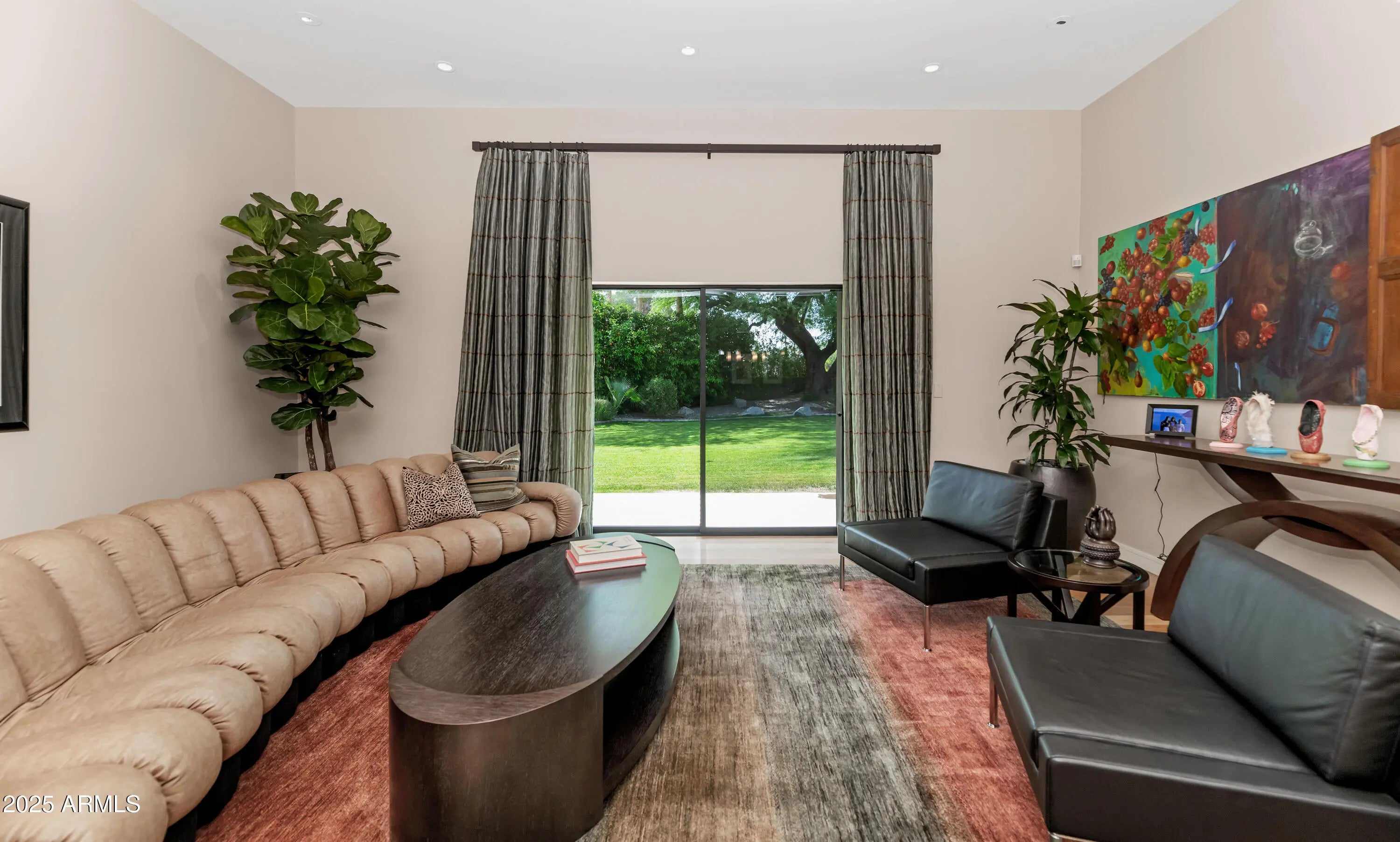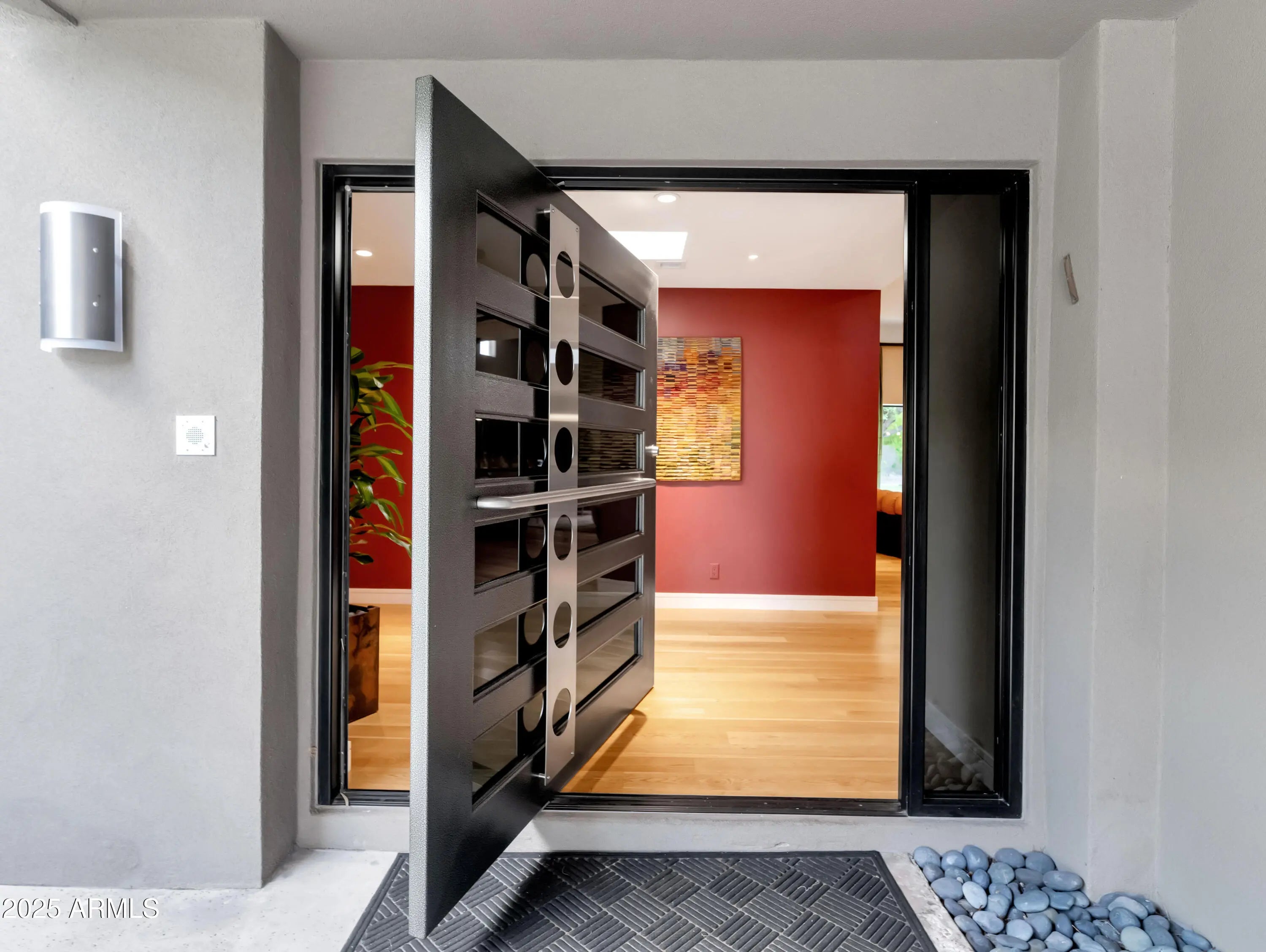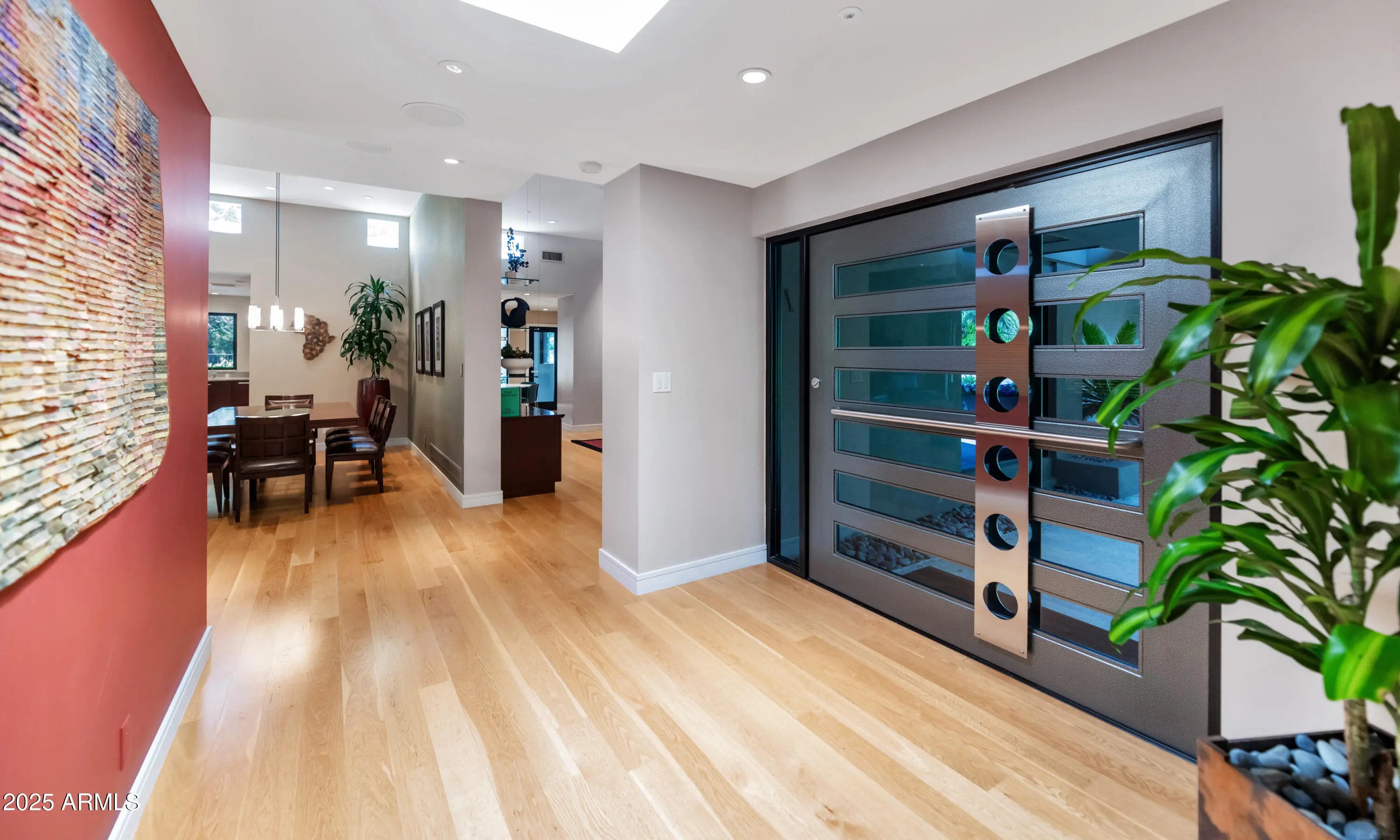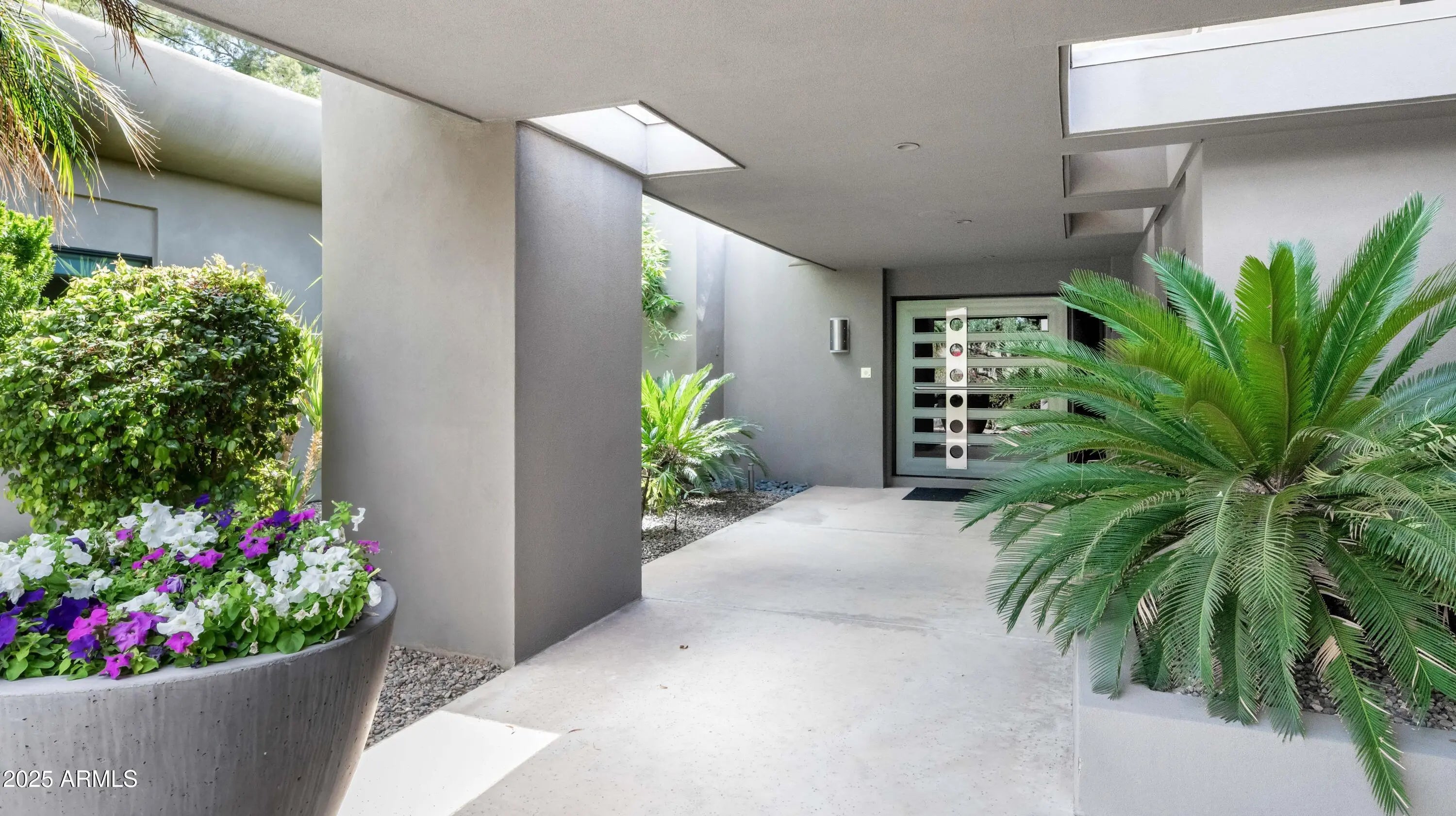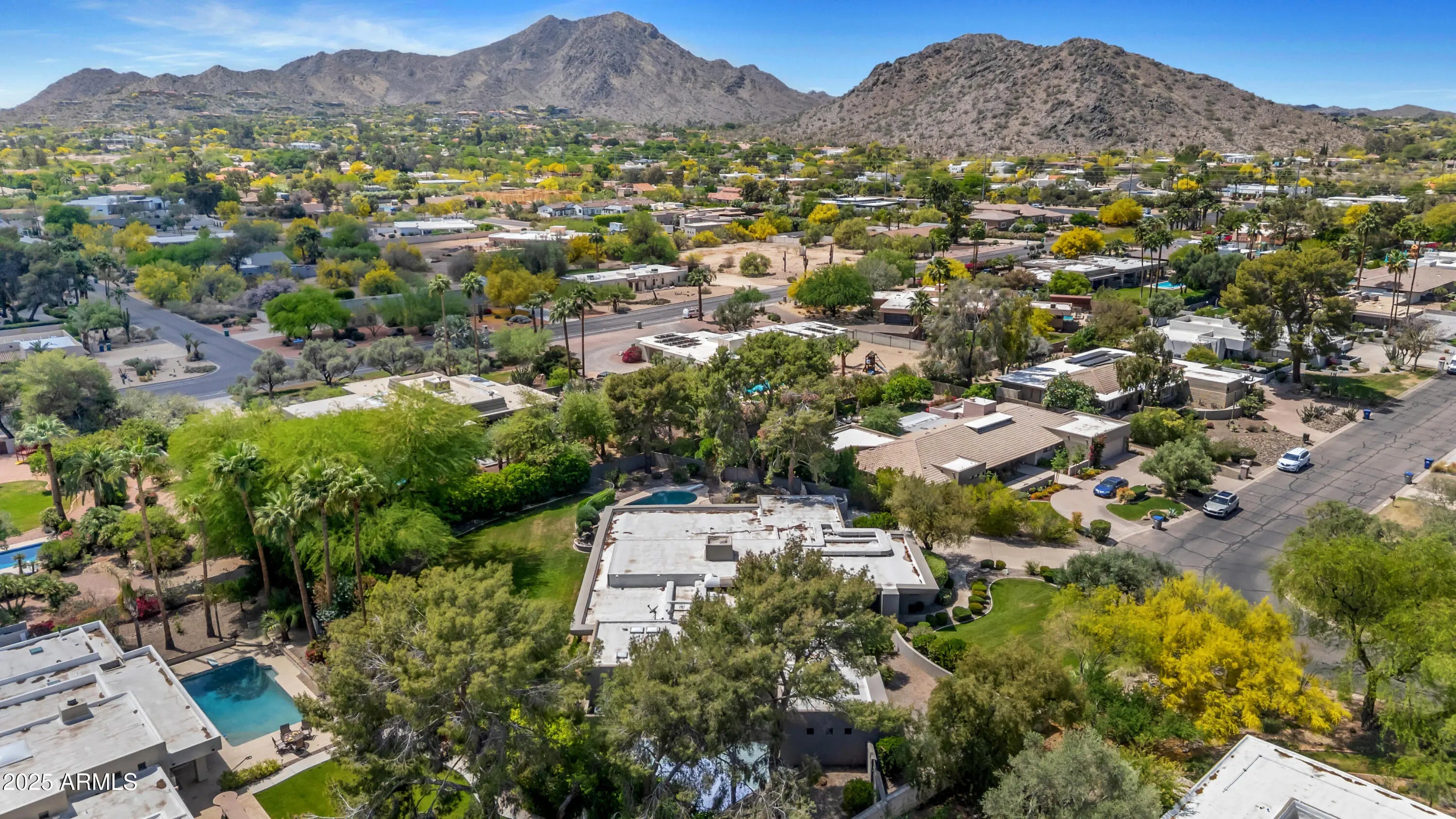 Welcome to this exceptional home, a true architectural gem, originally designed by world-famous Taliesin Architects and reimagined in 2005 as a tribute to the legendary Frank Lloyd Wright. Taken down to the studs and thoughtfully expanded, this residence was transformed to offer an open and functional floor plan, perfect for modern living. From the moment you arrive, you're greeted by a true work of art—the custom hammered steel pivot front door sets the tone for the craftsmanship found throughout the home. Step inside and you'll be welcomed by soaring ceilings and celestial windows that bathe the interior in natural light. The spacious layout includes two distinct living areas, offering flexibility and comfort, plus a dining area ideally situated just off the kitchen. A chef's dream, the kitchen features sleek stainless steel Wolf & Sub-Zero appliances, multiple ovens, a warming drawer, a large walk-in pantry with a wine fridge, Poggenpohl cabinetry and plenty of space to gather and create. On one wing of the home, you'll find three generously sized bedrooms, with walk in closets, and two beautifully appointed bathrooms. On the other side, the primary suite is a private retreat with a large sliding glass door, built-in bookcase, and a spa-like bathroom featuring honed slate floors, granite countertops, custom cherry wood cabinetry, a jetted tub, steam shower, and a spacious walk-in closet. Additional highlights include a large office with custom-made Herman Miller casegoods designed for the room and a dedicated workout room & flex room ideal for those who work or train from home. Step outside to your own private oasis - lush, mature landscaping surrounds a diving pool, a sport court, and one of the most beautiful mesquite trees you'll ever see. The covered patio features a pass-through window to the kitchen, a misting system for comfort, and ample space to entertain or unwind. Located in Mountain View Estates, a secluded enclave of just 56 homes, this property offers both privacy and convenience, close to top restaurants, shopping, and more. This property is truly a one-of-a-kind home in an unbeatable location.