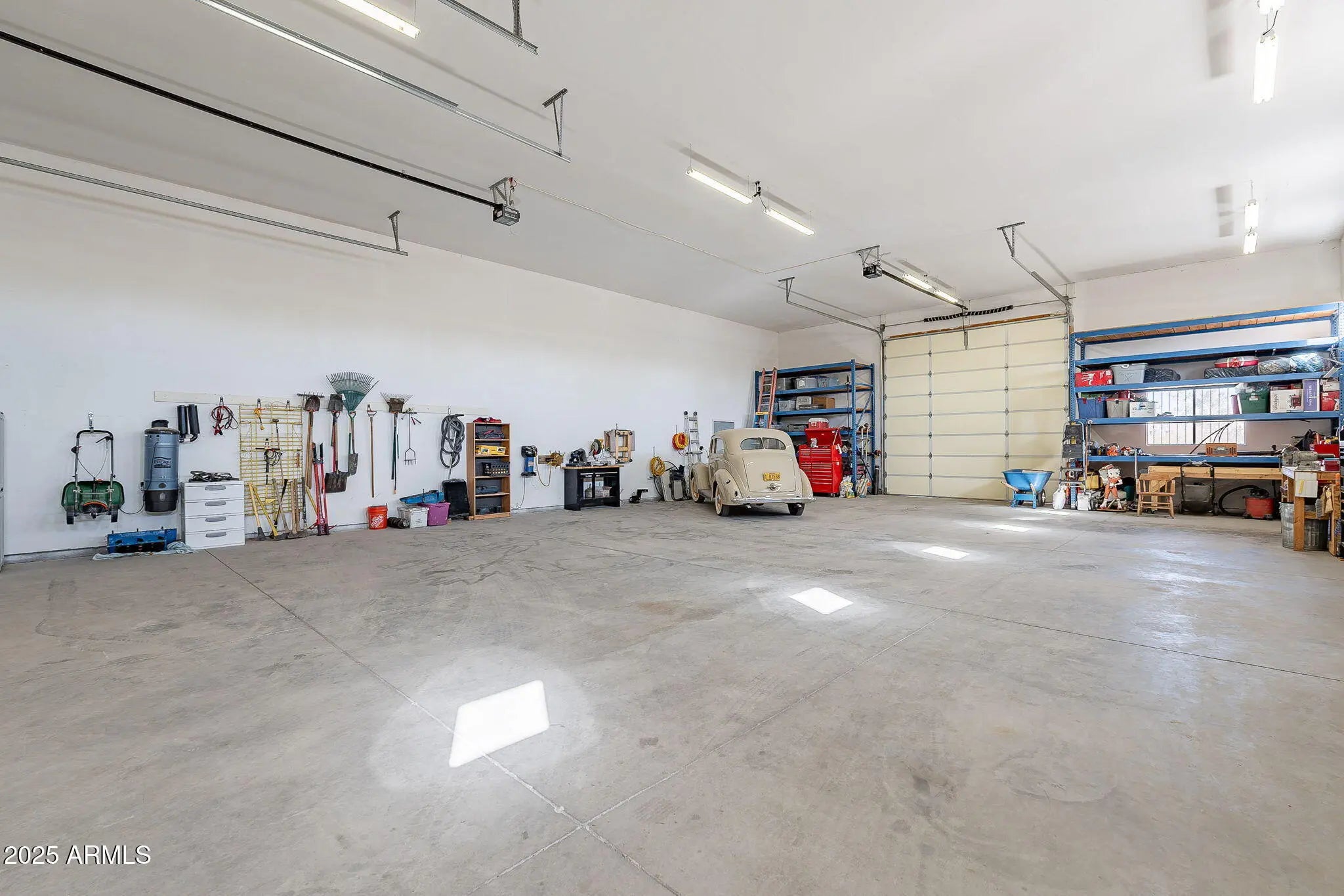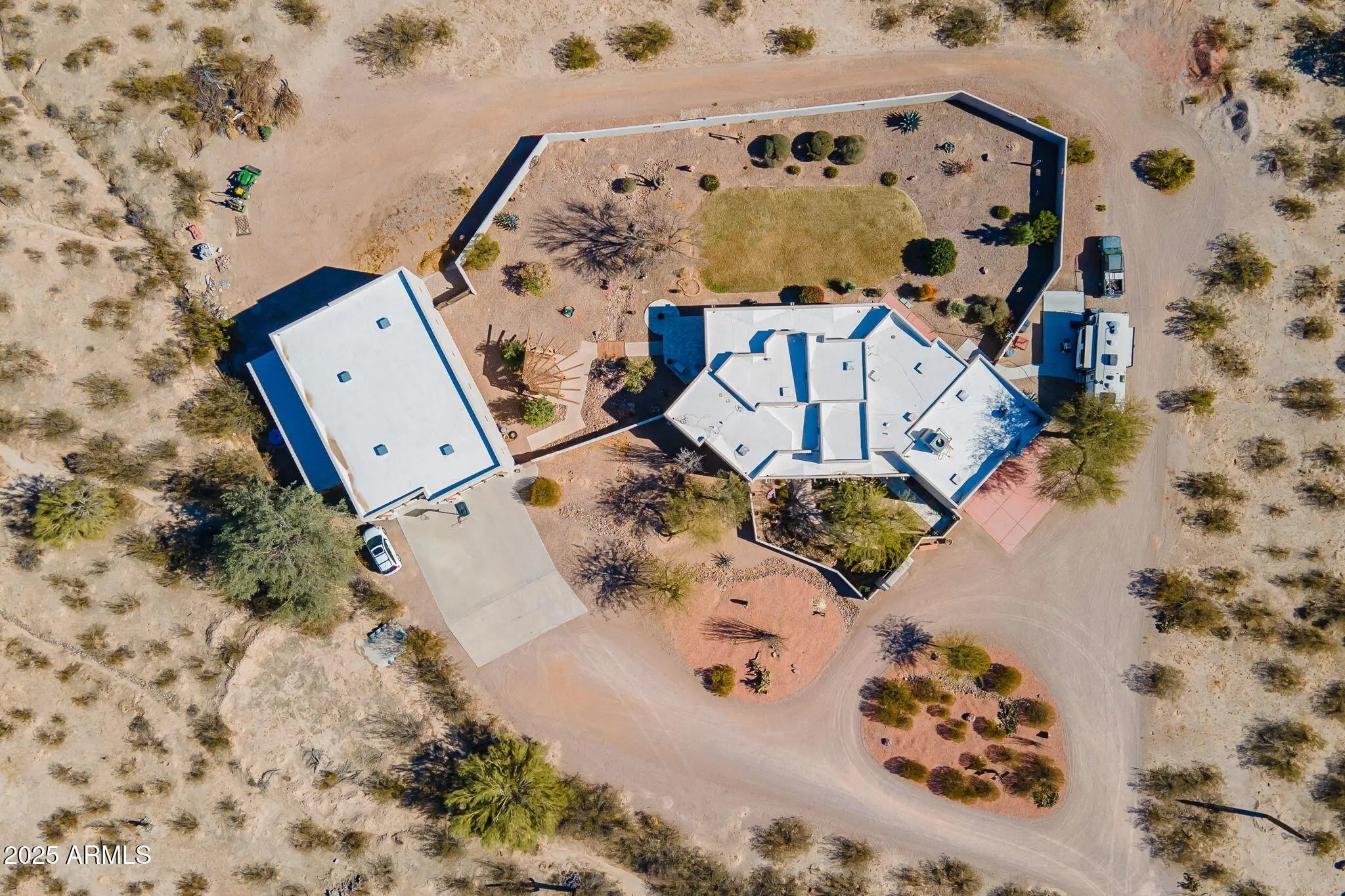 Custom Santa Fe-Style Home on 2.5 Acres - No HOA - 3-Car Garage + 3 Bay RV garage. Welcome to this stunning, one-of-a-kind custom home located on 2.5 acres in Casa Grande with no HOA and breathtaking mountain views. This 3 bed, 2.5 bath property offers space, privacy, and top-tier craftsmanship throughout, including 2x6 construction and solid wood doors. The expansive open-concept layout features a great room with a fireplace and French doors leading to the covered back patio and a landscaped backyard and mountain views Car and RV enthusiasts will love the three-car garage, including a fully insulated single bay with a mini-split A/C, plus a 40x60 detached RV garage with three 14'x14' roll-up bay doors, RV hookups, and a extended concrete driveway.