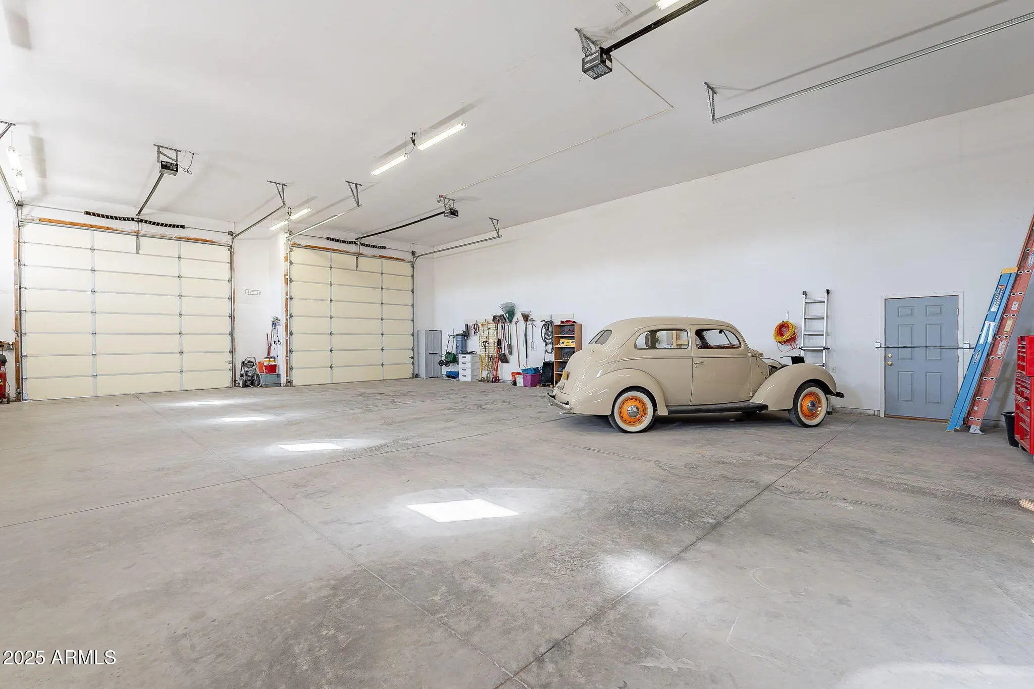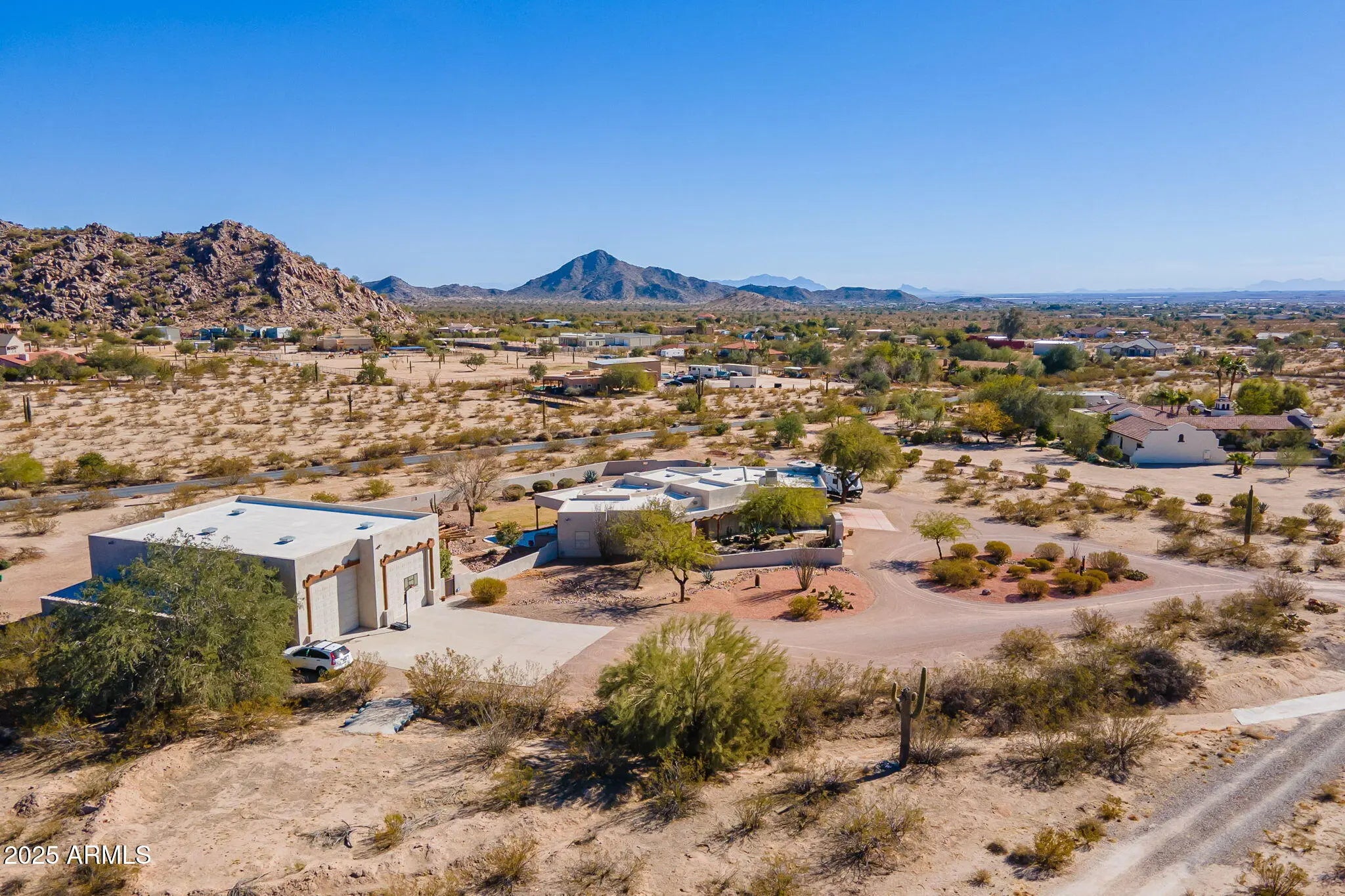 Custom Santa Fe-Style Home on 2.5 Acres - No HOA - 3-Car Garage + 3 Bay RV garage. Welcome to this stunning, one-of-a-kind custom home located on 2.5 acres in Casa Grande with no HOA and breathtaking mountain views. This 3 bed, 2.5 bath property offers space, privacy, and top-tier craftsmanship throughout, including 2x6 construction and solid wood doors. The expansive open-concept layout features a great room with a fireplace and French doors leading to the covered back patio and a landscaped backyard and mountain views Car and RV enthusiasts will love the three-car garage, including a fully insulated single bay with a mini-split A/C, plus a 40x60 detached RV garage with three 14'x14' roll-up bay doors, RV hookups, and a extended concrete driveway.