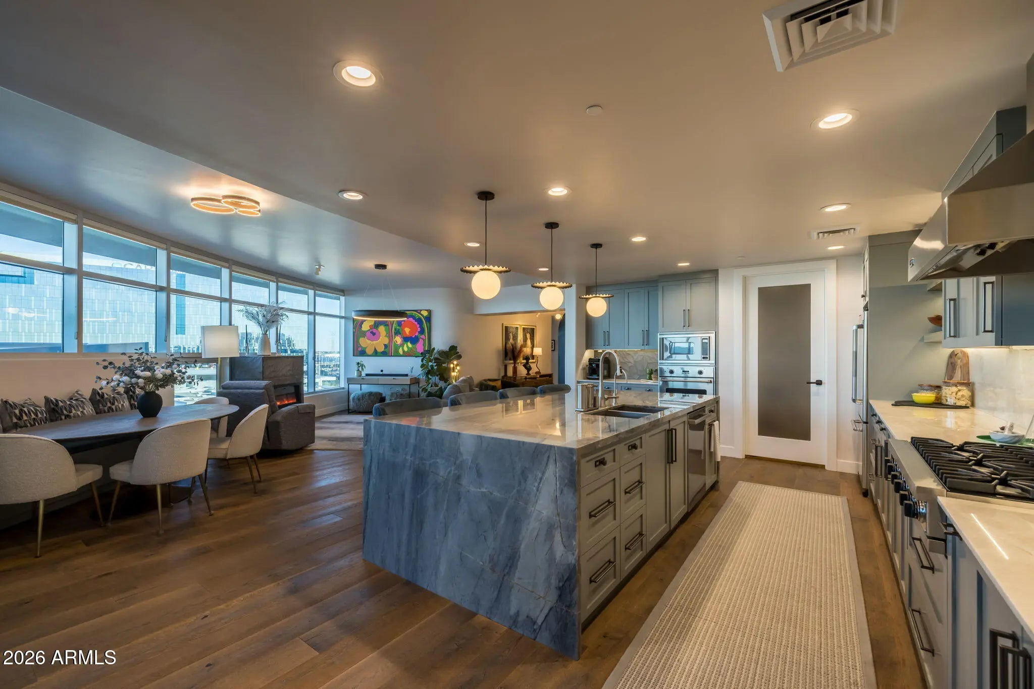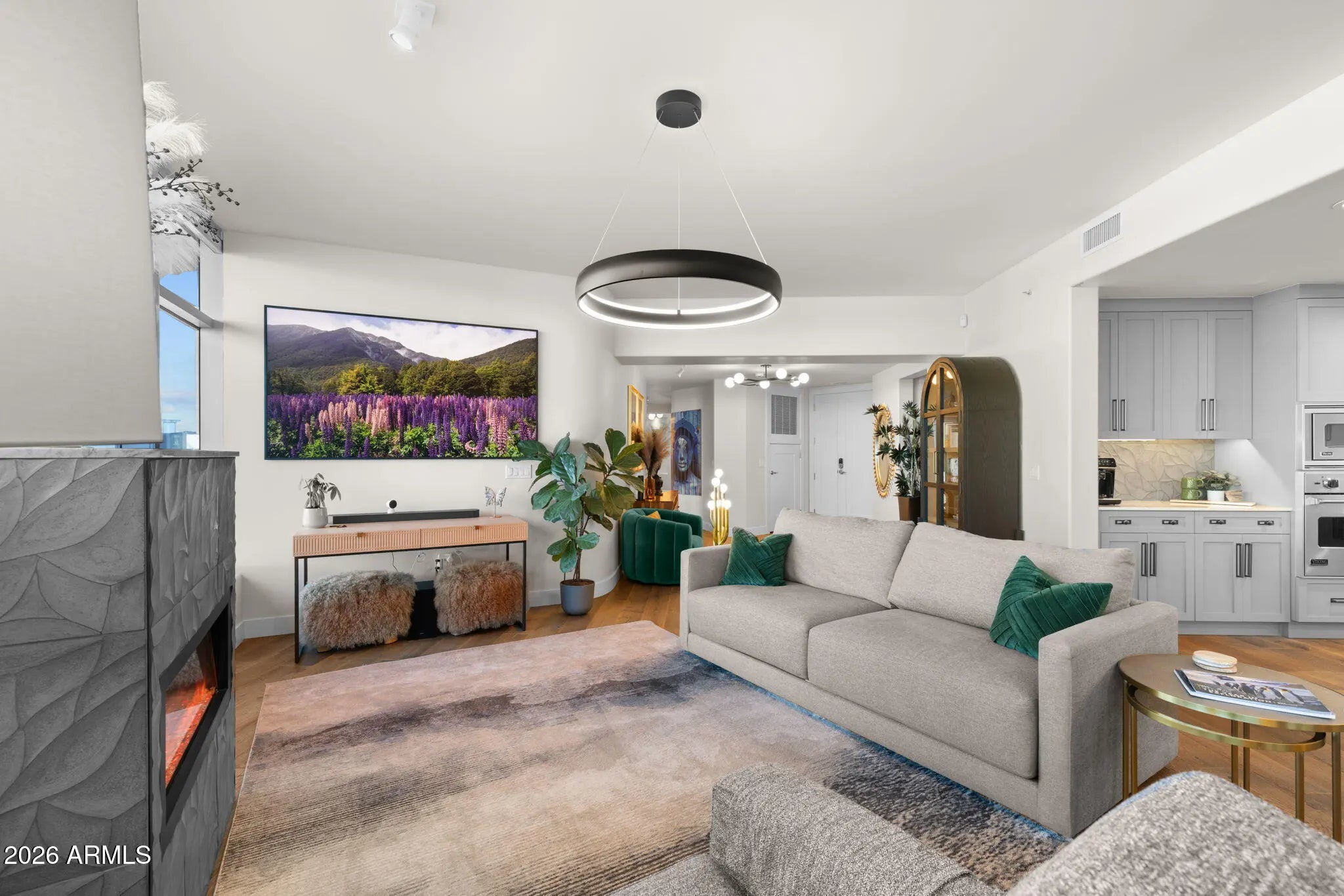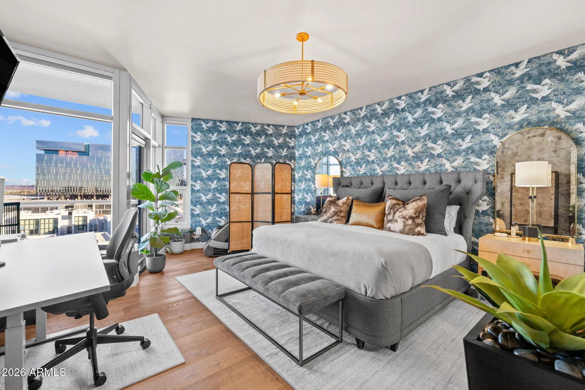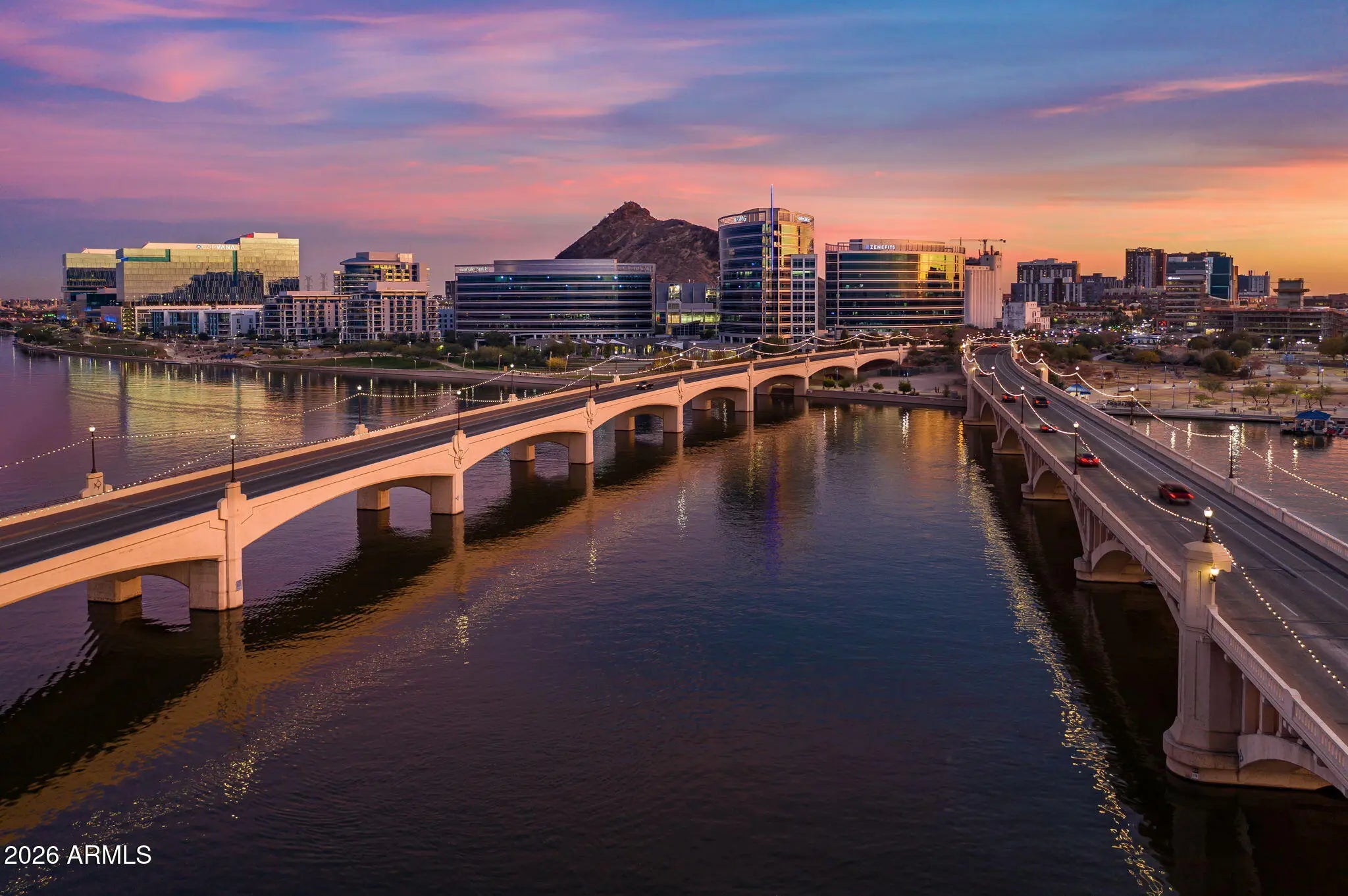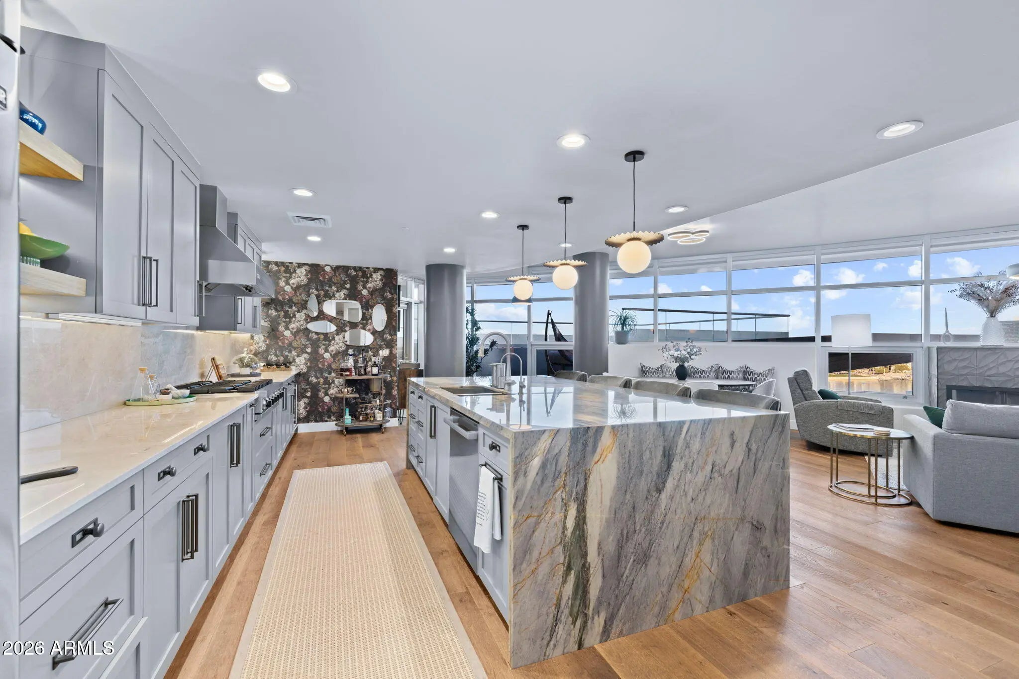 Fully remodeled luxury residence at Bridgeview at Hayden Ferry Lakeside, professionally interior designed with elevated finishes throughout. Duchateau Bracone wood flooring flows seamlessly through the home, creating a warm and sophisticated foundation. The chef's kitchen is a standout, featuring custom cabinetry, striking quartzite countertops, and refined finishes that blend beauty with functionality. Bathrooms have been completely reimagined into spa-like retreats with new vanities, Kohler sinks, Moen bidet toilets, glass-enclosed showers, including a steam shower in the primary suite, a Jacuzzi soaking tub, and a private in-unit sauna for an elevated wellness experience. Additional upgrades include a newly installed fireplace, designer lighting throughout, and brand-new AC units delivering true turnkey luxury. Bridgeview is known for its exceptional concrete and glass construction, offering superior sound insulation, expansive window walls, and a quiet, refined living environment. Residents enjoy resort-style amenities including 24/7 concierge service, heated pool and spa, state-of-the-art fitness center, media and club rooms, billiards, business center, secure underground parking, and climate-controlled storage. Ideally located just steps from Tempe Town Lake, Mill Avenue, ASU, and minutes from Sky Harbor International Airport, this is lock-and-leave luxury living at its finest.