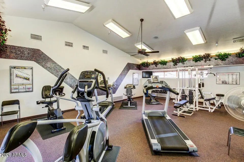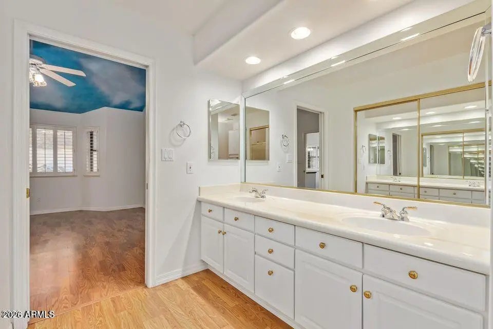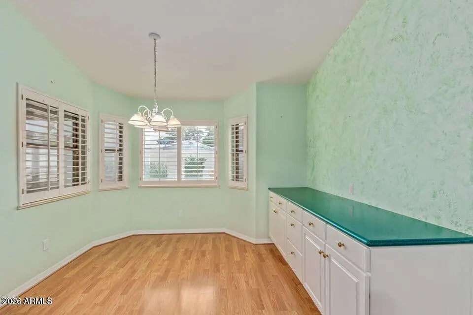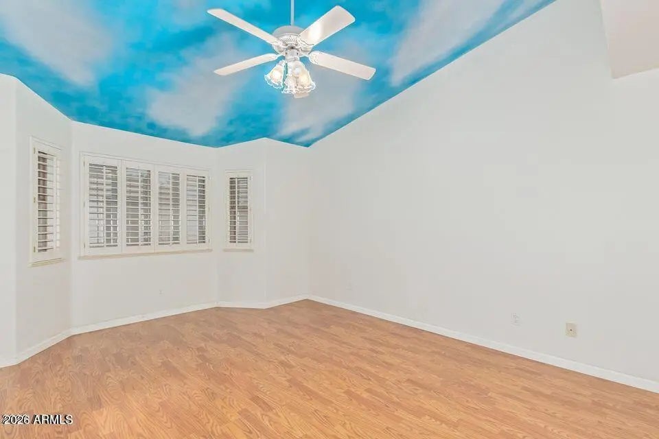 Welcome to Apache Wells 2 a much-desired gated community located in Northeast Mesa. This home is a 2-bedroom, 2-bath with a bonus den- perfect for a home office or guest space. The primary suite offers a walk-in closet and dual sink vanity. Enjoy a large open living room with vaulted ceilings and elegant wood shutters that fill the space with natural light and charm. Enjoy a large, north-facing covered back patio, perfect for hosting family gatherings and entertaining friends' year- round. The AC, Roof and outside of home was just update in the last 4 years!
