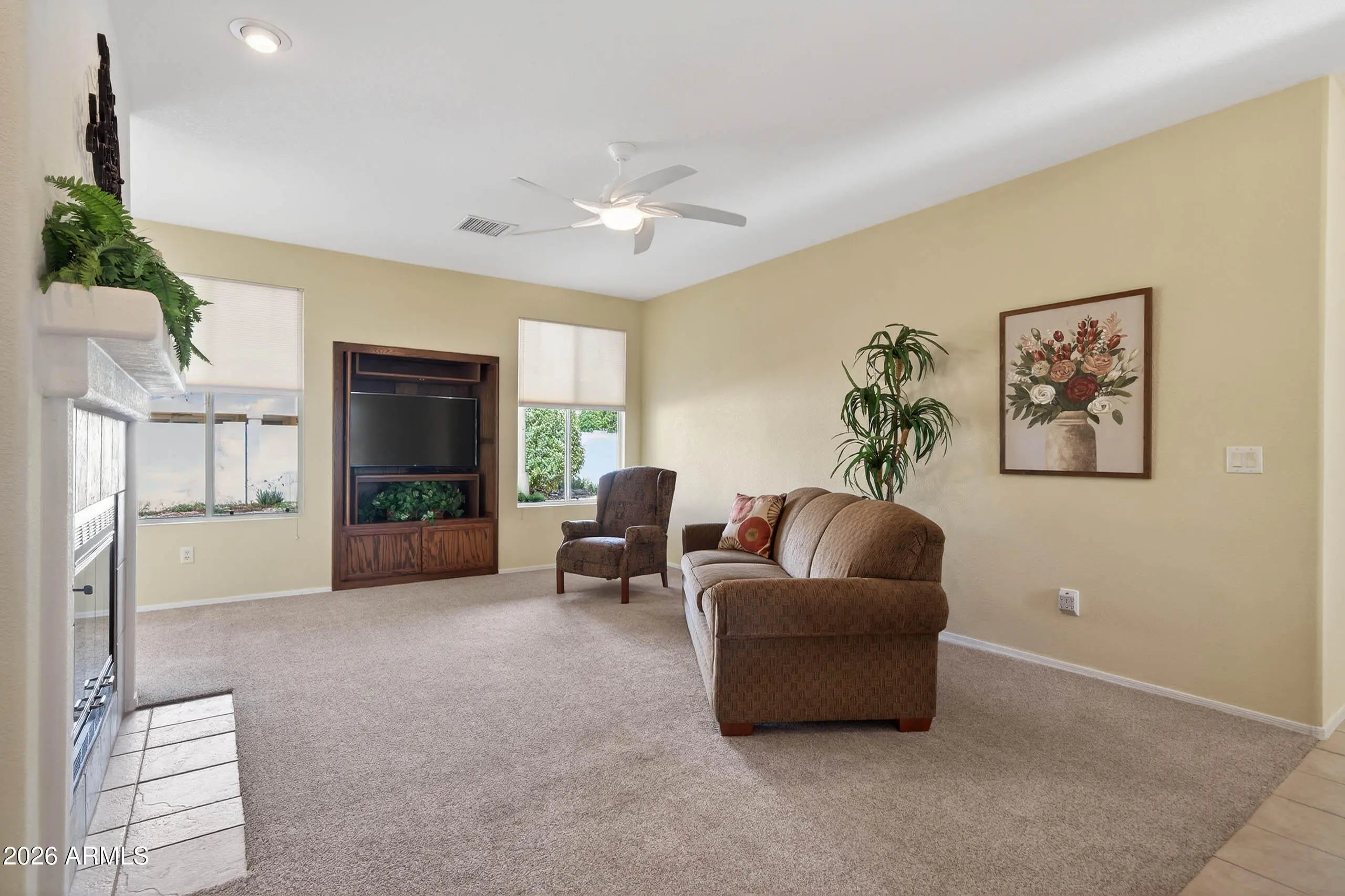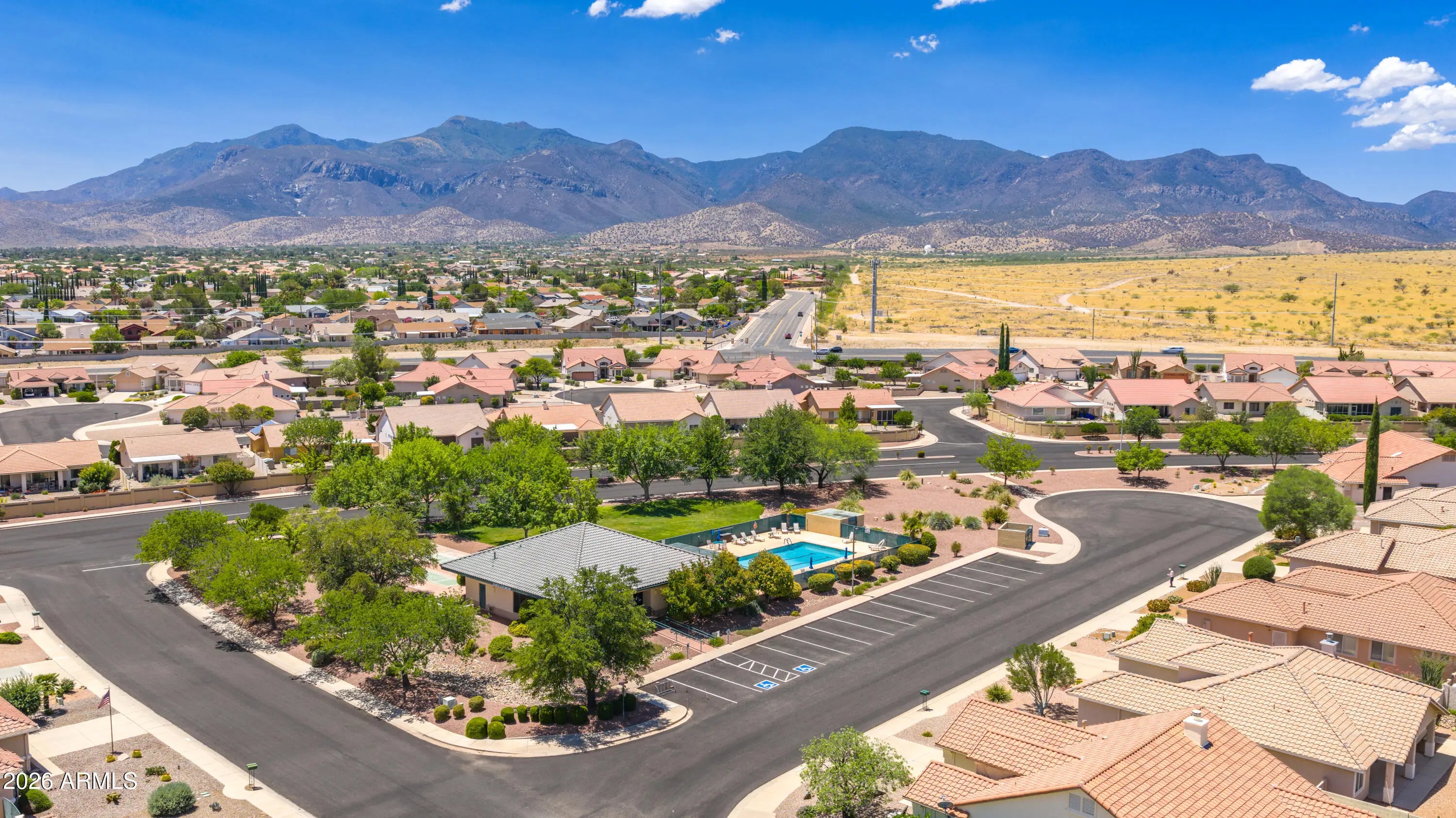 Cozy, but roomy 1,888+SF, 3BR/2BA/2CG home in desirable 55+ Winterhaven Retirement Community of Sierra Vista!!! Lots of wonderful features to include an extra BONUS room for your crafting, sewing, hide-away office, or whatever you desire (see floorplan in photos) , a built in solid wood entertainment center w/hidden doors, gas-log fireplace, lots of pantry space, garage w/built-in workbench, BONUS overflow parking at the REC Center across the street, and a quick WALK to that POOL!!! Private cul-de-sac street, wonderful mountain view from your front, spacious courtyard!!! Kitchen features all white appliances, breakfast bar, and flows from the Eat-in Kitchen Area to the Dining Room...Full-length, covered patio for your entertaining pleasure!!! Plus, Newer HVAC and Water Heater!