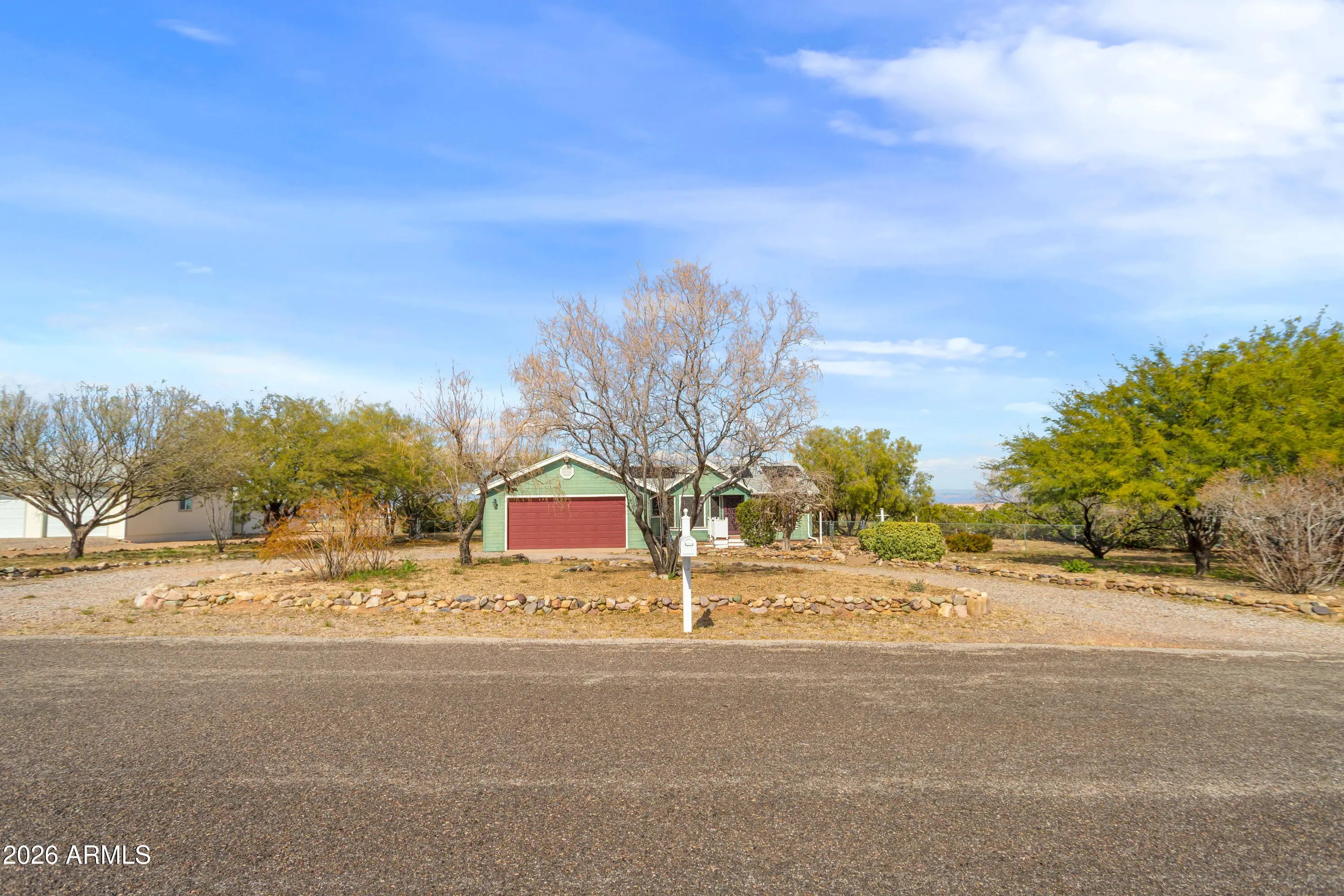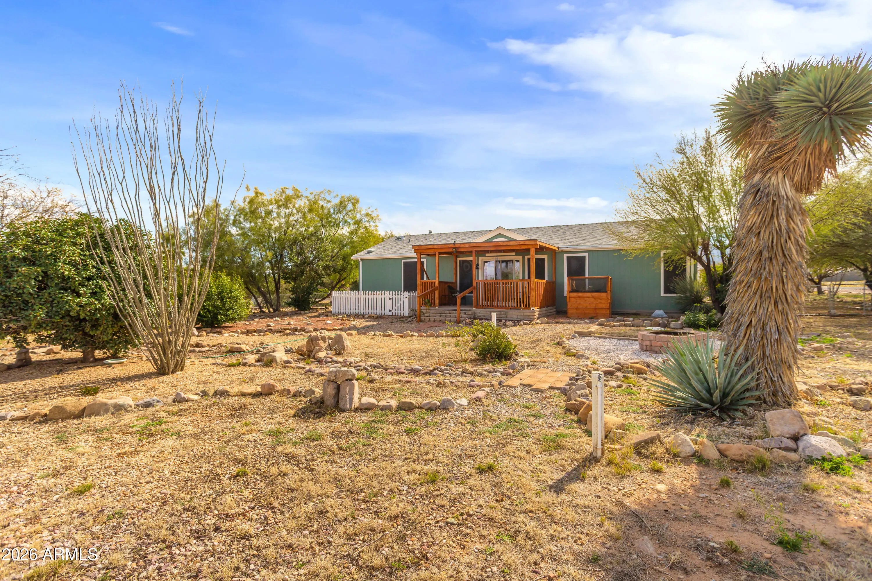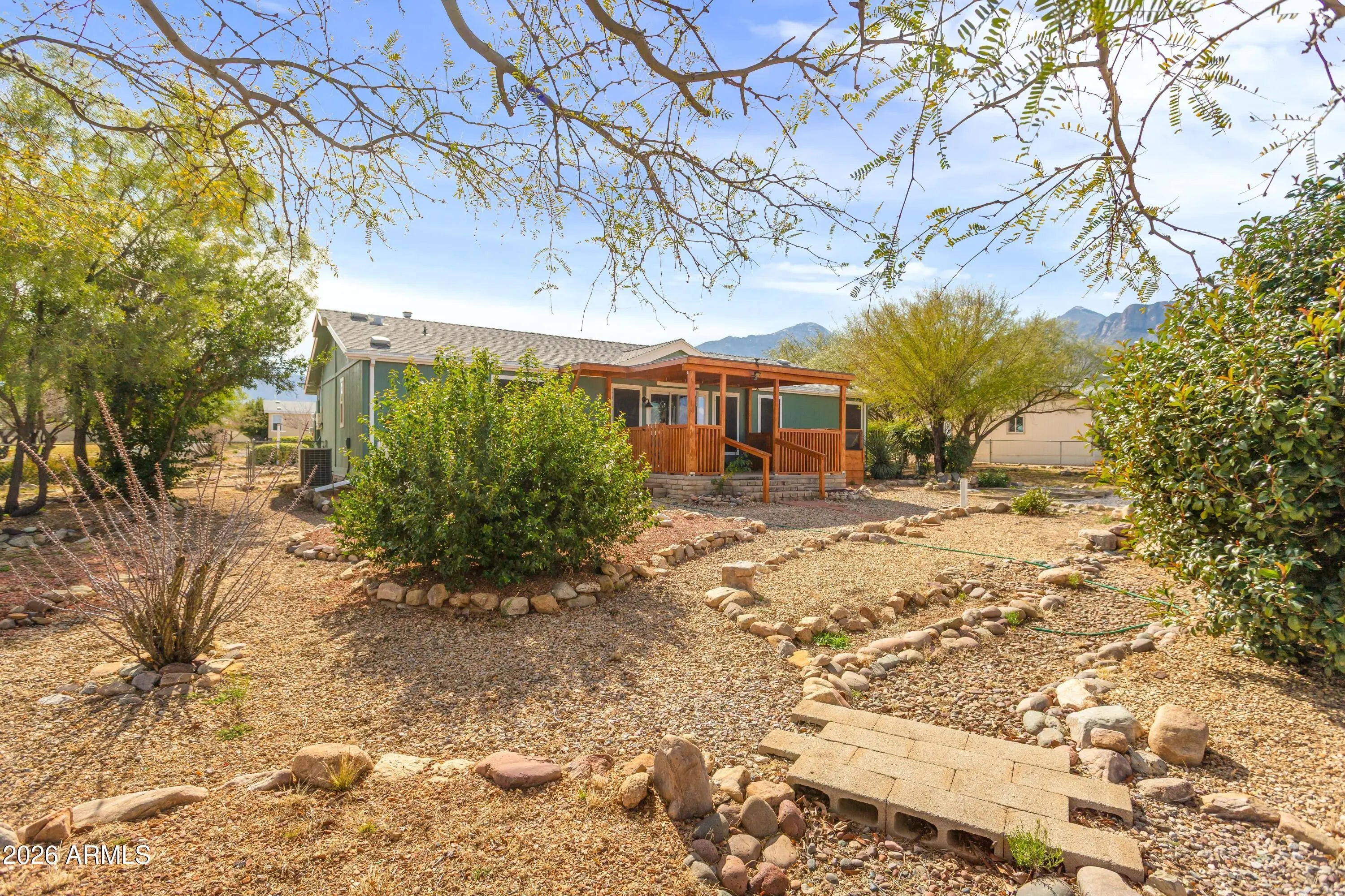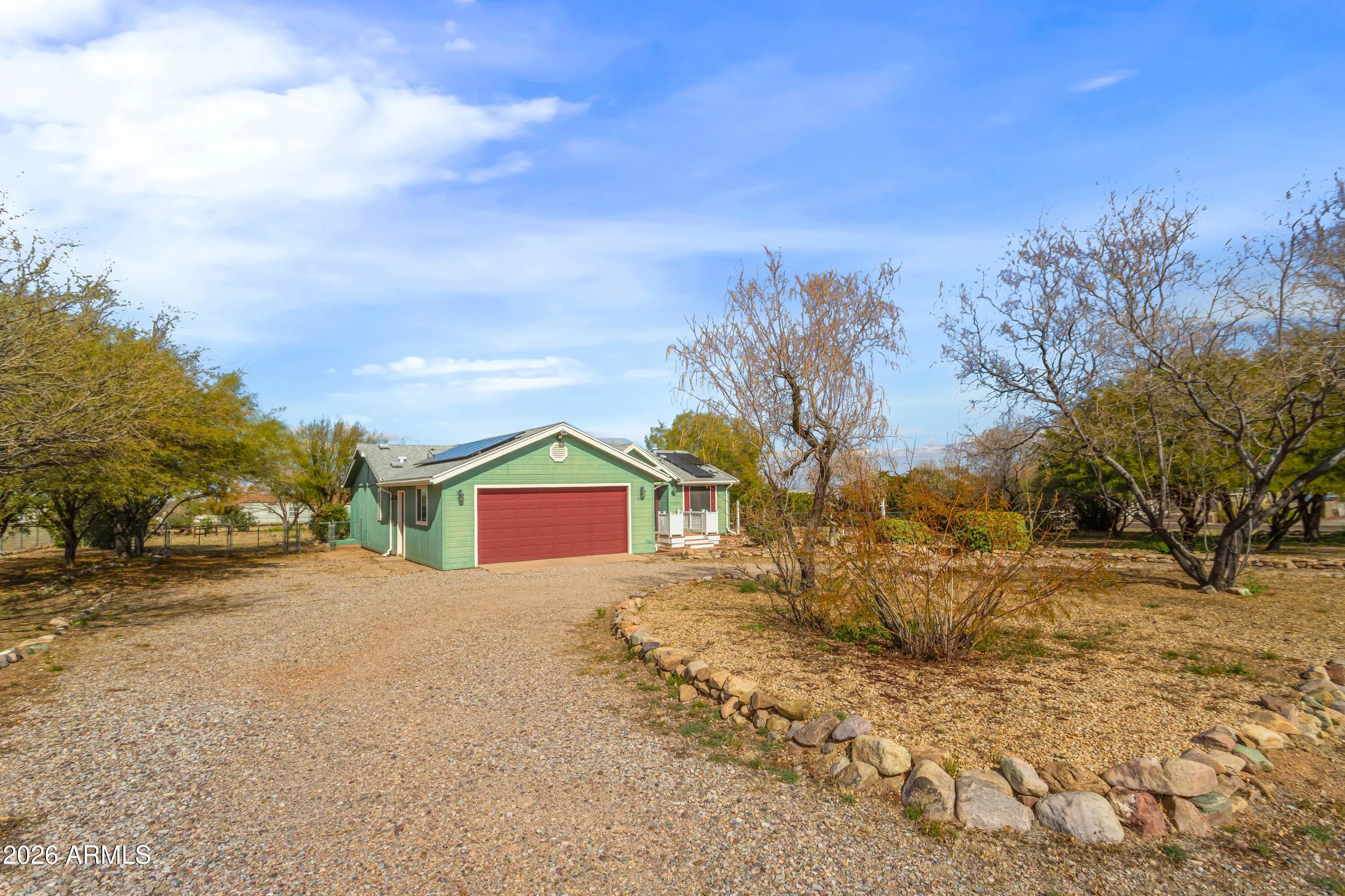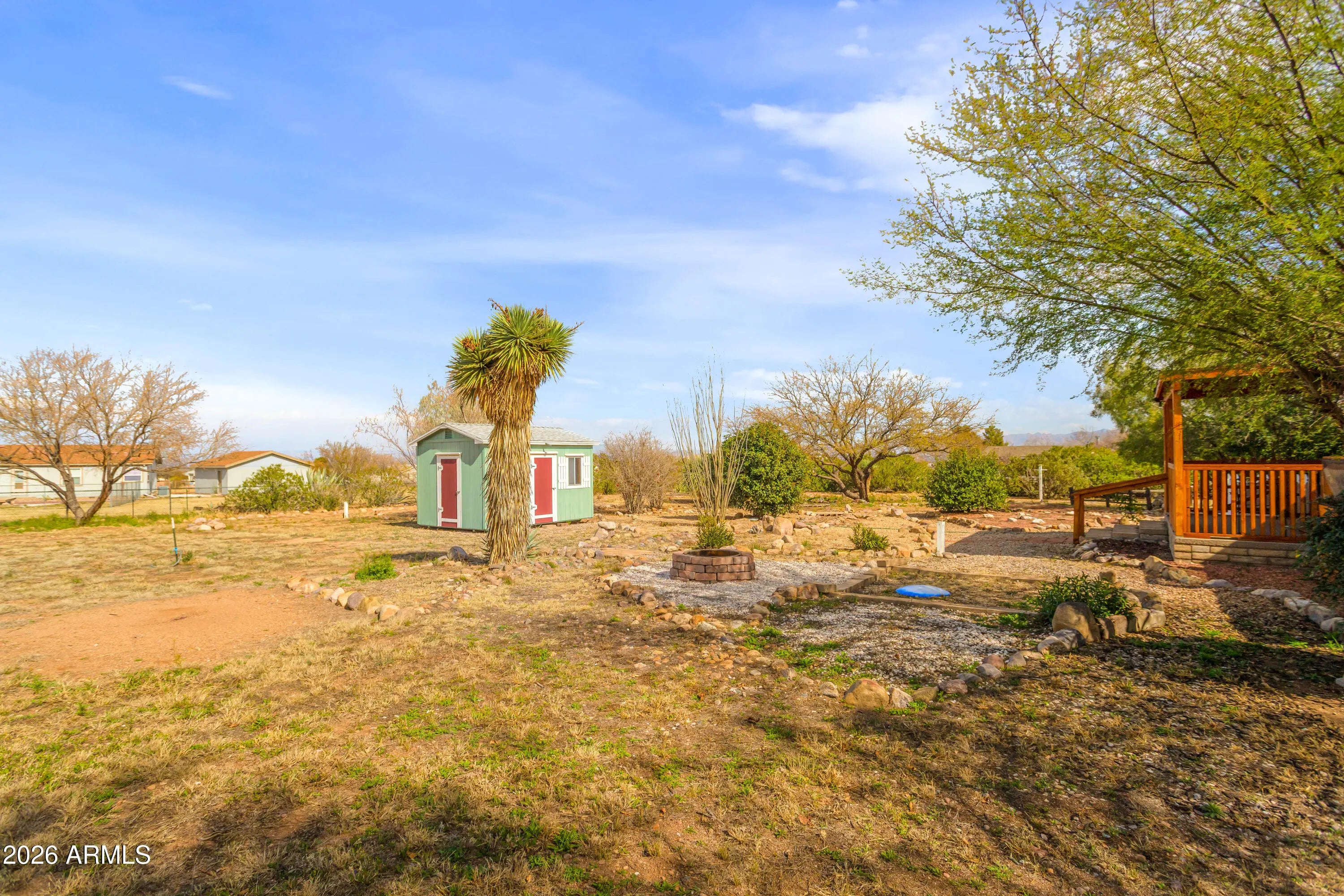 Welcome to this charming home on almost an acre in Hereford, AZ. Enjoy relaxing evenings on the patio deck, perfect for taking in breathtaking sunsets and quiet morning sunrises. Inside, you'll find an open floor plan with vaulted ceilings and a split primary bedroom for added privacy. The garage offers plenty of built-in storage, and the fully fenced corner lot features a storage shed and mature, producing pomegranate trees. The primary bathroom includes a step-in shower for accessibility. Solar panels are fully owned enjoy the low utility bills.