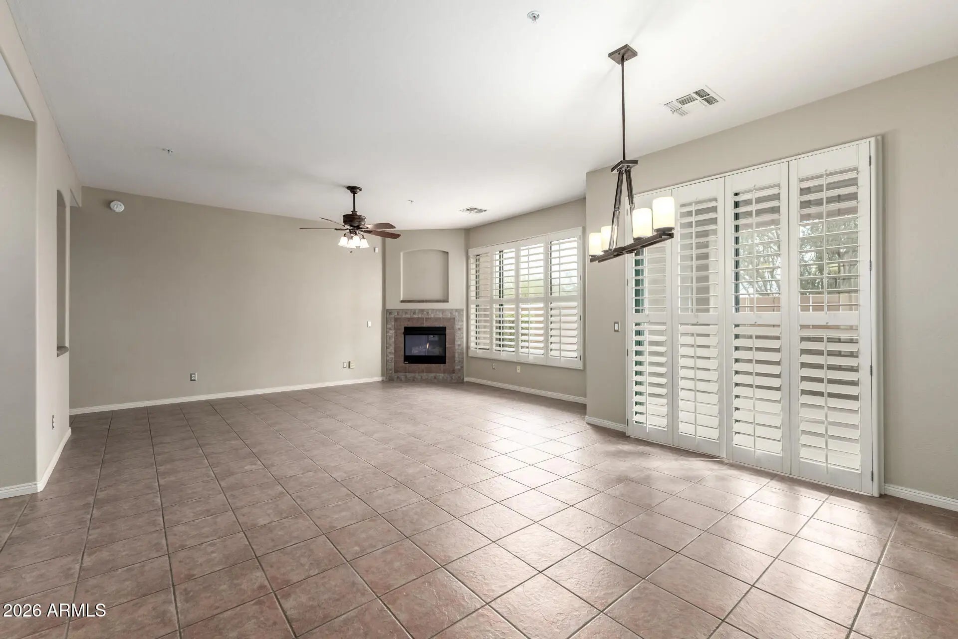 This 3-bedroom, 2-bath is located in the Cachet at Grayhawk community, within the guard-gated Talon Retreat. The home features a split floor plan and a preferred first-floor entry. Inside, the open layout includes a fireplace, tile flooring throughout, and a spacious living and dining area. The eat-in kitchen offers ample cabinet storage and functional workspace. Both the living area and the primary bedroom open to private patio spaces, providing convenient indoor-outdoor access. Additional features include an oversized two-car garage with built-in cabinets for added storage. Cachet residents enjoy access to a private clubhouse with a heated pool and spa, fitness facilities, and tennis courts! Grayhawk offers an active, social community with year-round programming and events designed for both families and retirees. Ranging from wellness and social events to family-friendly gatherings, there is something for everyone!