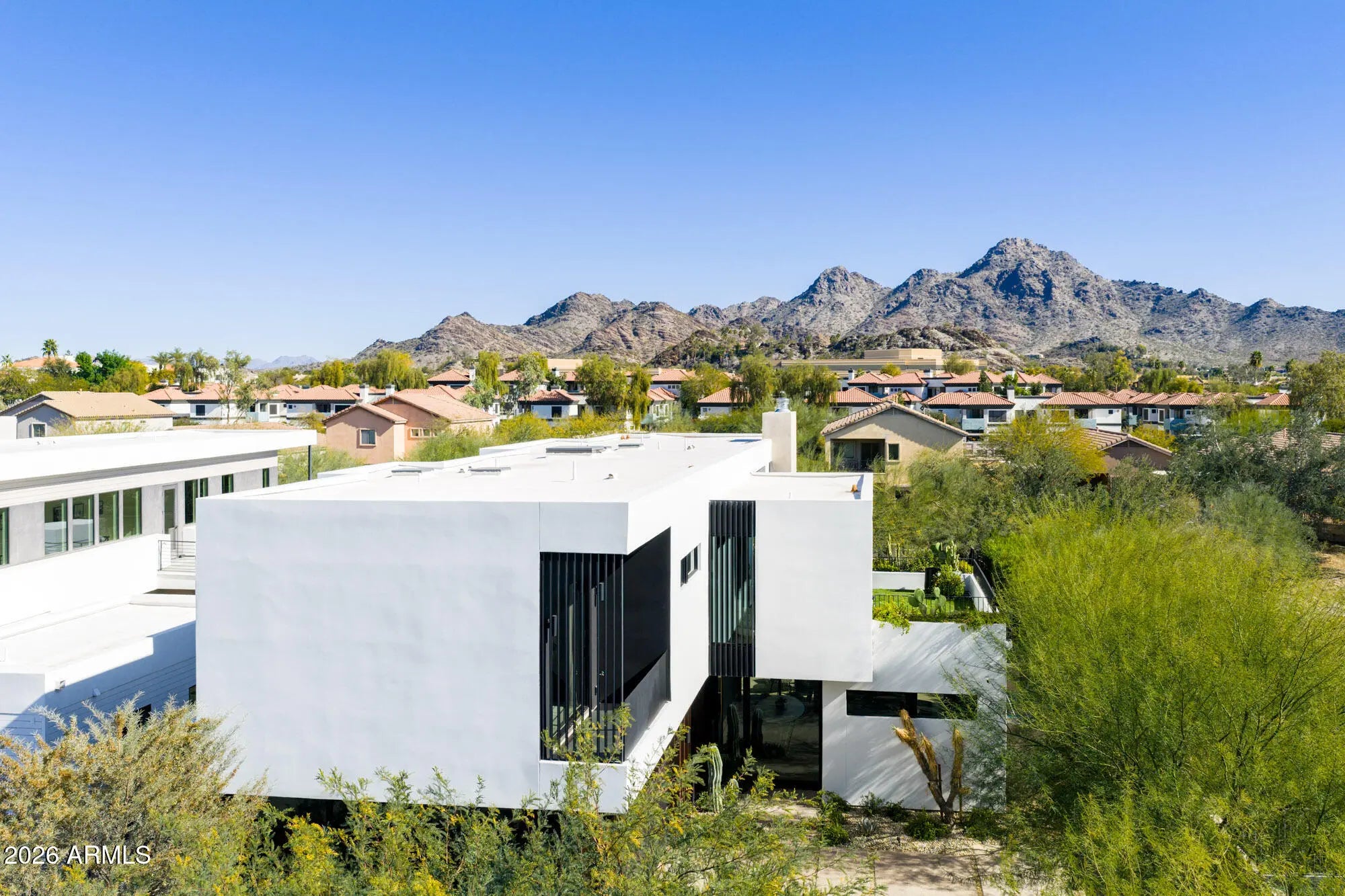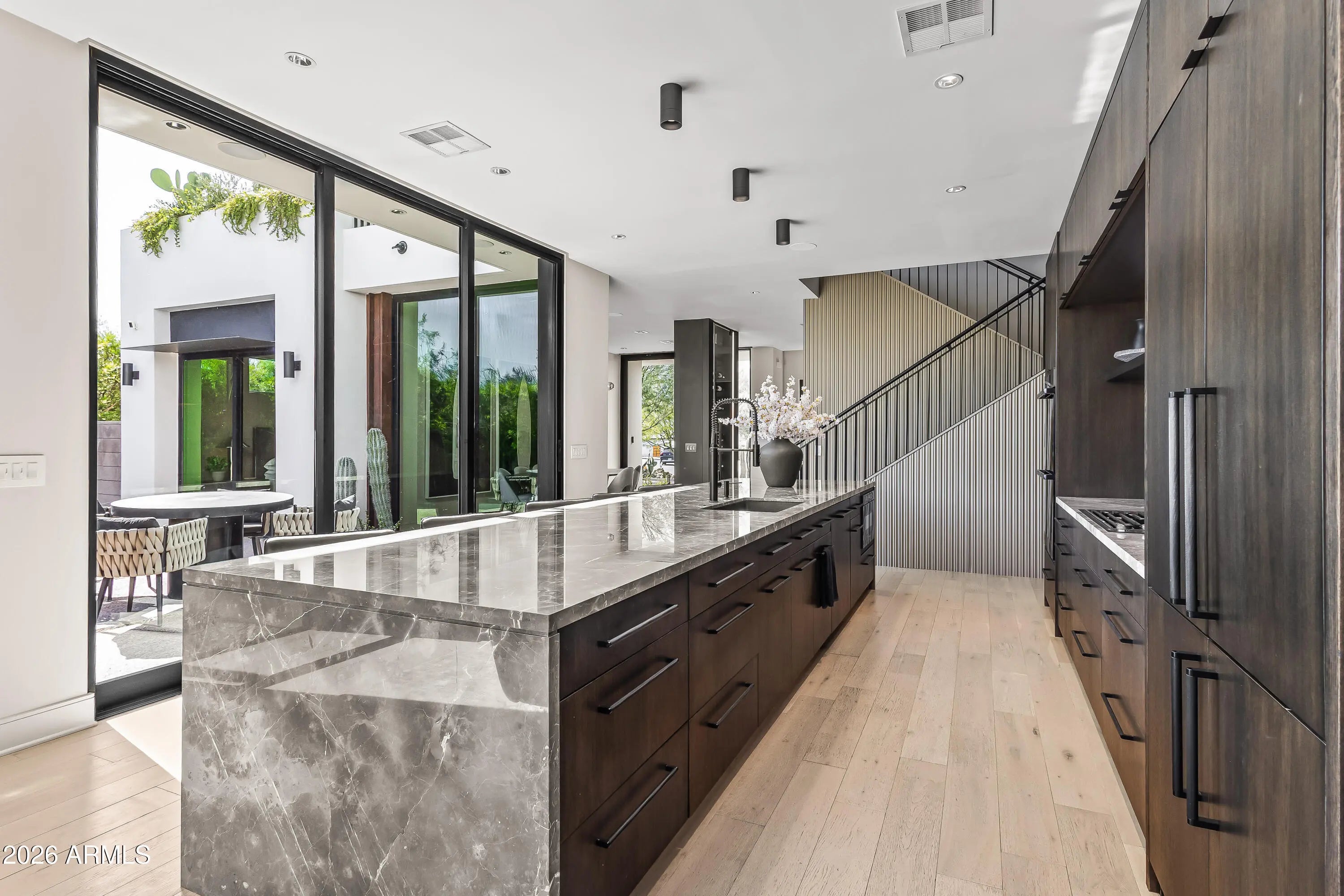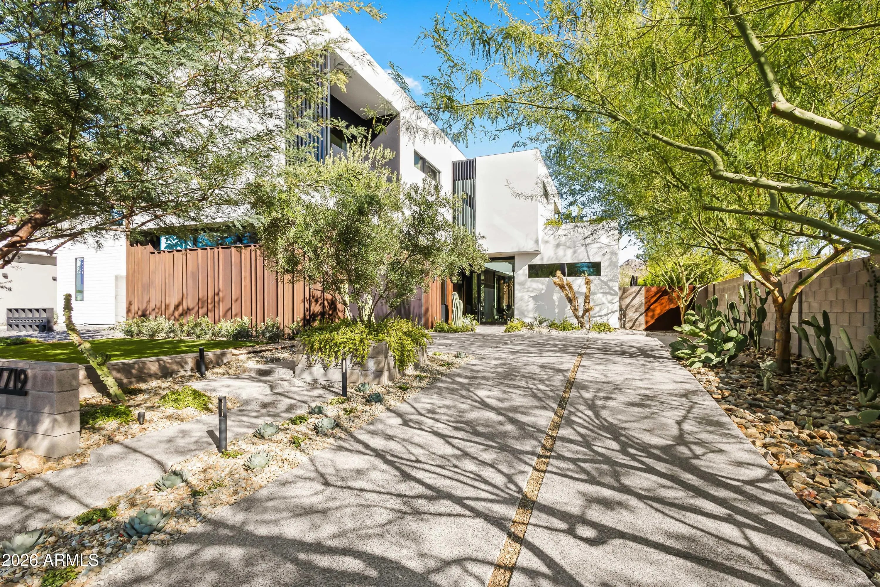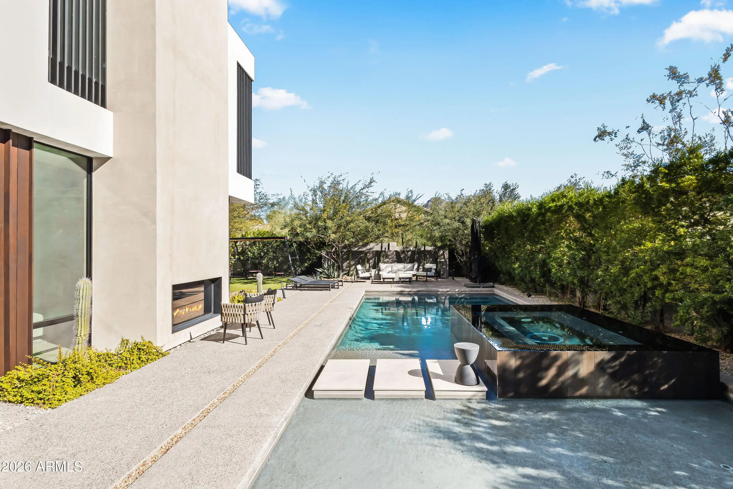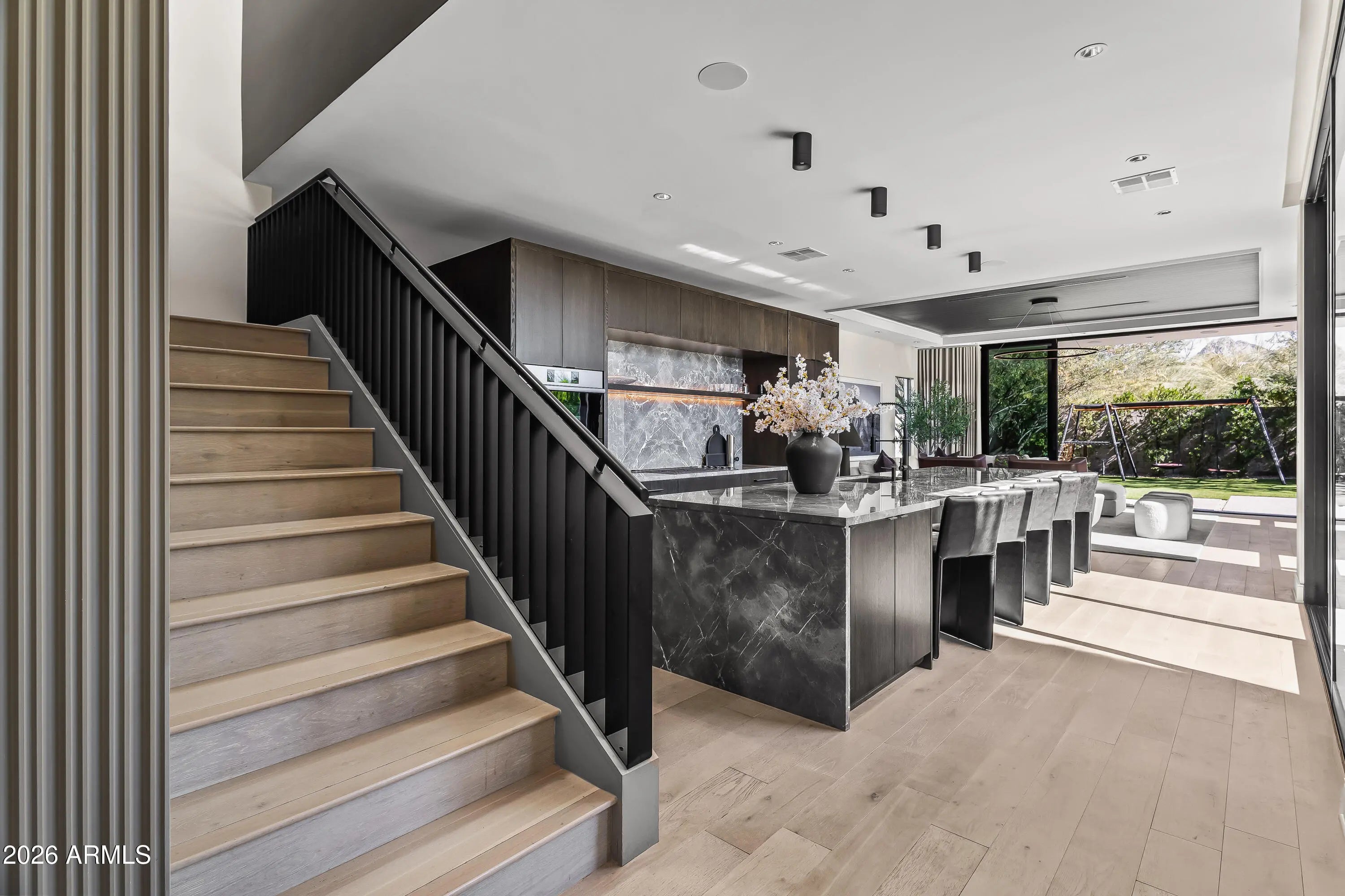 Featured in Phoenix Home and Garden and Phoenix Magazine, experience refined contemporary living in this stunning modern residence in Central Phoenix. Designed for seamless indoor-outdoor living, this architecturally striking home showcases clean lines, expansive glass, and thoughtfully curated lighting and finishes throughout. The main living area is anchored by a dramatic fireplace and enhanced by a paneled ceiling and a full wall of sliding glass doors, flooding the space with natural light and opening to the resort-style backyard. The open-concept kitchen is both elegant and functional, featuring custom cabinetry, high-end appliances, a generous center island, butler's pantry, formal dining area, and a chilled glass wine refrigerator—ideal for entertaining. Multiple glass sliders further enhance the home's effortless indoor-outdoor flow. A dedicated office with glass doors and built-in cabinetry offers a stylish and private workspace. The primary suite serves as a true retreat, complete with a wall of sliders, private balcony, and spa-inspired bath featuring a walk-in closet, dual vanities, oversized shower, freestanding soaking tub, and private water closet. Upstairs, a versatile bonus family room provides flexible space for a playroom, second office, or fitness area. Enjoy mountain views, multiple balconies, and a variety of covered and uncovered outdoor living spaces designed for year-round enjoyment. The private backyard is an entertainer's dream, highlighted by a heated custom pool and spa, outdoor fireplace, mature landscaping for privacy, and beautifully designed desert landscaping. Ideally located just minutes from the Biltmore area, downtown Phoenix, and some of Arizona's top hiking, resorts, spas, shopping, and dining, this exceptional home offers modern luxury, comfort, and an unbeatable lifestyle.