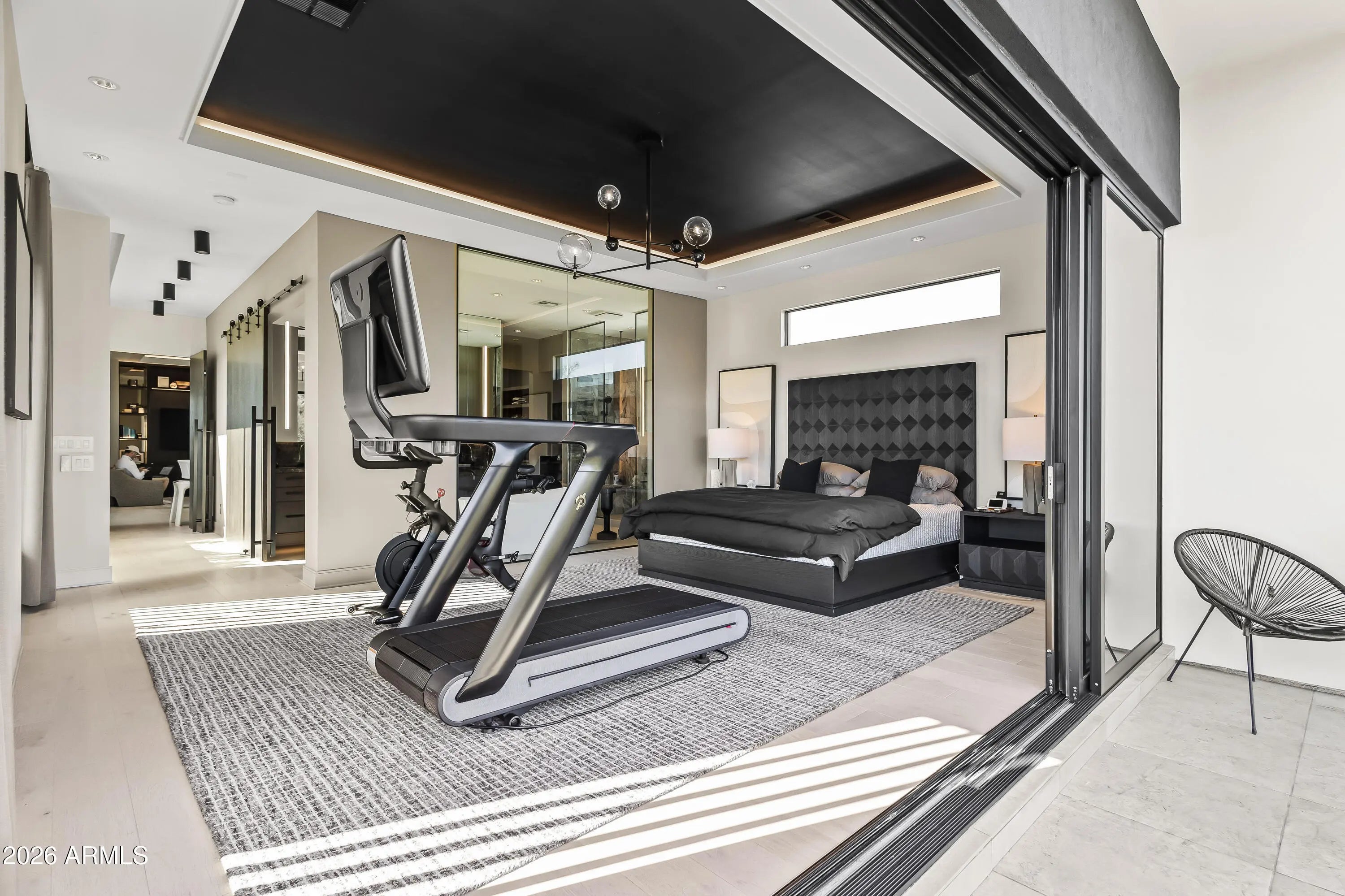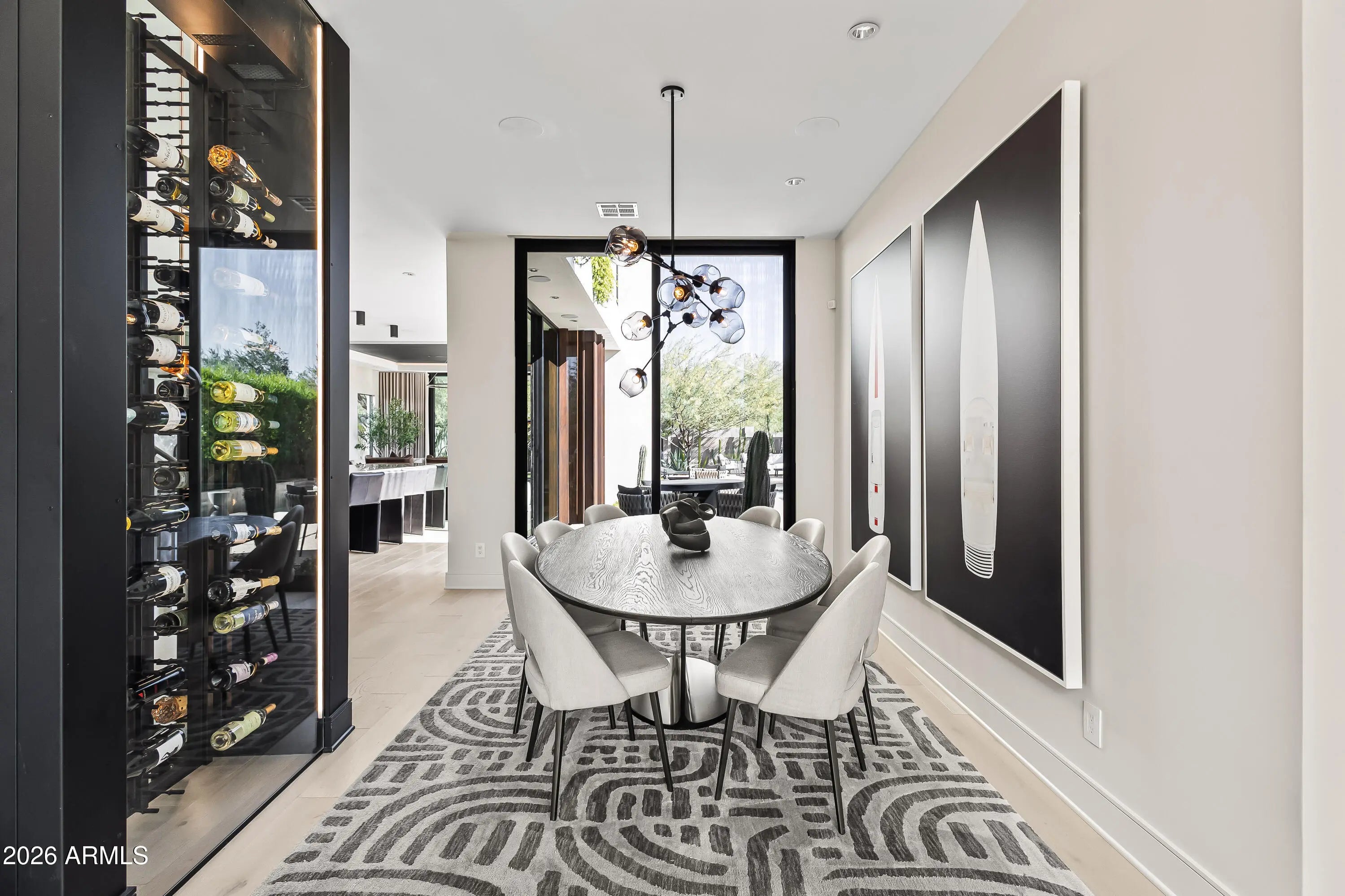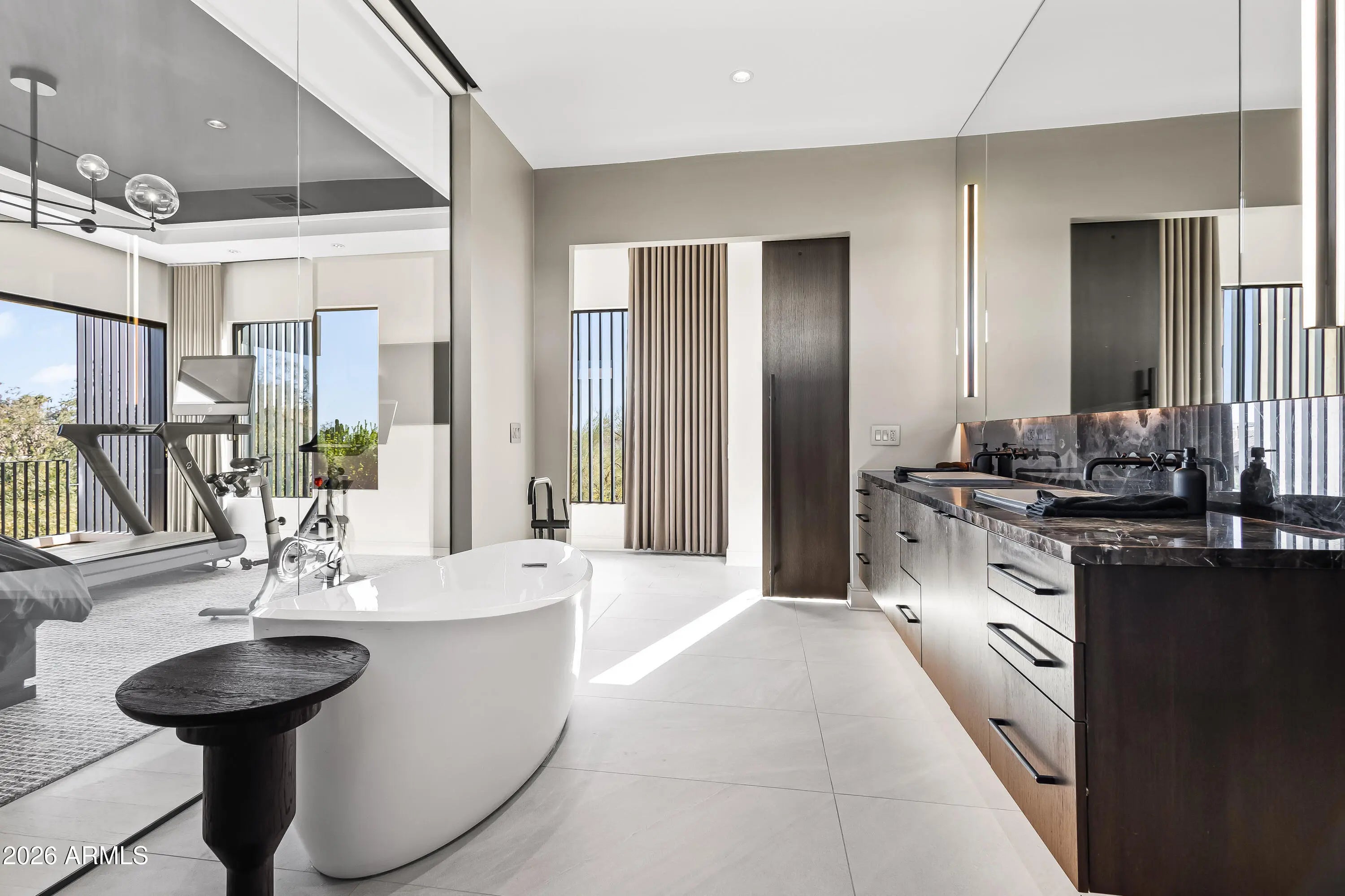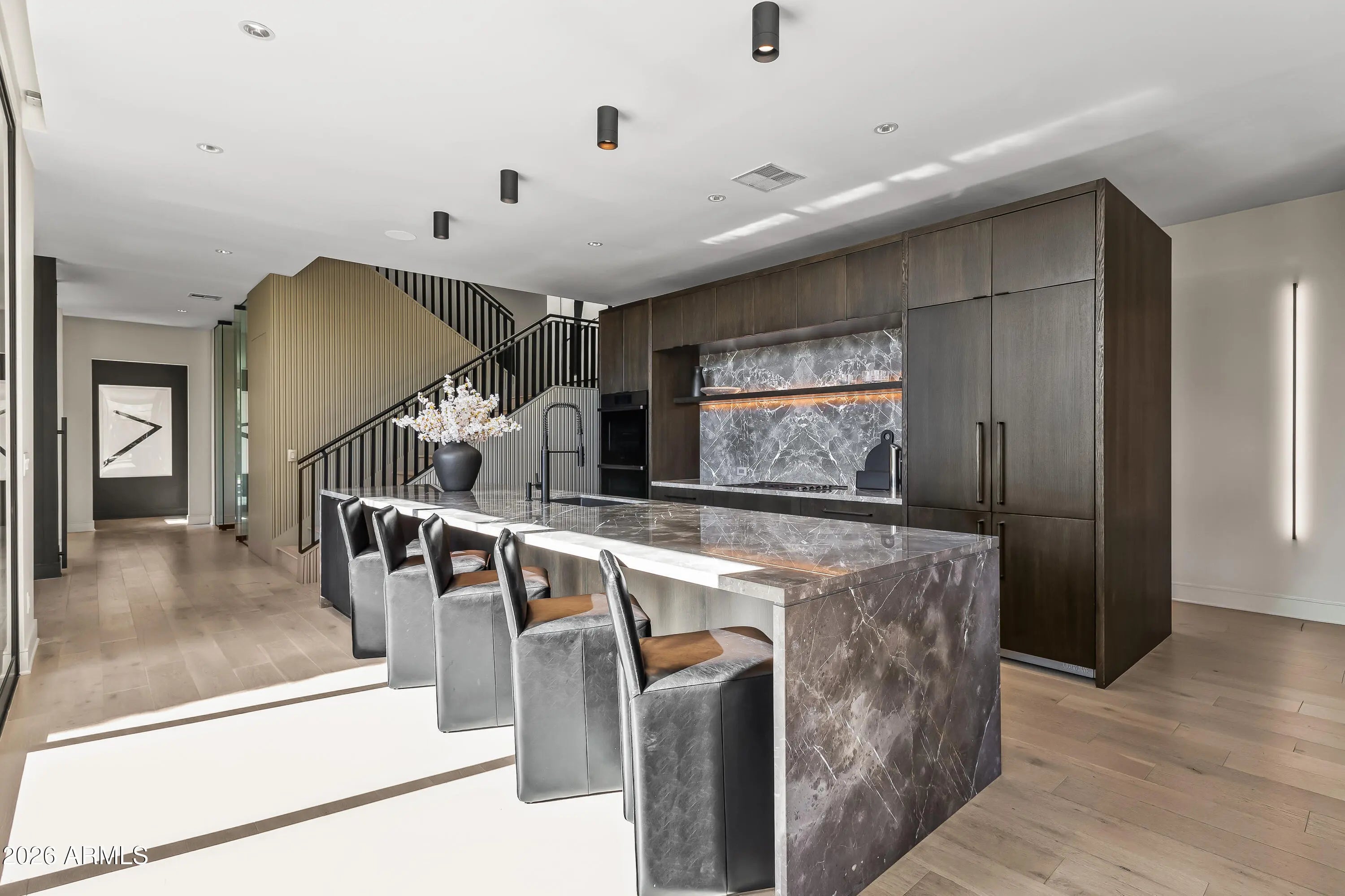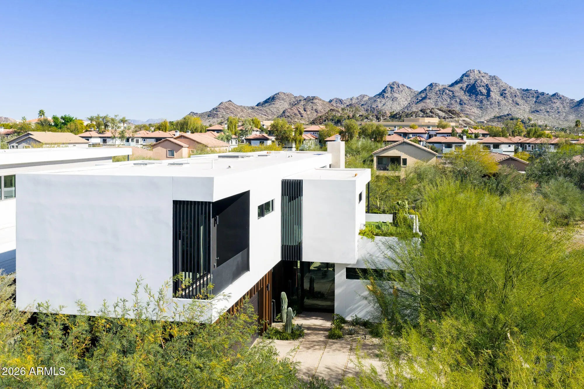 Featured in Phoenix Home and Garden and Phoenix Magazine, experience refined contemporary living in this stunning modern residence in Central Phoenix. Designed for seamless indoor-outdoor living, this architecturally striking home showcases clean lines, expansive glass, and thoughtfully curated lighting and finishes throughout. The main living area is anchored by a dramatic fireplace and enhanced by a paneled ceiling and a full wall of sliding glass doors, flooding the space with natural light and opening to the resort-style backyard. The open-concept kitchen is both elegant and functional, featuring custom cabinetry, high-end appliances, a generous center island, butler's pantry, formal dining area, and a chilled glass wine refrigerator—ideal for entertaining. Multiple glass sliders further enhance the home's effortless indoor-outdoor flow. A dedicated office with glass doors and built-in cabinetry offers a stylish and private workspace. The primary suite serves as a true retreat, complete with a wall of sliders, private balcony, and spa-inspired bath featuring a walk-in closet, dual vanities, oversized shower, freestanding soaking tub, and private water closet. Upstairs, a versatile bonus family room provides flexible space for a playroom, second office, or fitness area. Enjoy mountain views, multiple balconies, and a variety of covered and uncovered outdoor living spaces designed for year-round enjoyment. The private backyard is an entertainer's dream, highlighted by a heated custom pool and spa, outdoor fireplace, mature landscaping for privacy, and beautifully designed desert landscaping. Ideally located just minutes from the Biltmore area, downtown Phoenix, and some of Arizona's top hiking, resorts, spas, shopping, and dining, this exceptional home offers modern luxury, comfort, and an unbeatable lifestyle.