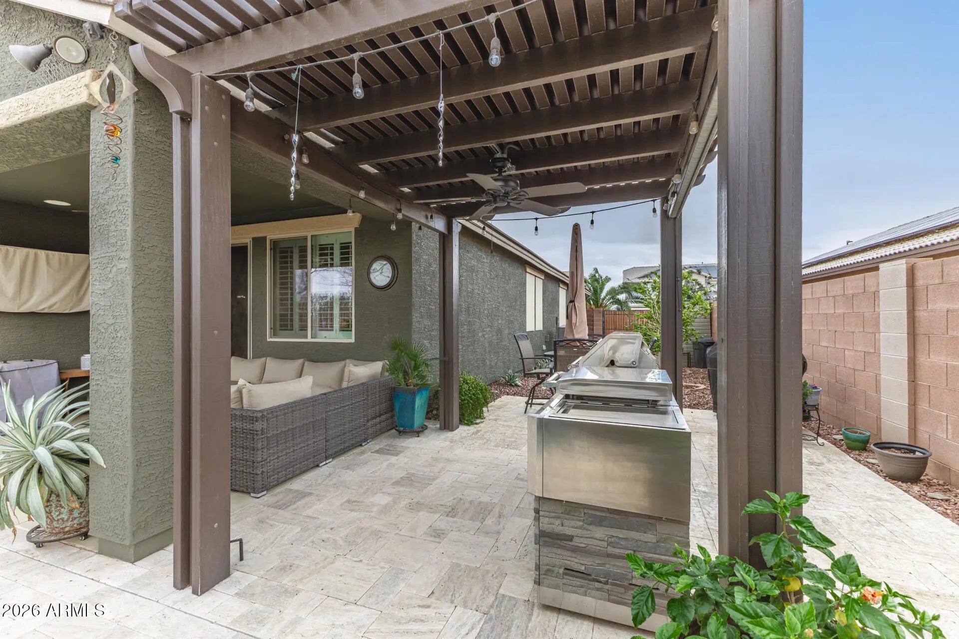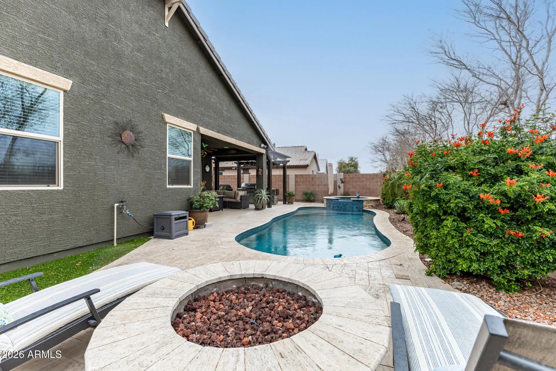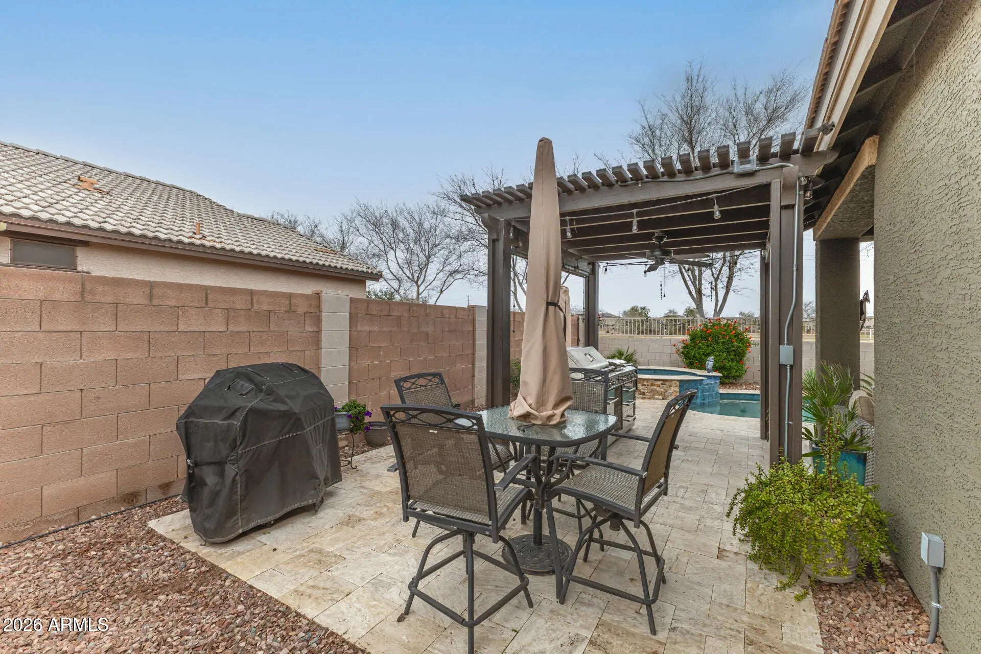 Pride of ownership everywhere you look in this beautifully maintained home that shows like a model. The signature of this home is the resort style backyard with pool, spa, and a pergola patio with a built-in barbeque station. Home backs up to a huge greenbelt with view fencing so your backyard feels spacious and private with no neighbors behind you. This is Arizona outdoor living at its best. Inside you'll find tiled floors, granite countertops, stainless steel appliances, and all the upgrades you would want and expect. Don't miss out on this gem of a property.