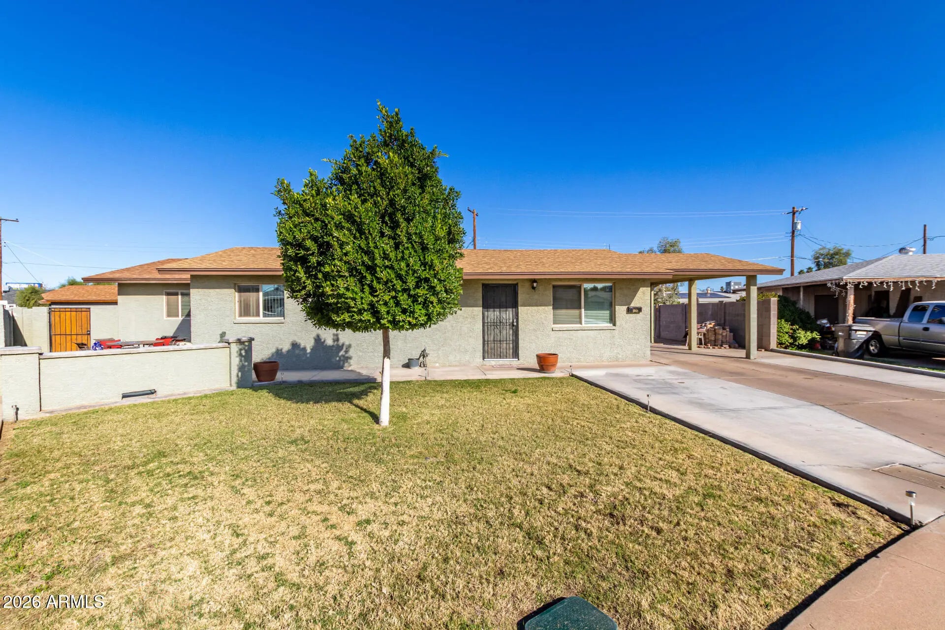 Adorable single-level home offering a convenient carport and a warm, welcoming vibe throughout! Vaulted ceilings and tile floors enhance the bright living room, creating an ideal space to relax or entertain. The chic kitchen shines with stainless steel appliances, crisp white cabinetry, a center island with breakfast bar, gleaming granite counters, and a handy pantry perfect for everyday living. Unwind in the spacious primary bedroom featuring a cozy sitting area, walk-in closet, and a chic ensuite. Out back, enjoy a covered patio and plenty of room to design your dream outdoor oasis, whether that's a pool, garden, or entertaining space. This inviting property is full of potential. Don't let it slip away!