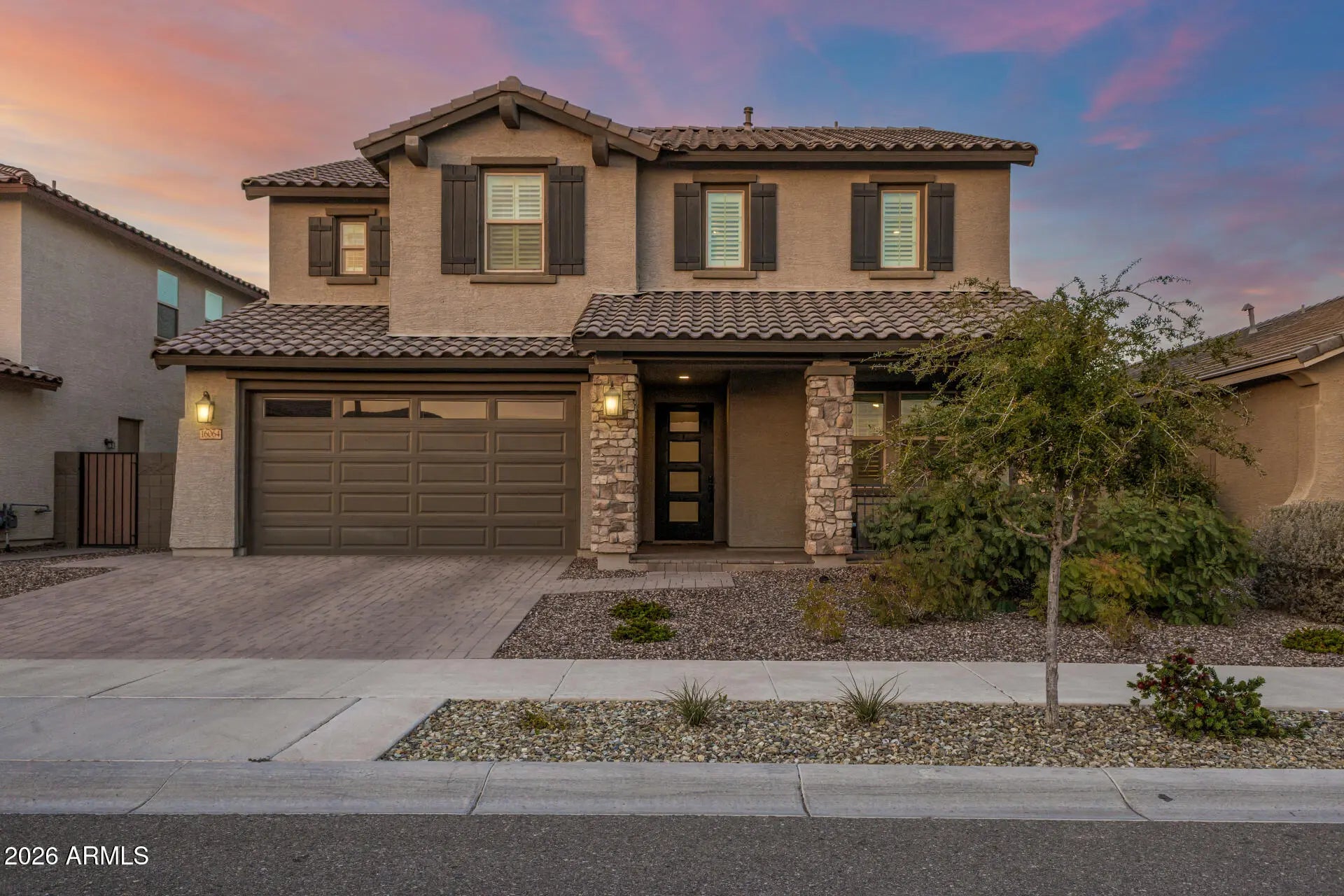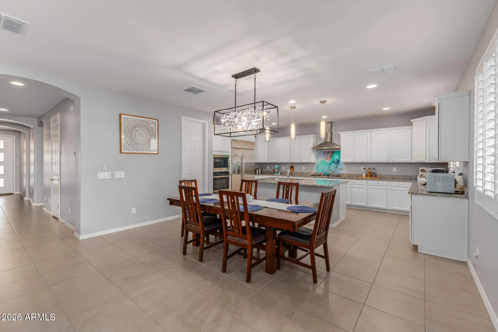 This stunning, highly upgraded Fulton home is THE ONE! Upon entry, you'll be welcomed by generous living spaces ideal for both entertaining and everyday comfort, featuring tile flooring, carpet in all the right places, recessed lighting, plantation shutters, arched passageways, and a stylish neutral color palette throughout. The chef's kitchen is a true showstopper, complete with GE Signature Series stainless steel appliances, including a 36'' gas cooktop, 48'' built-in smart refrigerator, built-in oven and microwave, and a 36'' vent hood. The space is further enhanced by elegant pendant lighting, staggered cabinetry with custom crown molding, granite countertops, and an oversized island with a breakfast bar—perfect for casual dining and gathering. The serene primary retreat offers a relaxing escape with a spacious walk-in closet and an ensuite bathroom featuring an oversized dual-sink vanity, soaking tub, and enclosed shower. Additional highlights include a generously sized second bedroom with its own ensuite bathroom, a third bedroom conveniently located on the first floor, two additional bedrooms upstairs, and three bonus roomsideal for a home office, gym, hobby space, or gaming room. Energy-efficient upgrades include Energy Star appliances, a tankless hot water heater, reverse osmosis system, water softener, and upgraded insulation throughout. Step outside and enjoy weekend grilling and peaceful evenings in the beautifully designed backyard, featuring a covered patio with a gas hookup for your grill, ample seating space, raised garden beds, citrus trees, well-laid pavers, and low-maintenance artificial turf. Located in the highly desirable Escalante community, residents enjoy an abundance of amenities including basketball and pickleball courts, sand volleyball, bocce ball, cornhole, an 18-hole disc golf course, a community aquatic center with water features, multiple playgrounds, winding walking trails, green spaces, and ramadas. Conveniently situated near the Wildlife World Zoo, Aquarium & Safari Park, and just a short drive to the White Tank Mountains with scenic hiking trails and Lake Pleasant. This exceptional home is truly a must-see!
