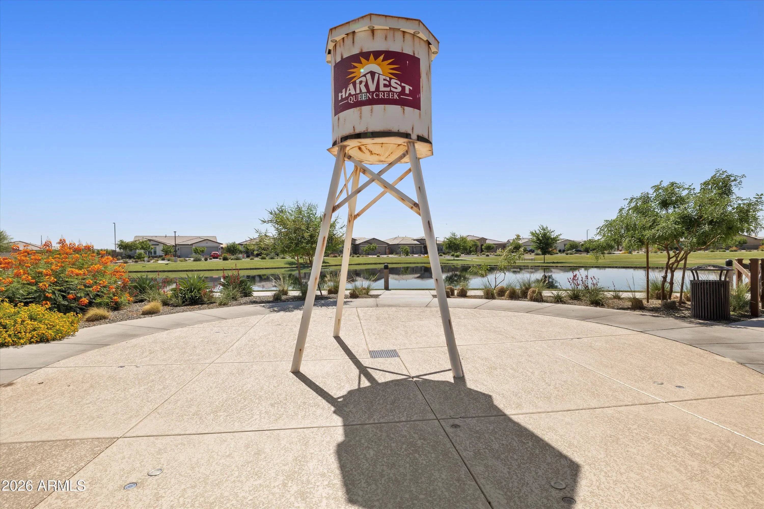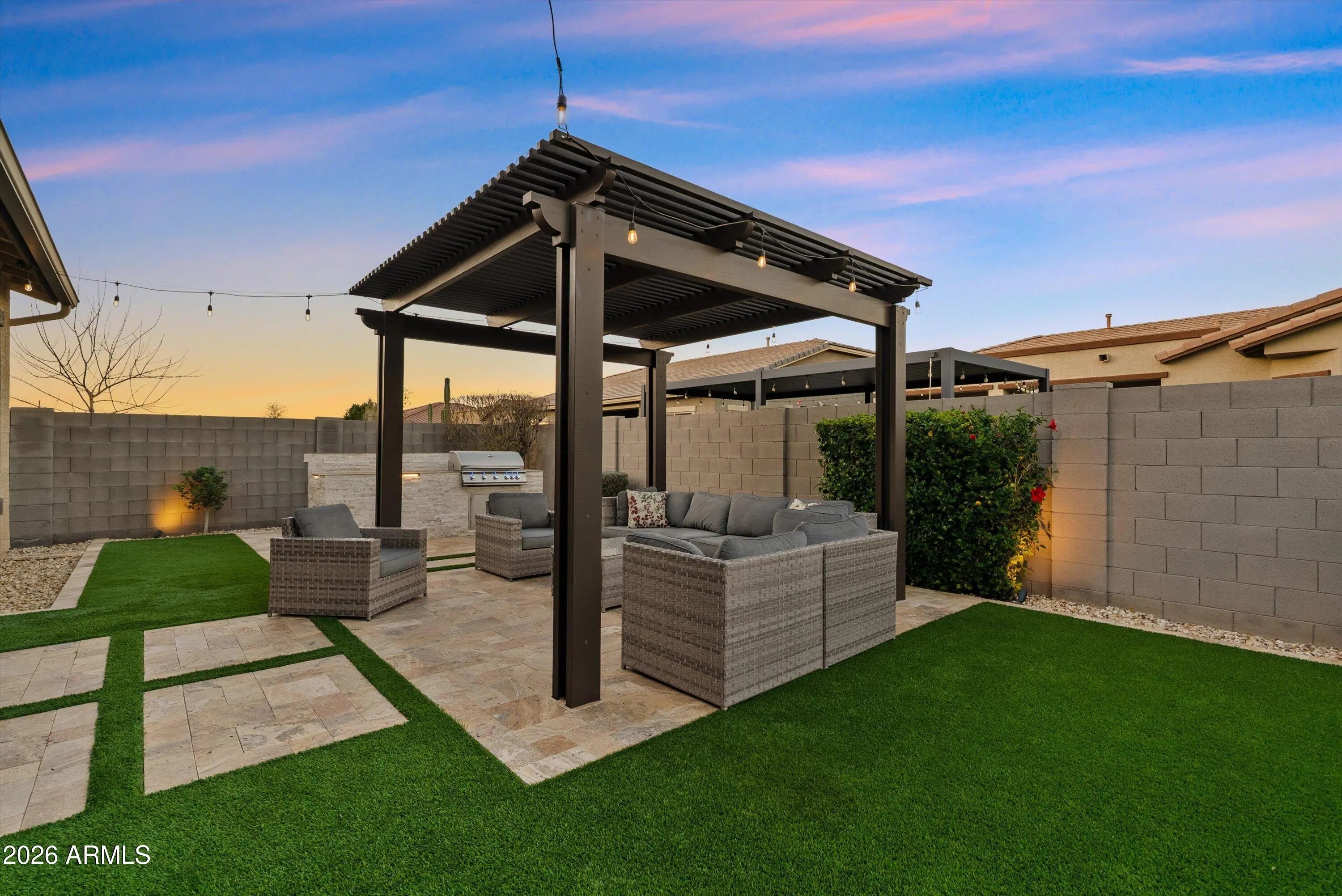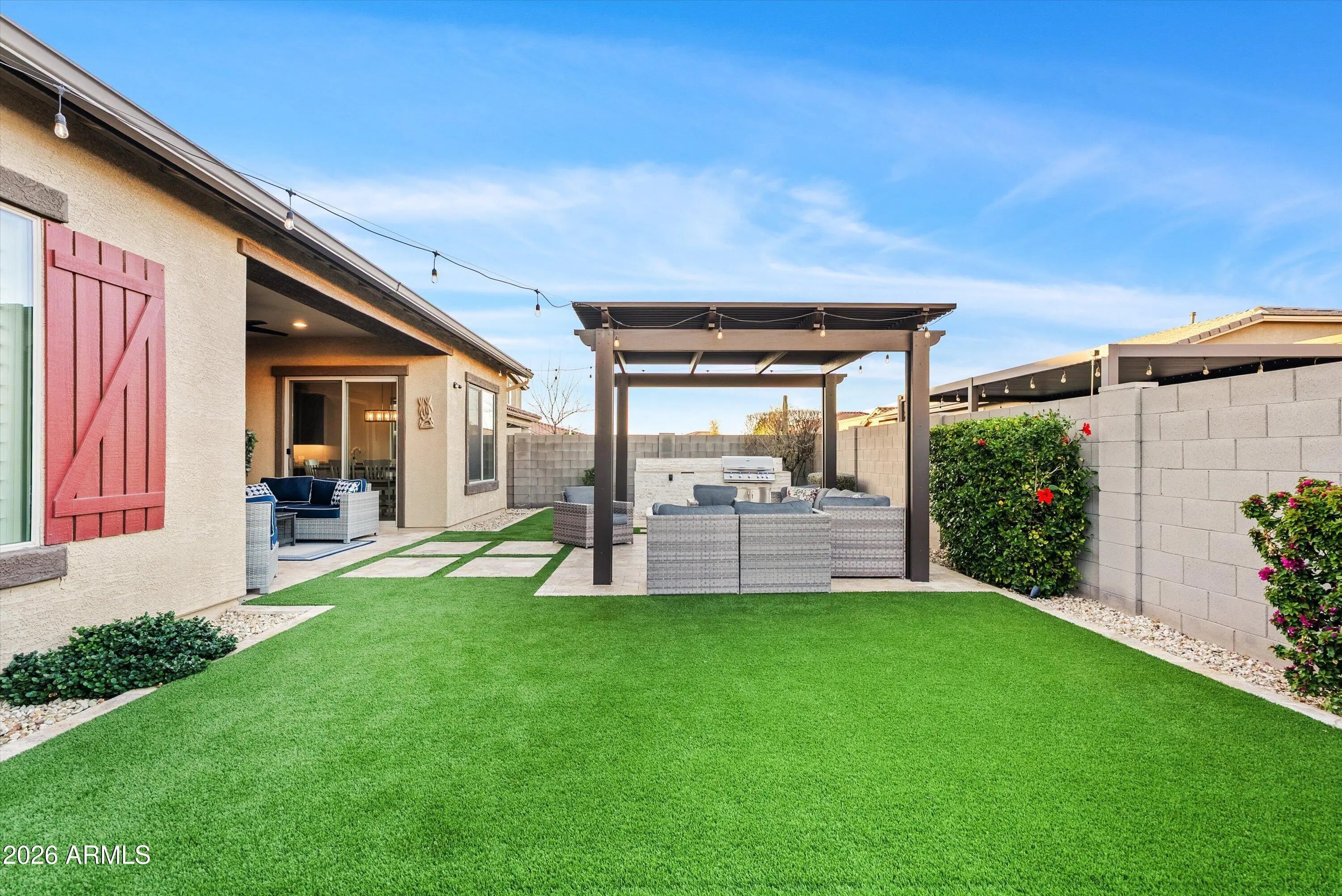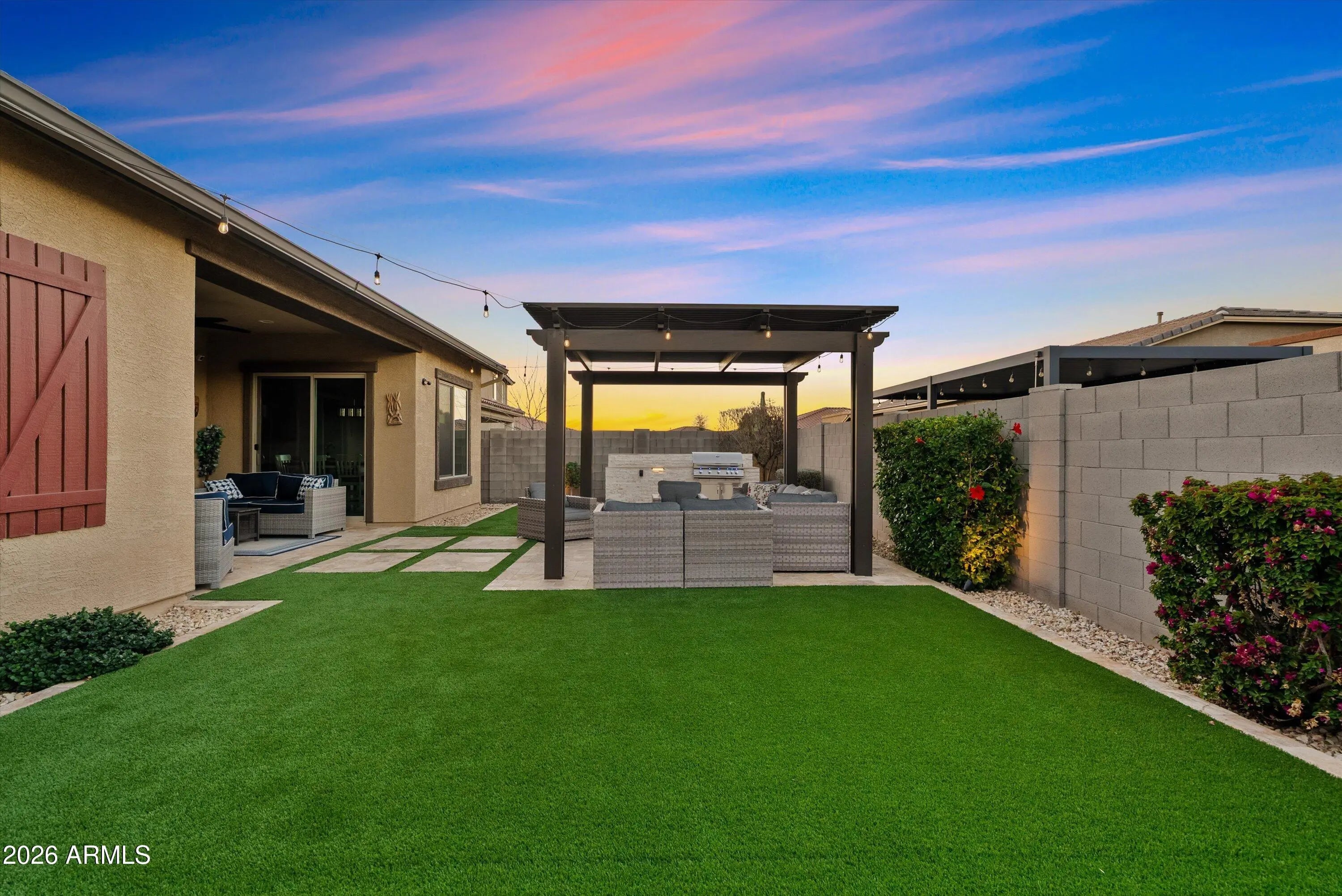 You don't need a custom build to enjoy custom-level upgrades. Welcome to 22638 E Mewes Rd, located in the master planned community of Harvest in Queen Creek. Built in 2021, this beautifully upgraded home offers 4 bedrooms, 3.5 bathrooms, and just over 2600 square feet of thoughtfully designed living space, combining flexibility, comfort, and intentional upgrades throughout. From the moment you arrive, the paver driveway and iron front security door set the tone. Inside, tile flooring throughout the main living areas creates a clean, cohesive feel, while custom accent walls add warmth and character. You'll find a dedicated office and a versatile flex space - perfect for a home gym, formal dining room, playroom, or second living area. The 3-car tandem garage adds extra functionality with epoxy flooring and built-in cabinetry. At the heart of the home, the kitchen is designed for both everyday living and entertaining, featuring gourmet upgrades such as built-in oven, a gas cooktop, granite countertops and soft-close cabinetry. The kitchen opens seamlessly to the main living area, where added recessed lighting, designer accent walls, and Dolby-Atmos ready surround sound create an inviting space to gather. Upgraded center pull sliding glass doors enhance the indoor-outdoor connection and fill the home with natural light. The primary suite serves as a private retreat, offering a custom California Closet, extra sound-reducing insulation in the interior walls, and direct access to the backyard - perfect for unwinding at the end of the day. The front guest bedroom includes a full en-suite bathroom, making it ideal for guests or multigenerational living. Additional guest bedrooms are well-sized and thoughtfully placed for privacy and functionality. Step outside to the backyard designed for year-round enjoyment and entertaining. The space features travertine and turf, a central pergola with seating, landscape and string lighting, and built-in grill and bar, all surrounded by low-maintenance landscaping with an automatic watering system. Living in Harvest means enjoying a true community lifestyle, complete with a scenic lake and walking paths, saltwater community pool, separate lap pool, splash pad, playground, and covered gathering areas. The location offers convenient access to local favorites including Pecan Lake Entertainment, Fat Cats, nearby shopping, dining, and everyday conveniences, as well as San Tan Mountain Regional Park, known for its miles of hiking and biking trails and stunning desert views.