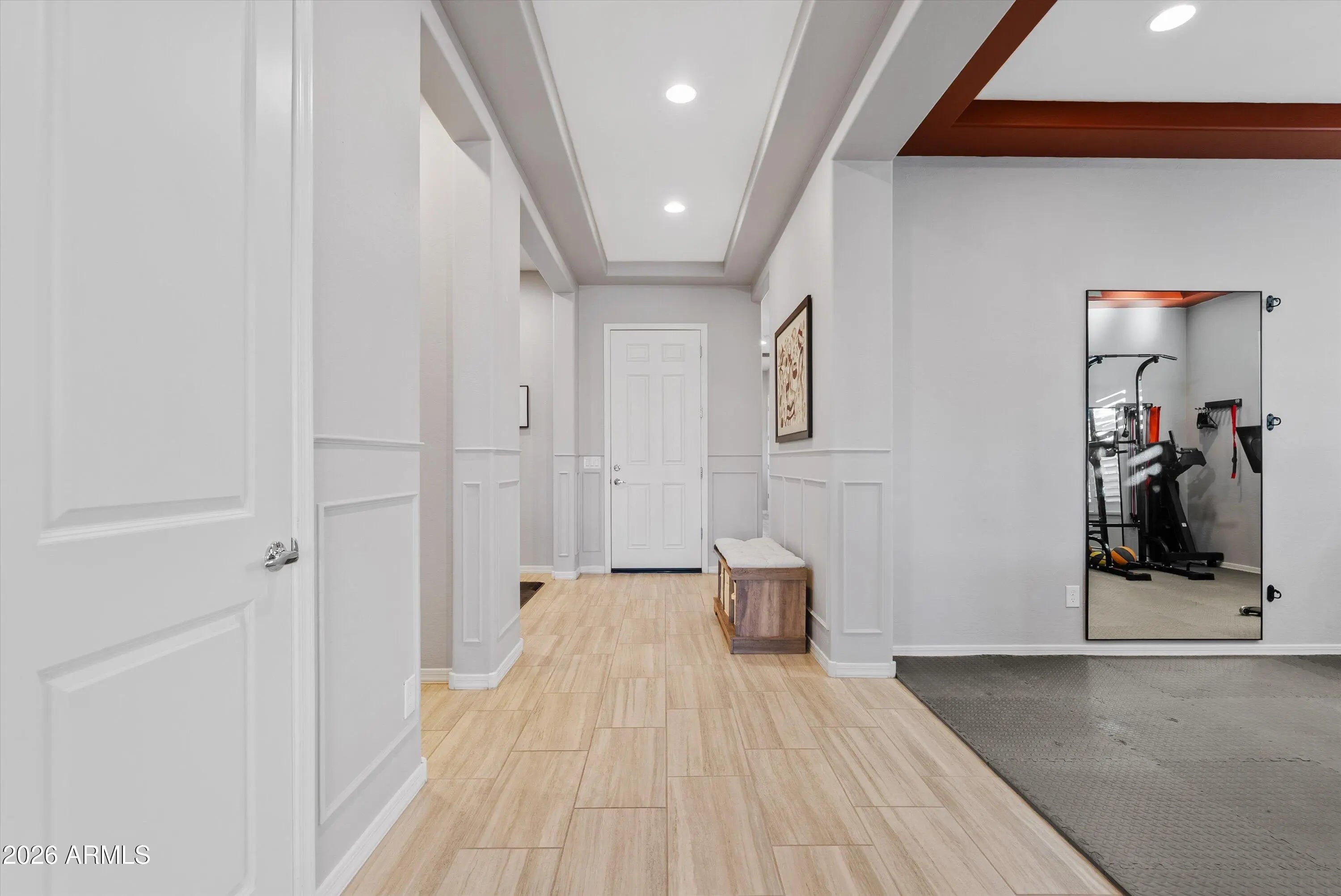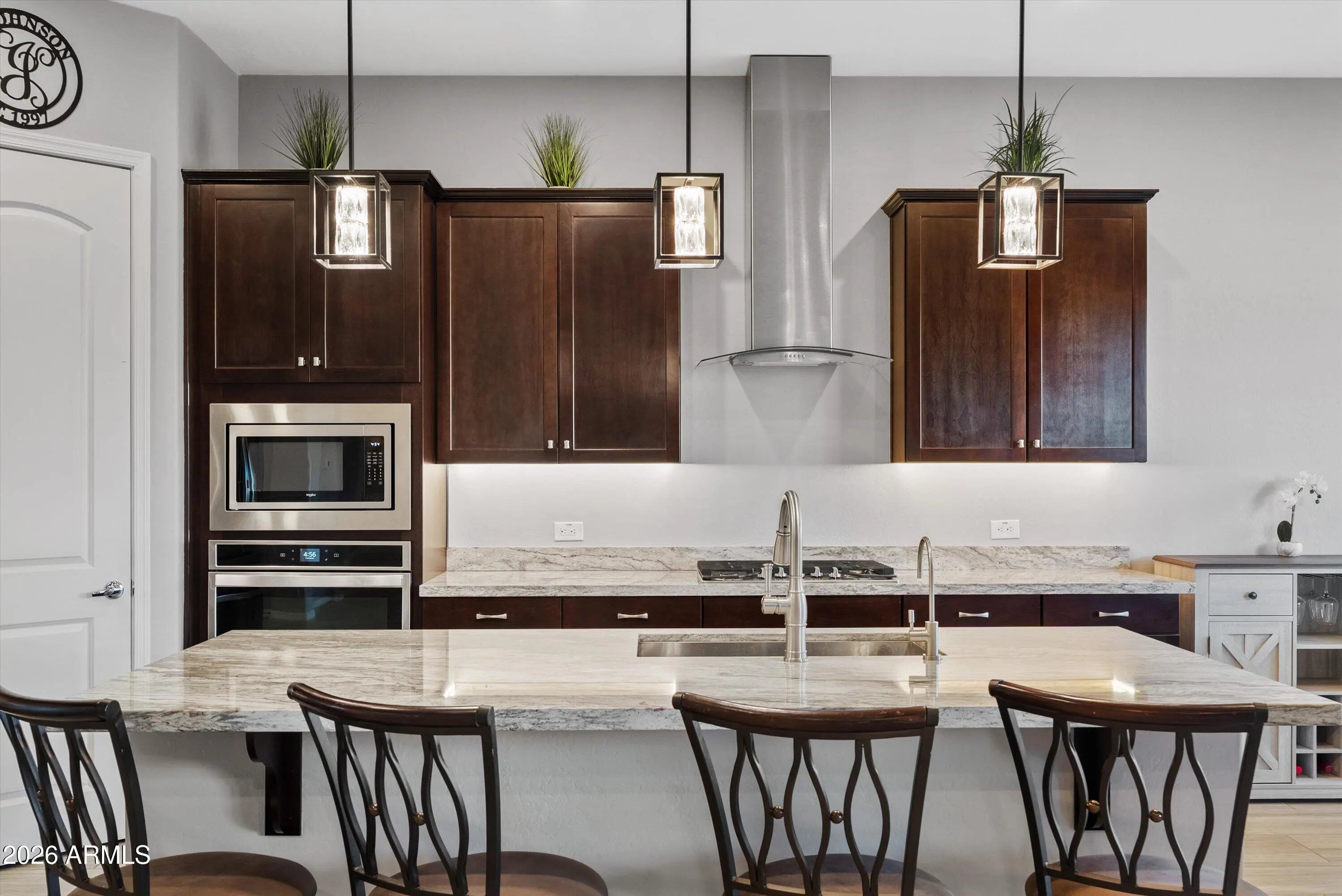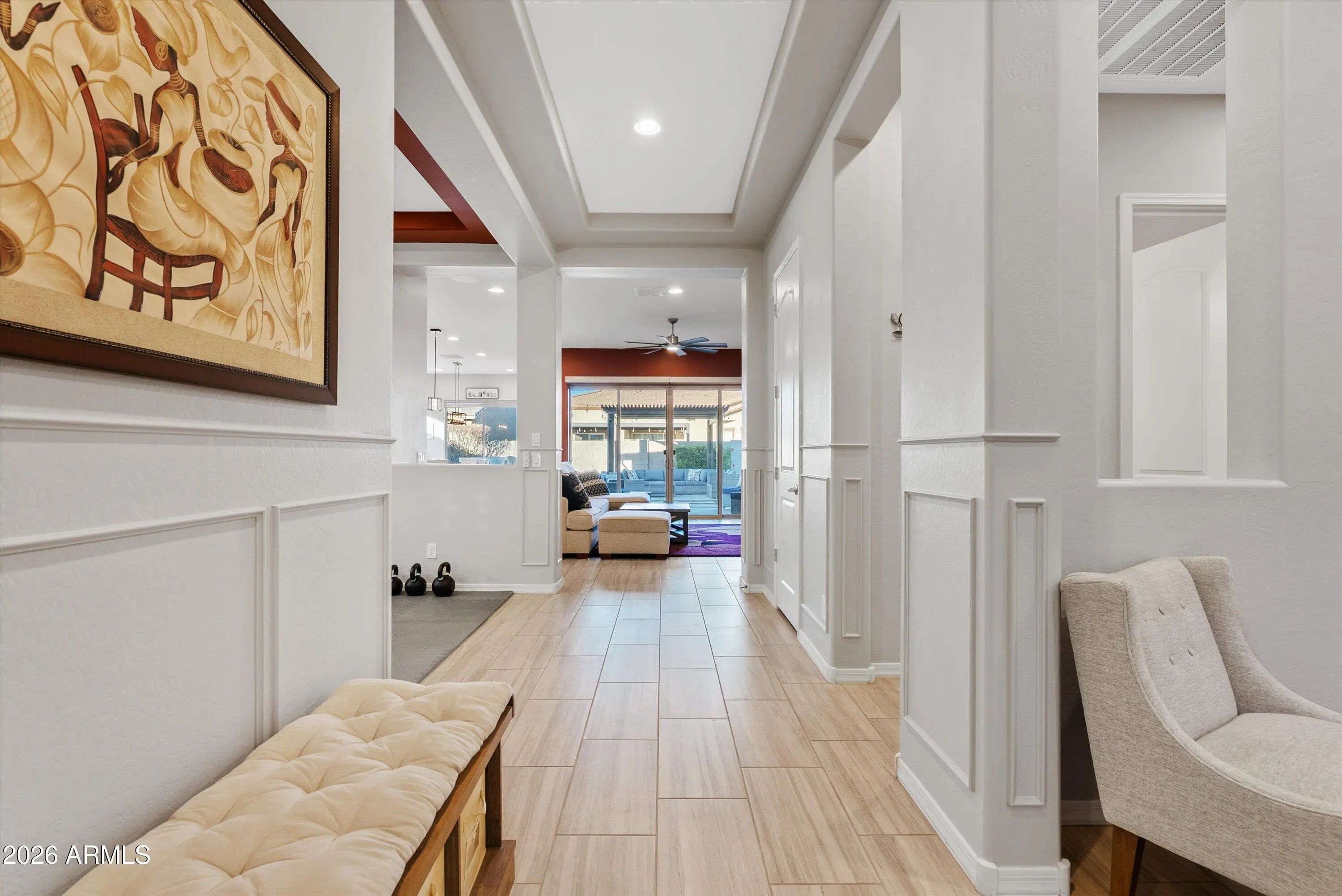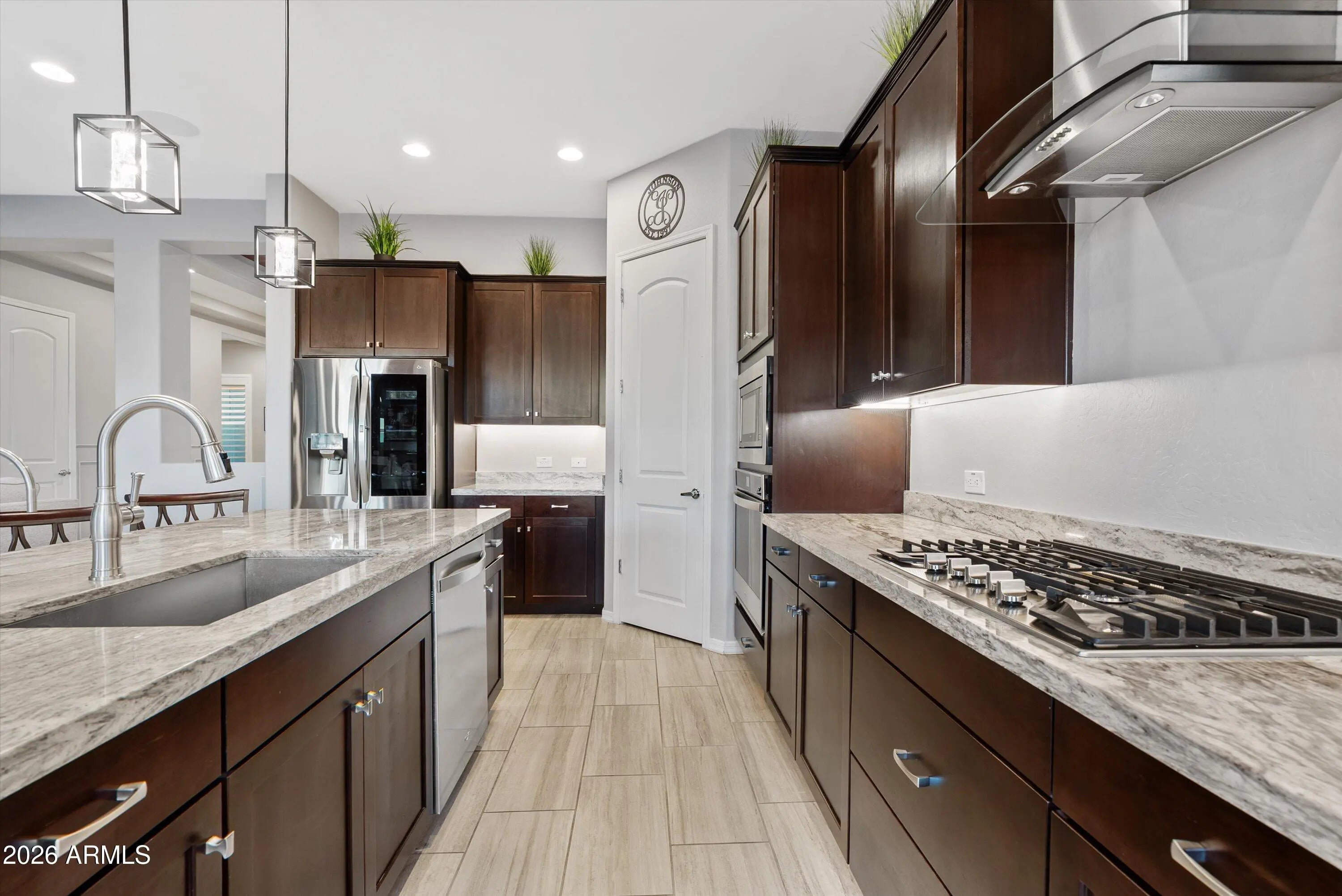 You don't need a custom build to enjoy custom-level upgrades. Welcome to 22638 E Mewes Rd, located in the master planned community of Harvest in Queen Creek. Built in 2021, this beautifully upgraded home offers 4 bedrooms, 3.5 bathrooms, and just over 2600 square feet of thoughtfully designed living space, combining flexibility, comfort, and intentional upgrades throughout. From the moment you arrive, the paver driveway and iron front security door set the tone. Inside, tile flooring throughout the main living areas creates a clean, cohesive feel, while custom accent walls add warmth and character. You'll find a dedicated office and a versatile flex space - perfect for a home gym, formal dining room, playroom, or second living area. The 3-car tandem garage adds extra functionality with epoxy flooring and built-in cabinetry. At the heart of the home, the kitchen is designed for both everyday living and entertaining, featuring gourmet upgrades such as built-in oven, a gas cooktop, granite countertops and soft-close cabinetry. The kitchen opens seamlessly to the main living area, where added recessed lighting, designer accent walls, and Dolby-Atmos ready surround sound create an inviting space to gather. Upgraded center pull sliding glass doors enhance the indoor-outdoor connection and fill the home with natural light. The primary suite serves as a private retreat, offering a custom California Closet, extra sound-reducing insulation in the interior walls, and direct access to the backyard - perfect for unwinding at the end of the day. The front guest bedroom includes a full en-suite bathroom, making it ideal for guests or multigenerational living. Additional guest bedrooms are well-sized and thoughtfully placed for privacy and functionality. Step outside to the backyard designed for year-round enjoyment and entertaining. The space features travertine and turf, a central pergola with seating, landscape and string lighting, and built-in grill and bar, all surrounded by low-maintenance landscaping with an automatic watering system. Living in Harvest means enjoying a true community lifestyle, complete with a scenic lake and walking paths, saltwater community pool, separate lap pool, splash pad, playground, and covered gathering areas. The location offers convenient access to local favorites including Pecan Lake Entertainment, Fat Cats, nearby shopping, dining, and everyday conveniences, as well as San Tan Mountain Regional Park, known for its miles of hiking and biking trails and stunning desert views.