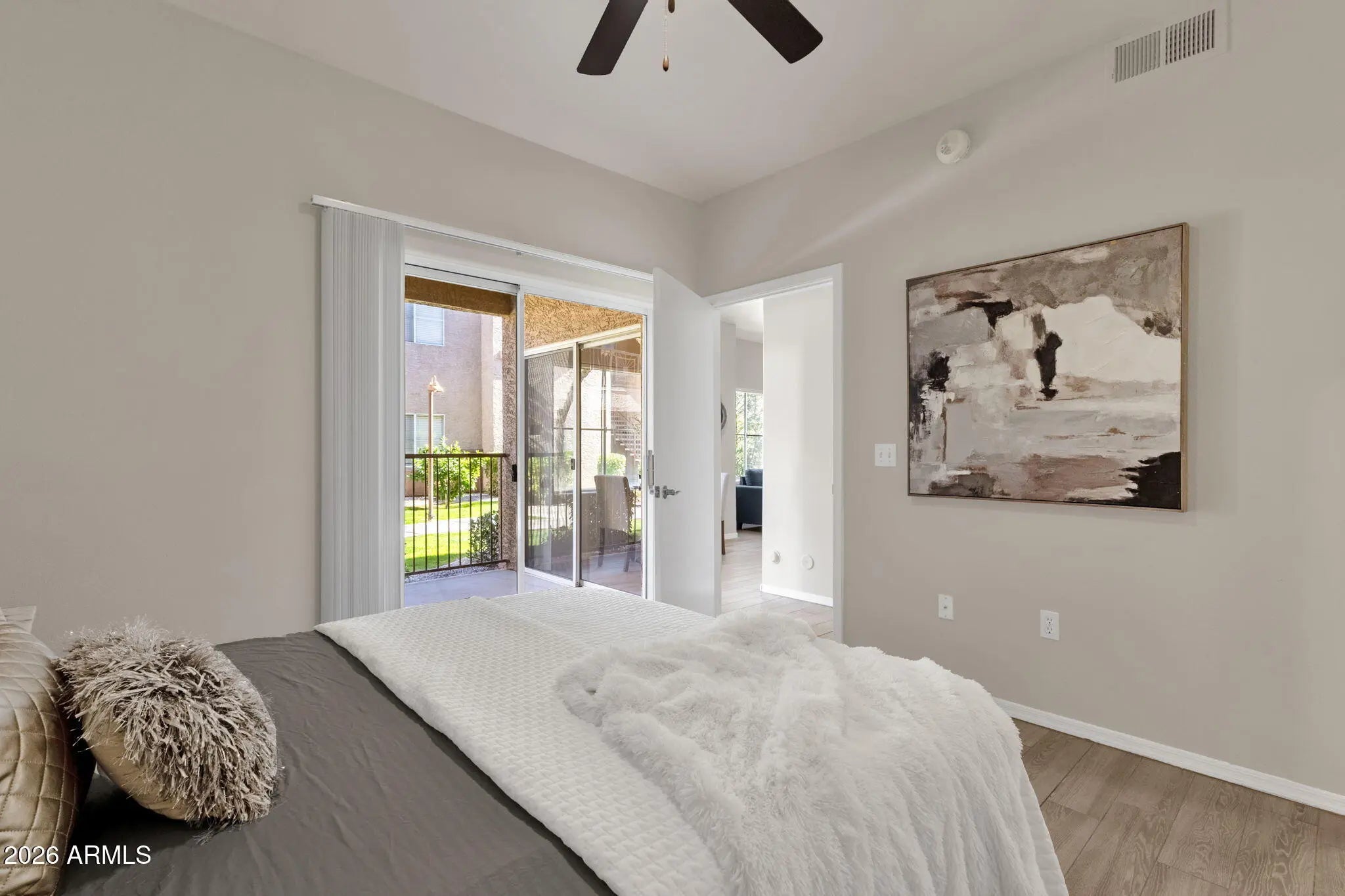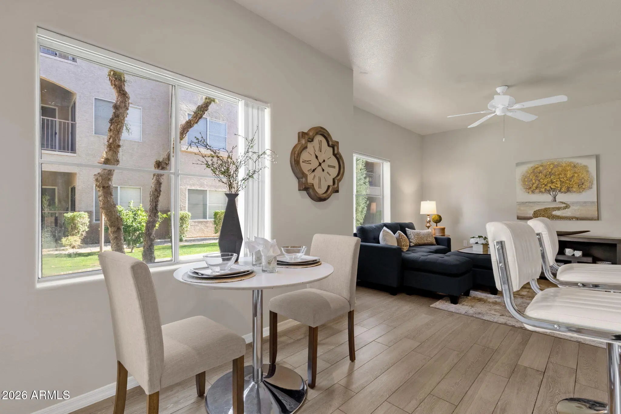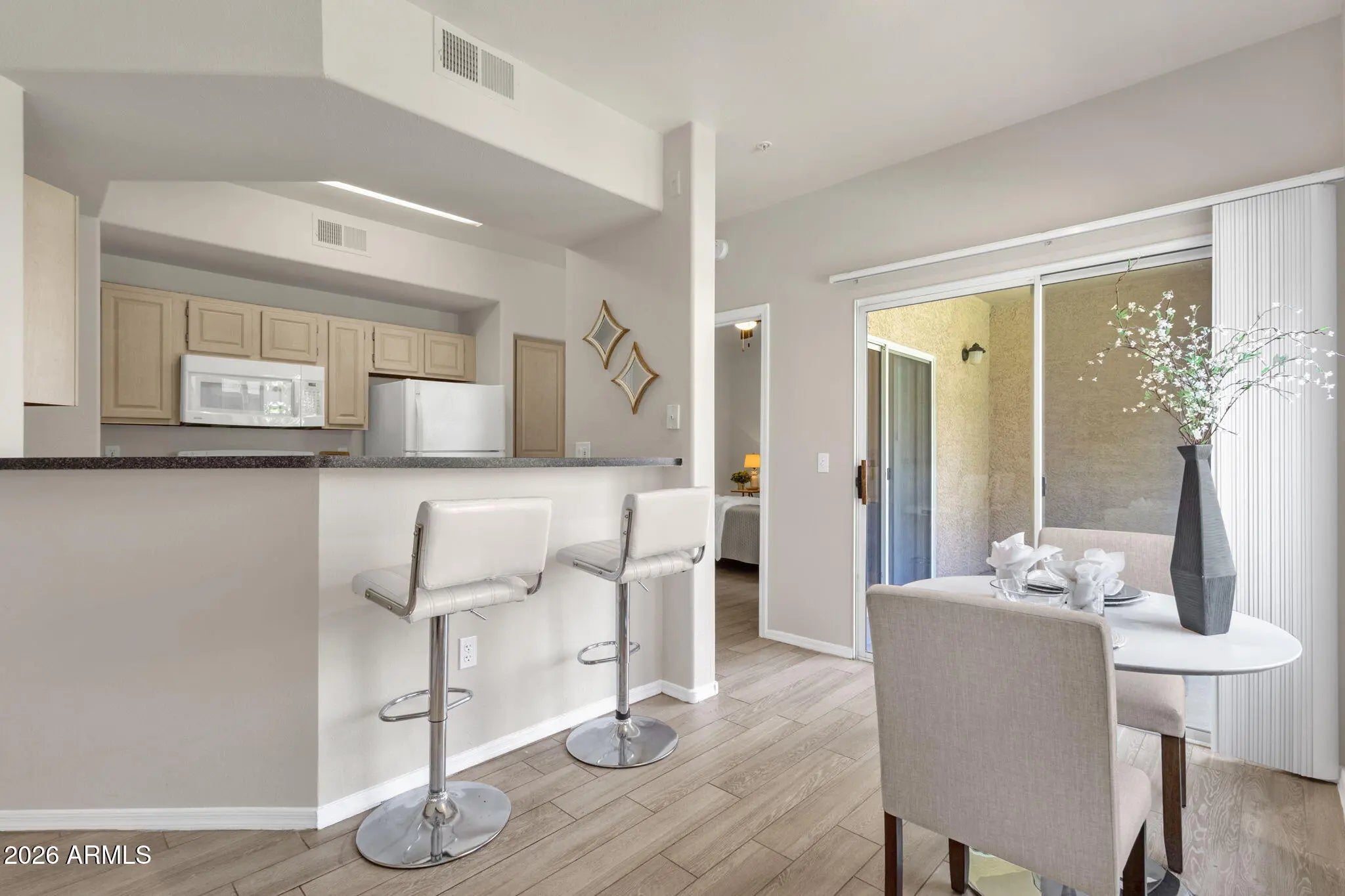 This move-in-ready 1-bedroom, 1-bath condo offers 778 sq ft of thoughtfully arranged living space in the desirable Four Peaks area of Fountain Hills. Inside, you'll find wood-look flooring, updated neutral finishes, and an open living and dining layout that feels welcoming. The kitchen is sleek and well-maintained, featuring ample cabinet storage, built-in appliances, and a functional sightline to the main living area. The bedroom provides a relaxing retreat with a walk-in closet and private access to the covered patio. A Jack-and-Jill bathroom connects both the bedroom and main living space, adding everyday practicality. Enjoy quiet mornings or evening downtime on the covered patio. The community offers a variety of resort-style amenities, including a heated pool and spa, fitness center, clubhouse/rec room, and media room. The unit includes one assigned parking space, making this an easy transition for the next owner. A great blend of lifestyle, amenities, and location!