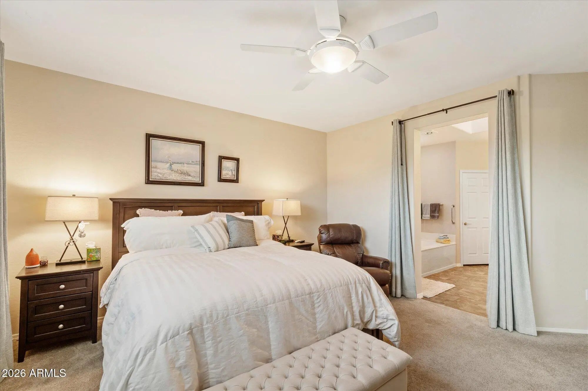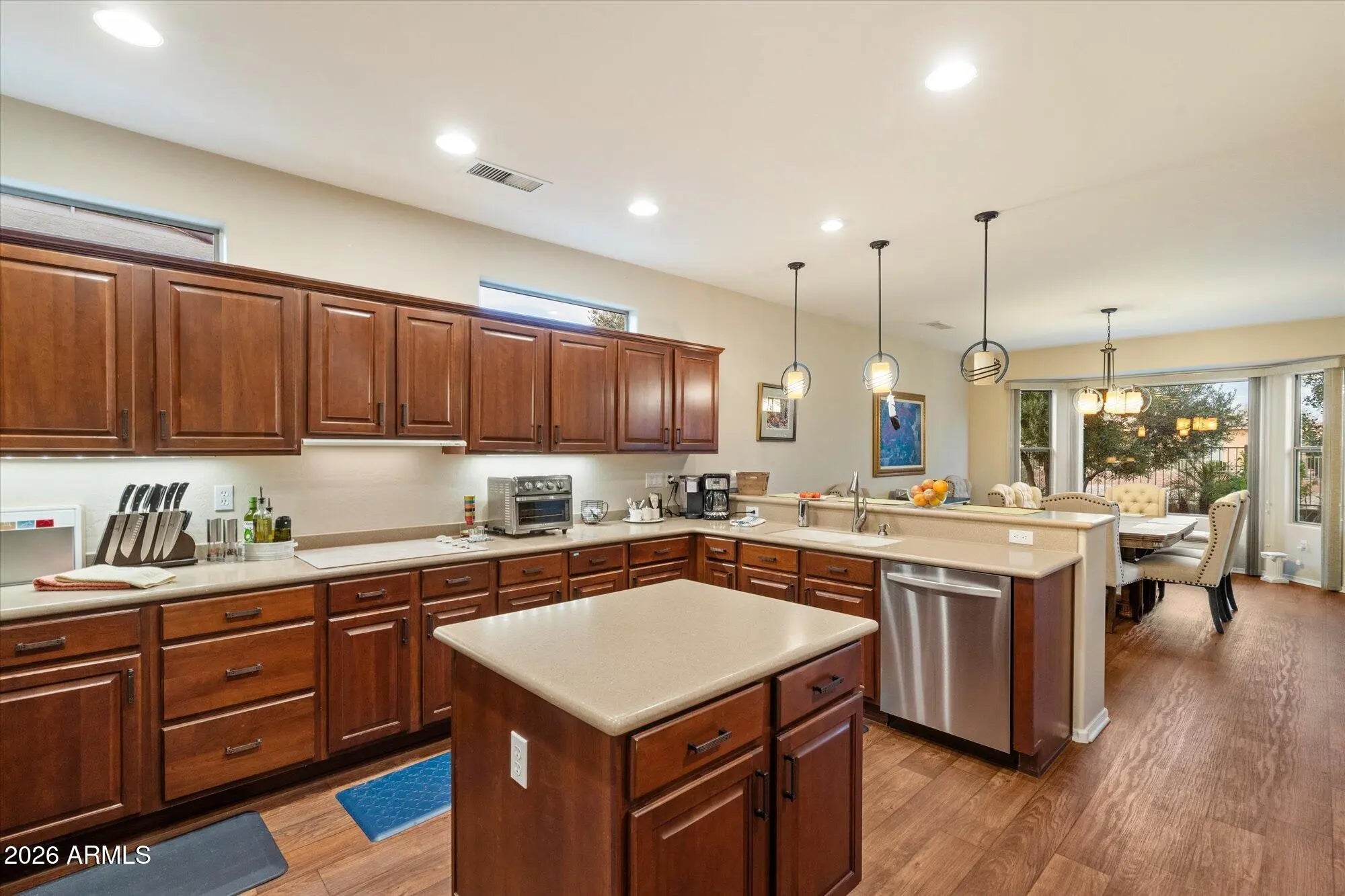 Beautiful home w over $20,700 in recent remodeling upgrades since 2024. Featuring an open floor plan, 2 primary suites, 2.5 BA, a den, & 2,334 sq ft of living space. Front patio, N/S exposure, extended 2-car garage, desert landscape, & newer irrigation. Large great room, 9' ceilings, 6-panel doors, LVP flooring, neutral paint, & cozy fireplace. Kitchen updated w soft-close cherry cabinets, under-cabinet lighting, Corian CTs, SS appliances, recessed lighting, & expanded breakfast area w/bay window. Primary bedroom features a walk-in closet, patio access, full BA, dual sinks, new lighting, & separate tub/shower. Additional highlights include a new smart water softener, water heater, garage workbench, new backyard fencing w/2 side gates, motorized window blinds in the living area, sliding glass door, & primary bedroom, added bathroom electrical outlet, Kitchen pull out shelves, & motion lighting in the walk-in closet.