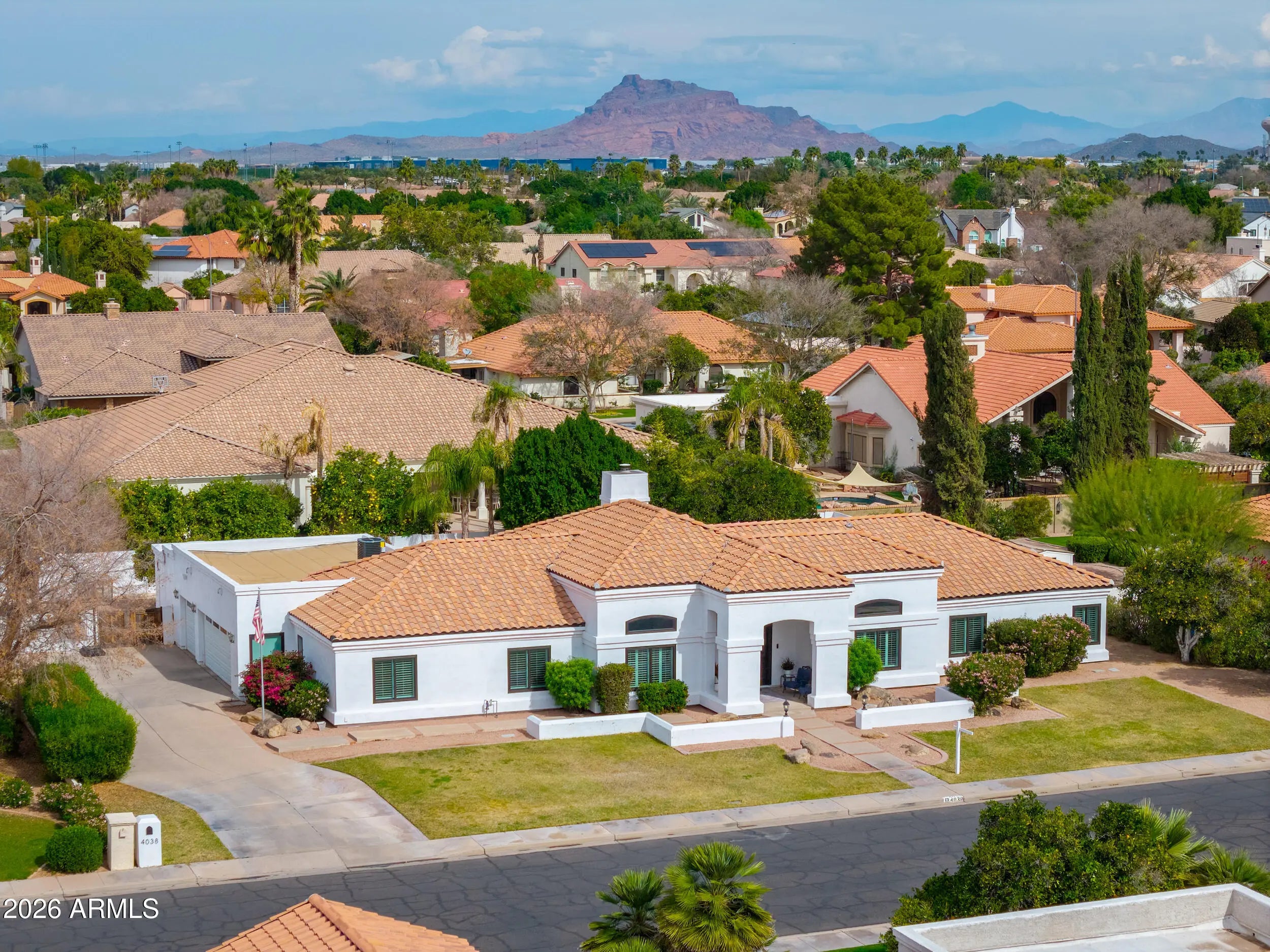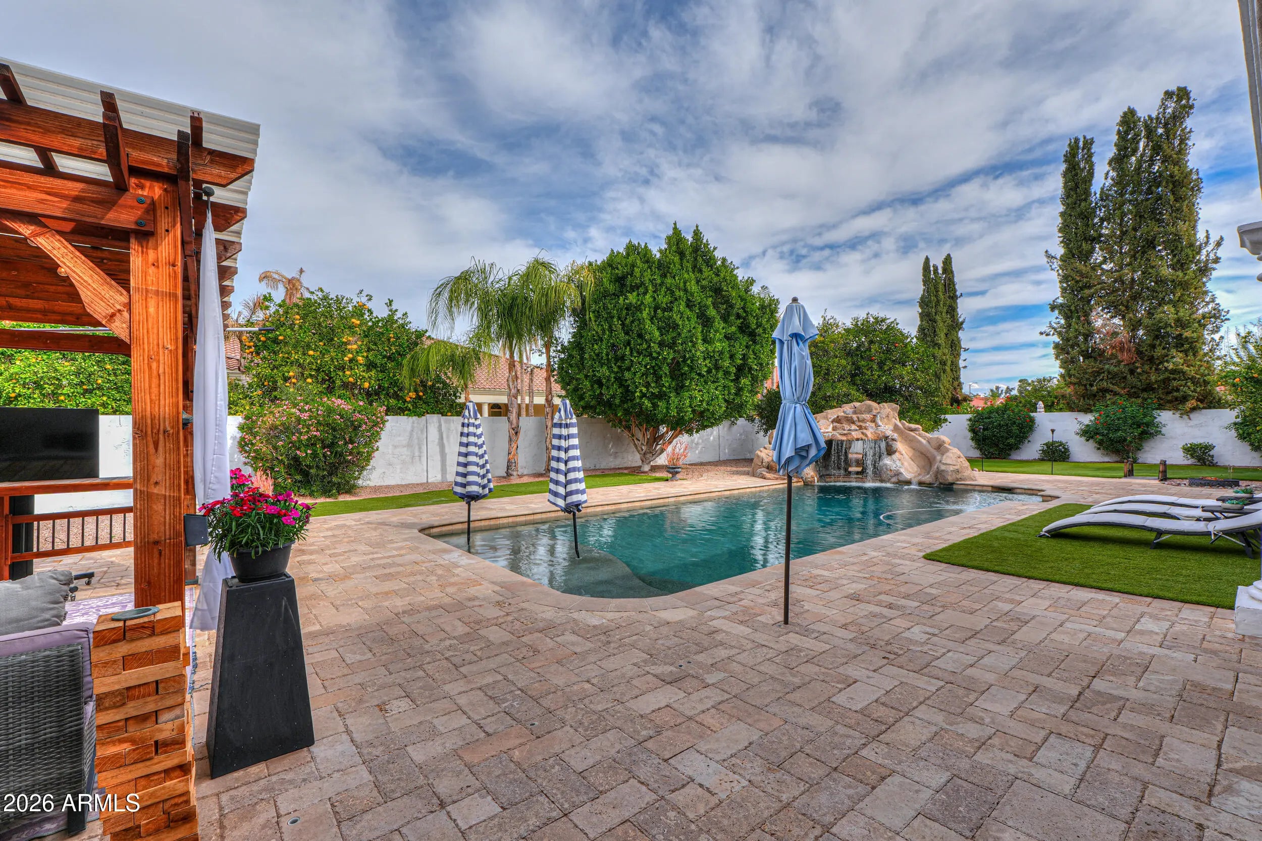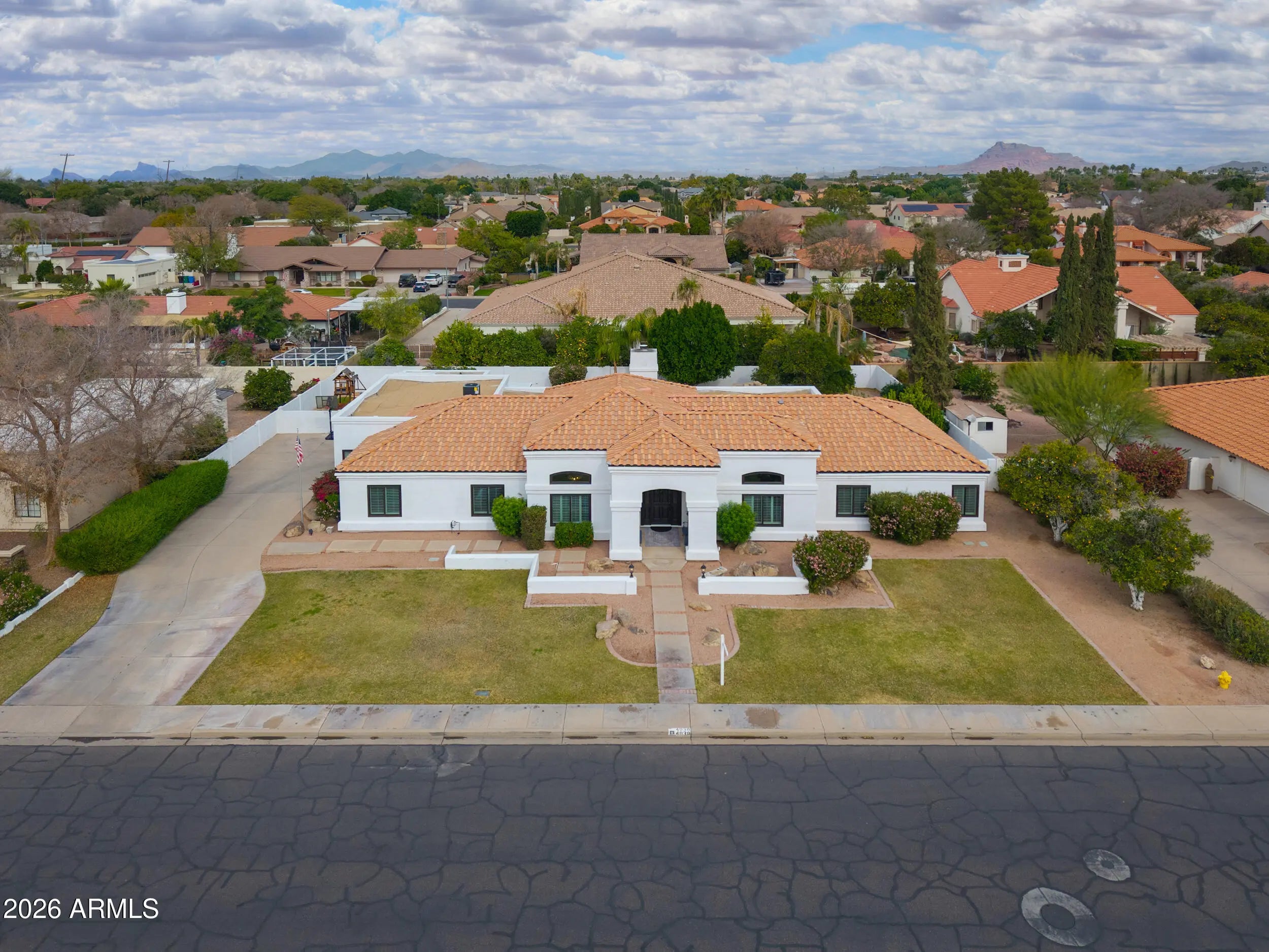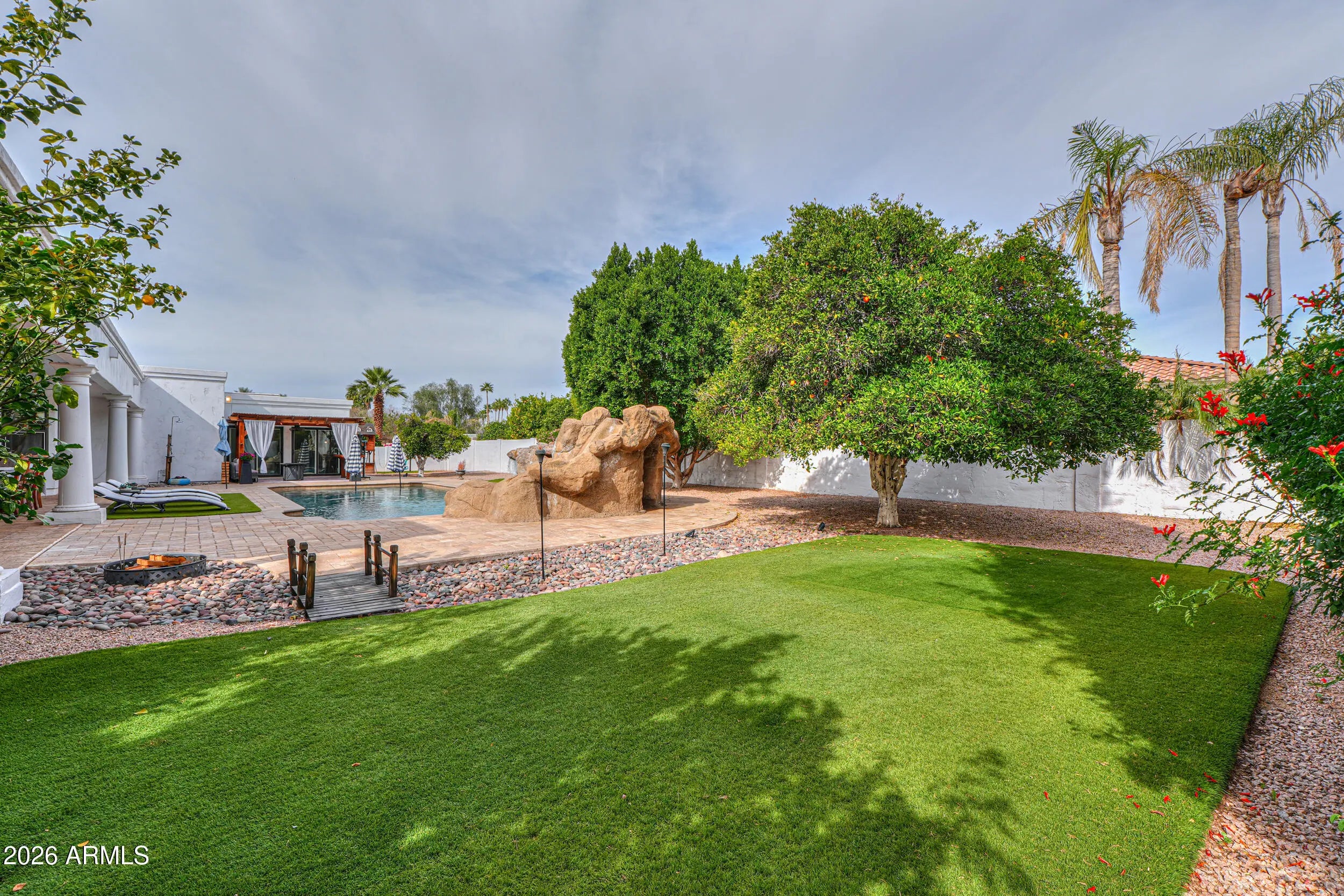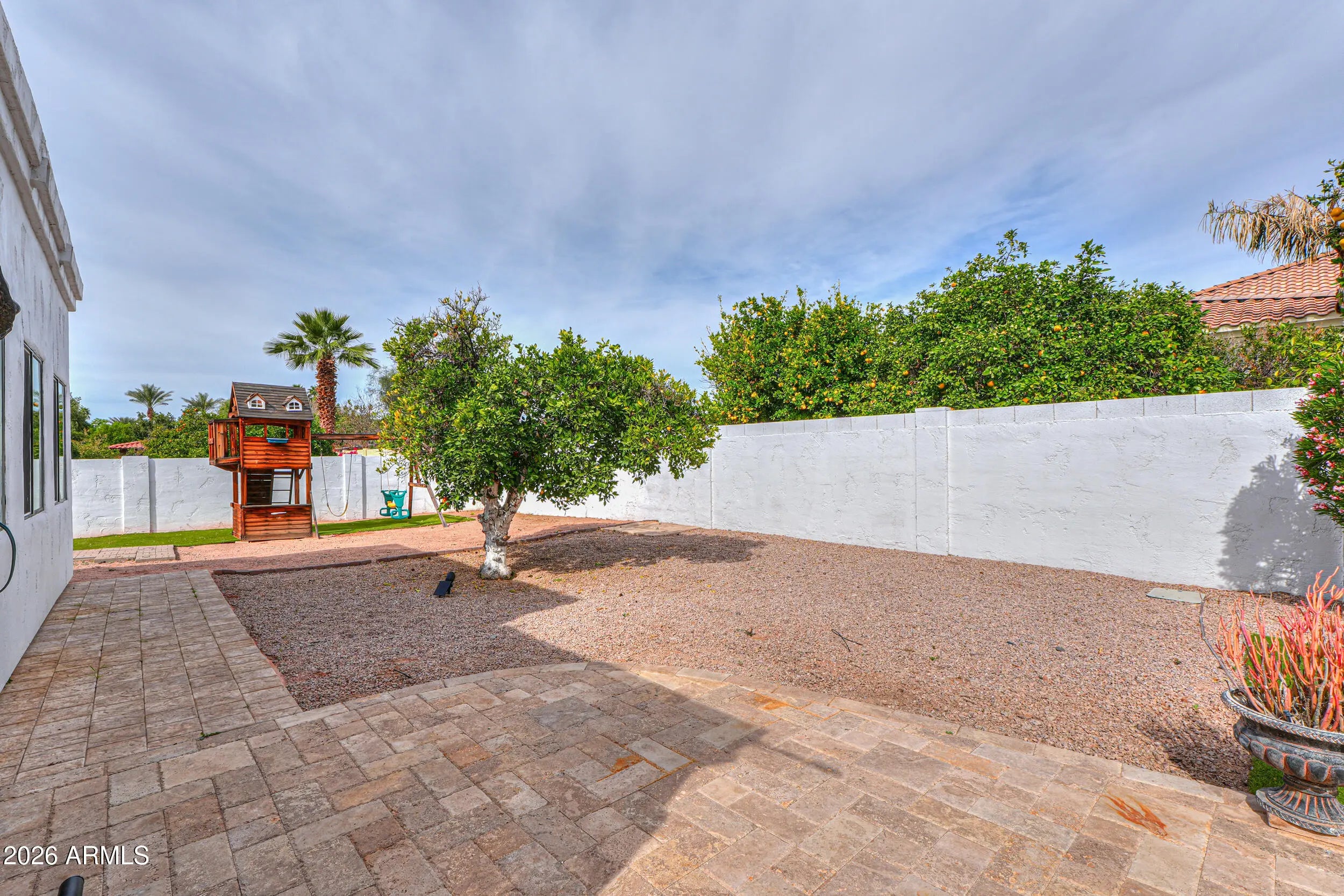 Welcome to this stunning custom home in the Groves community! Situated on a 0.42-acre lot, this beautifully maintained property offers 5 bedrooms, 3 bathrooms, and 3,511 sq ft of living space, plus a separate casita (approx. 312 sq ft) with its own private entrance--perfect for guests or a home office setup. Enjoy Arizona living at its best with a removable fenced diving pool, pergola, covered patios, playground, and lush yard space. The backyard is a true retreat with mature, producing orange and lemon citrus trees. Inside, you'll love the spacious layout with a great room, family room, fireplace, vaulted ceilings, and a bright eat-in kitchen with granite counters, island, pantry, and stainless appliances. 3 car extended garage, RV gate and N/S exposure complete the package.