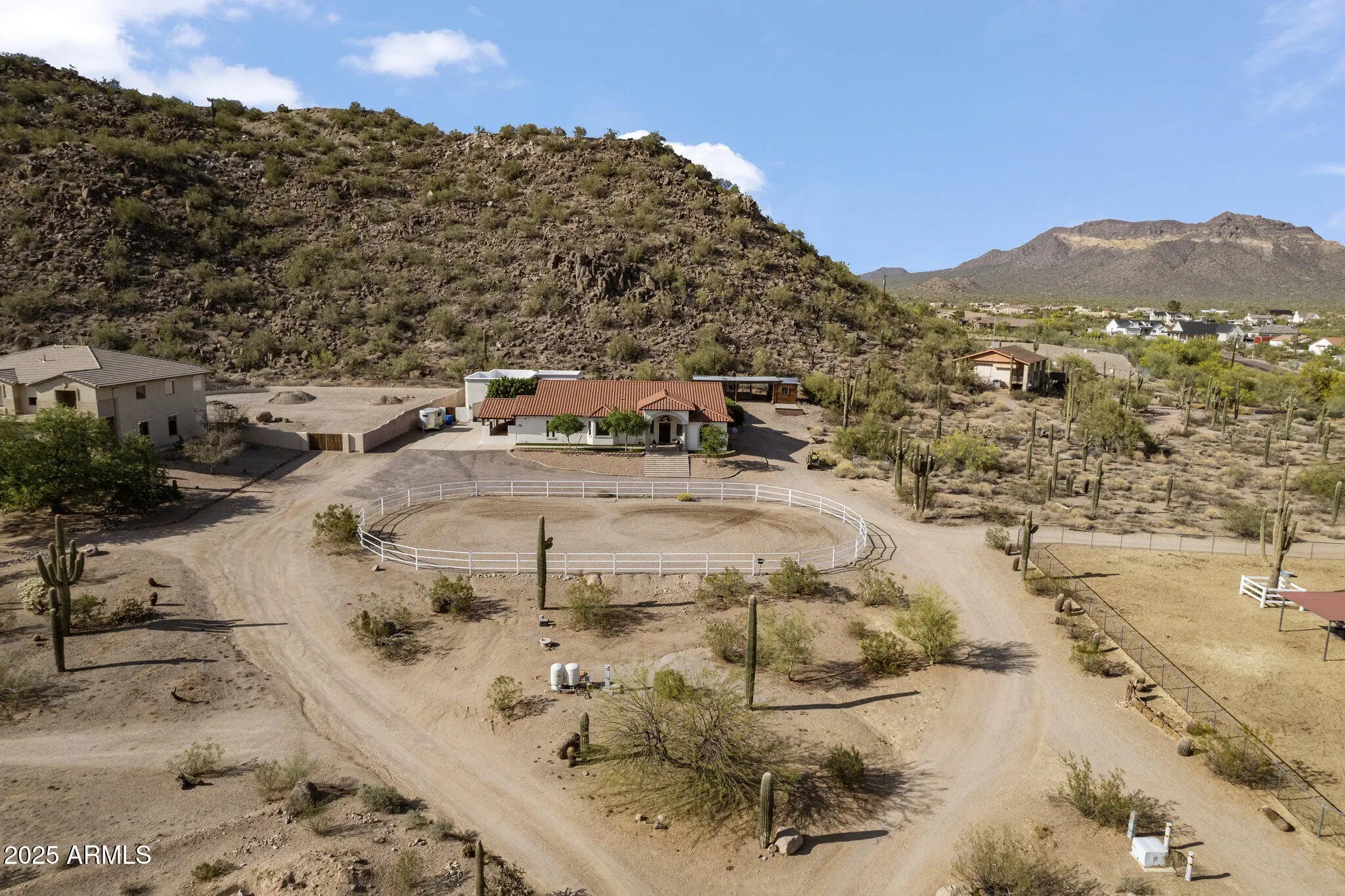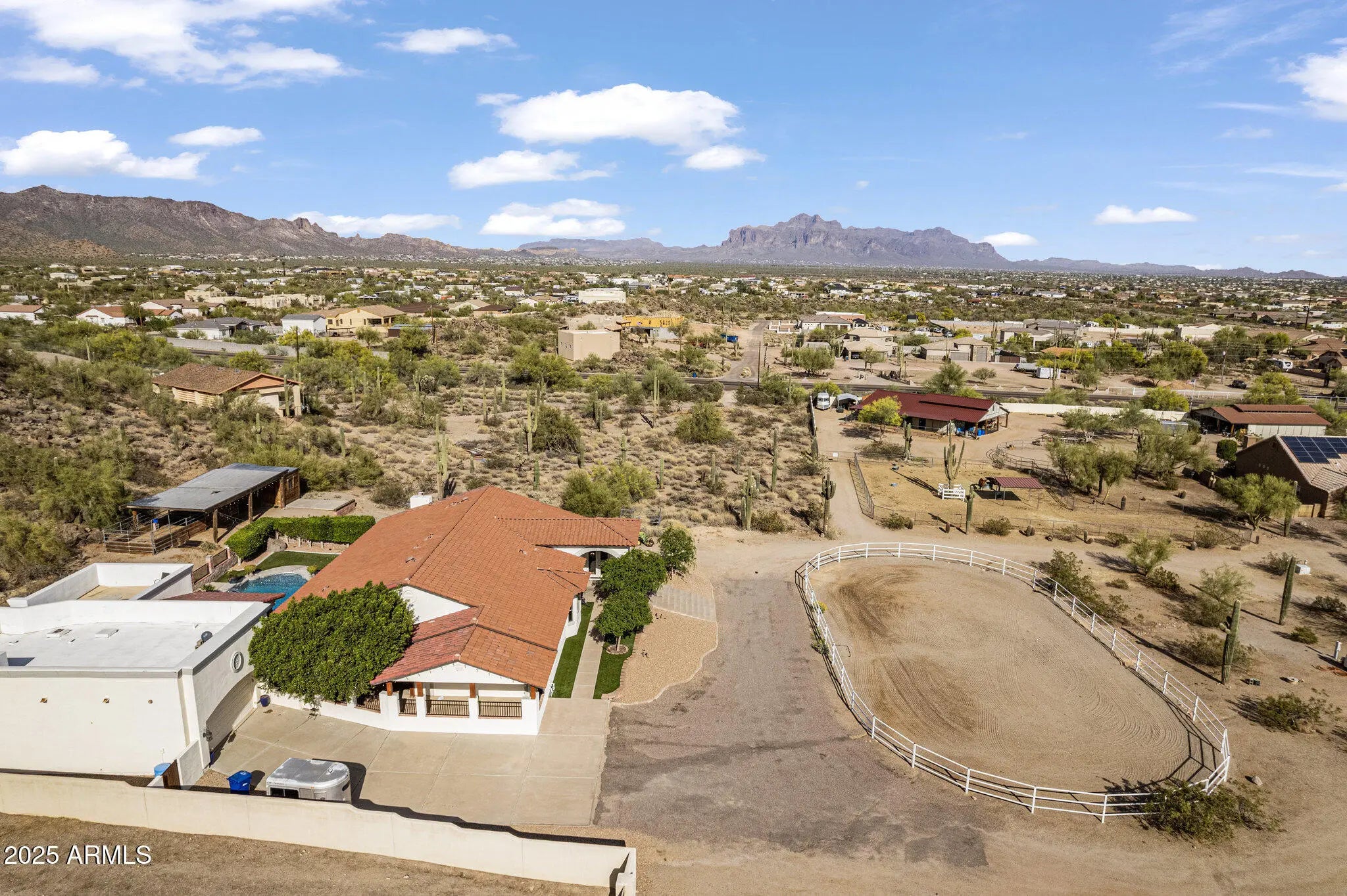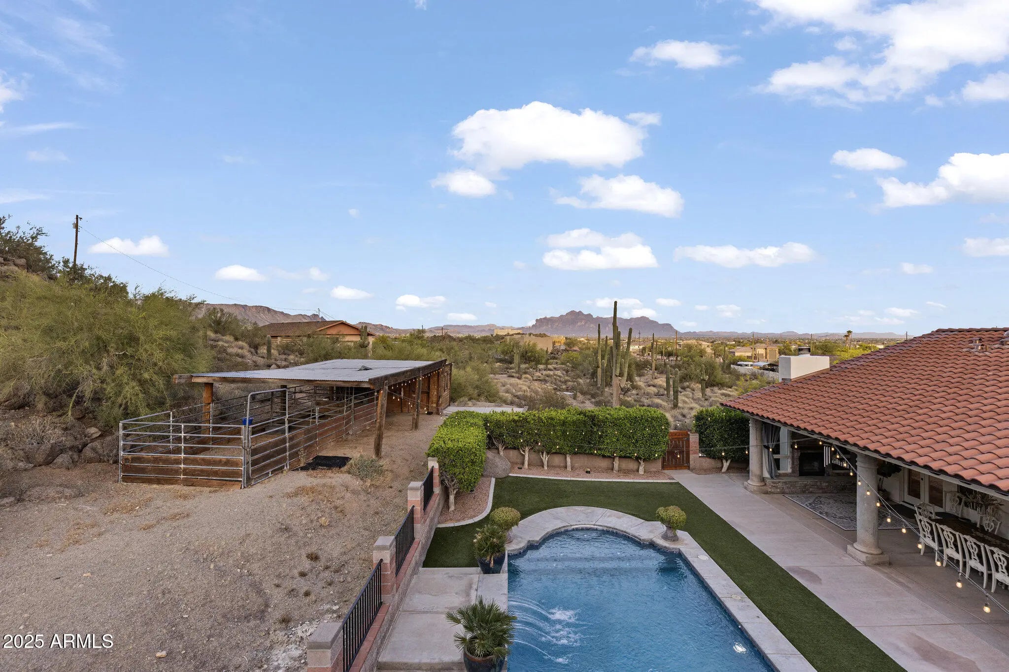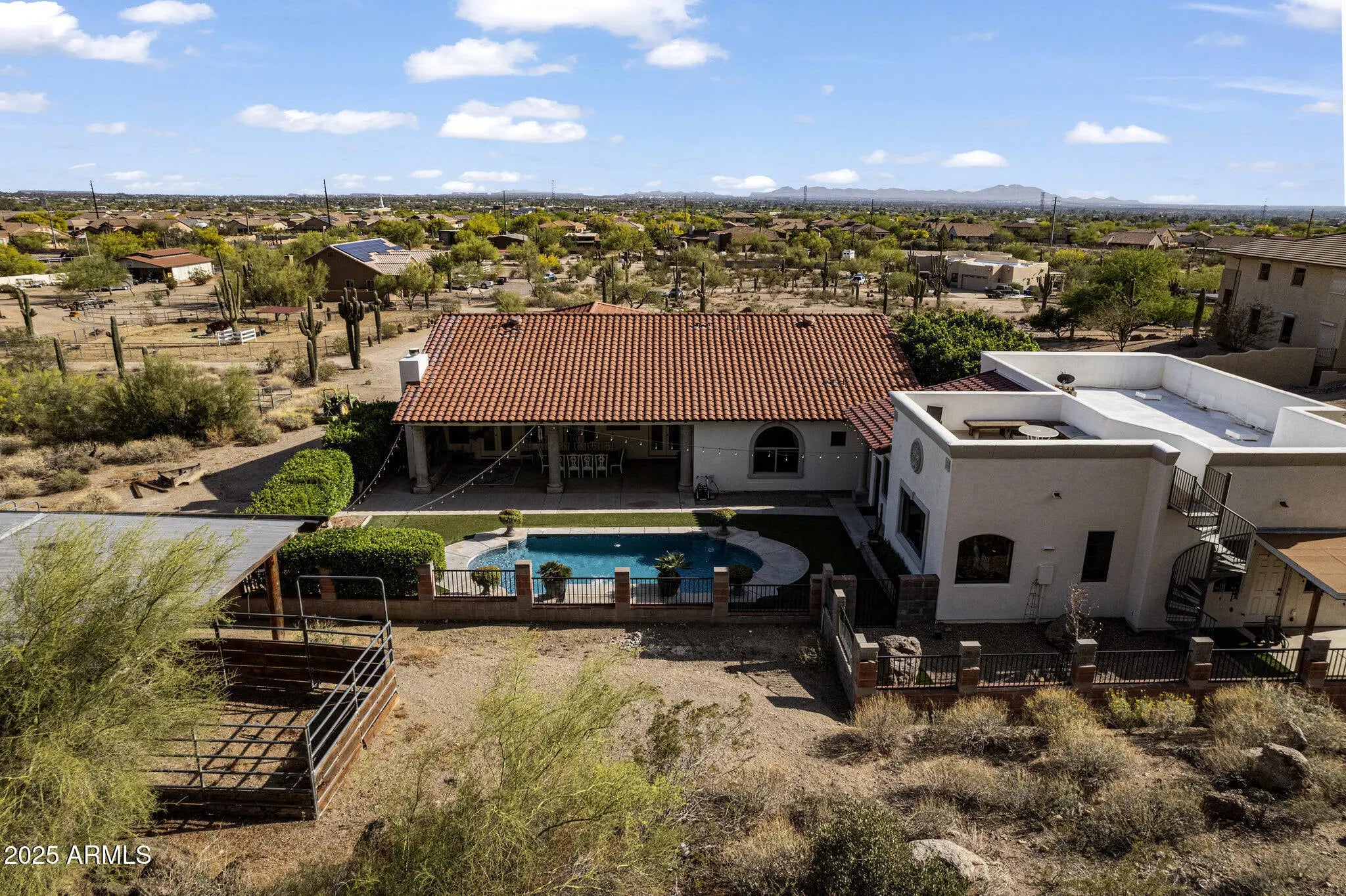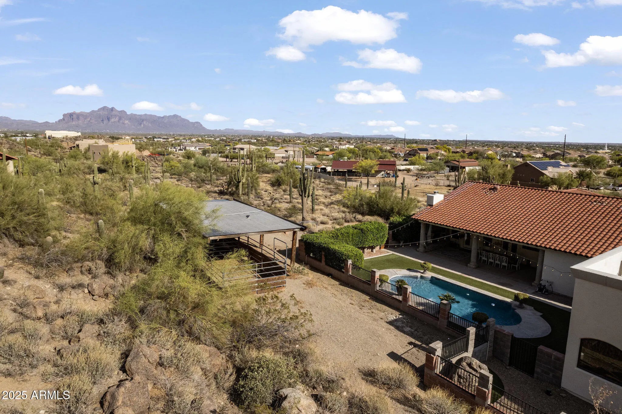 Welcome to your stunning custom home w/ private casita; designed for space, privacy, & elevated desert living. Situated on just under 2 acres & backing to a preserve, this property offers serene surroundings, unobstructed views, & unforgettable sunsets from the rooftop deck. Horse privileges include stalls & arena, while the expansive setting allows for flexibility & lifestyle freedom. Featuring 3 bedrooms, 2.5 baths, office, separate family & entertainment rooms & seamless indoor-outdoor living. Large covered patio & pool create an inviting space to relax or entertain. The detached casita offers an open floor plan w/ 1 bedroom, 1 bathroom, full kitchen, & preserve views—ideal for guests or multigenerational living. Located near the Usery Mountain trailhead w/ convenient freeway access.