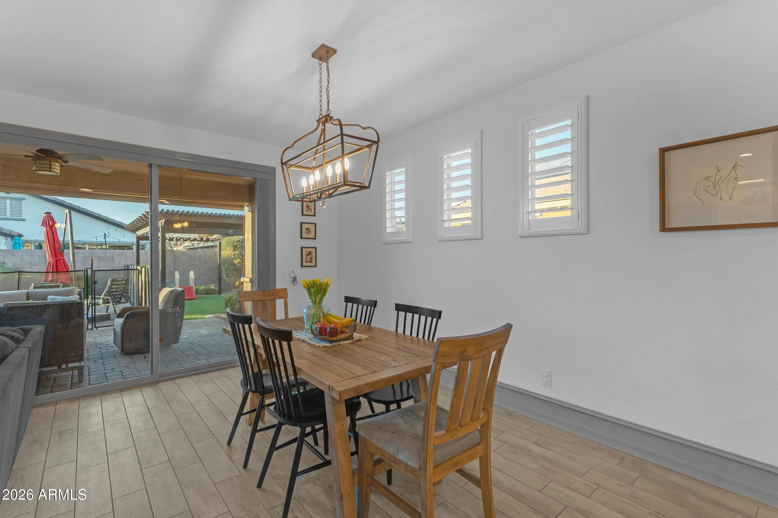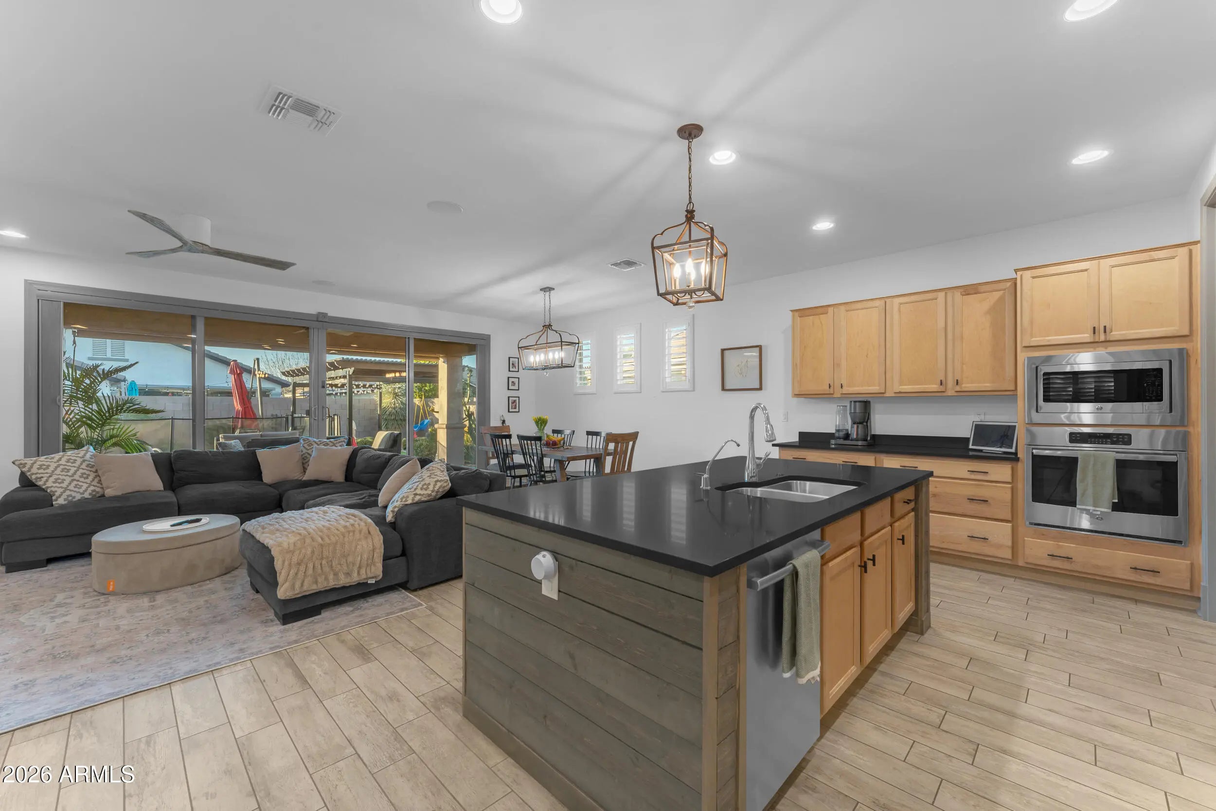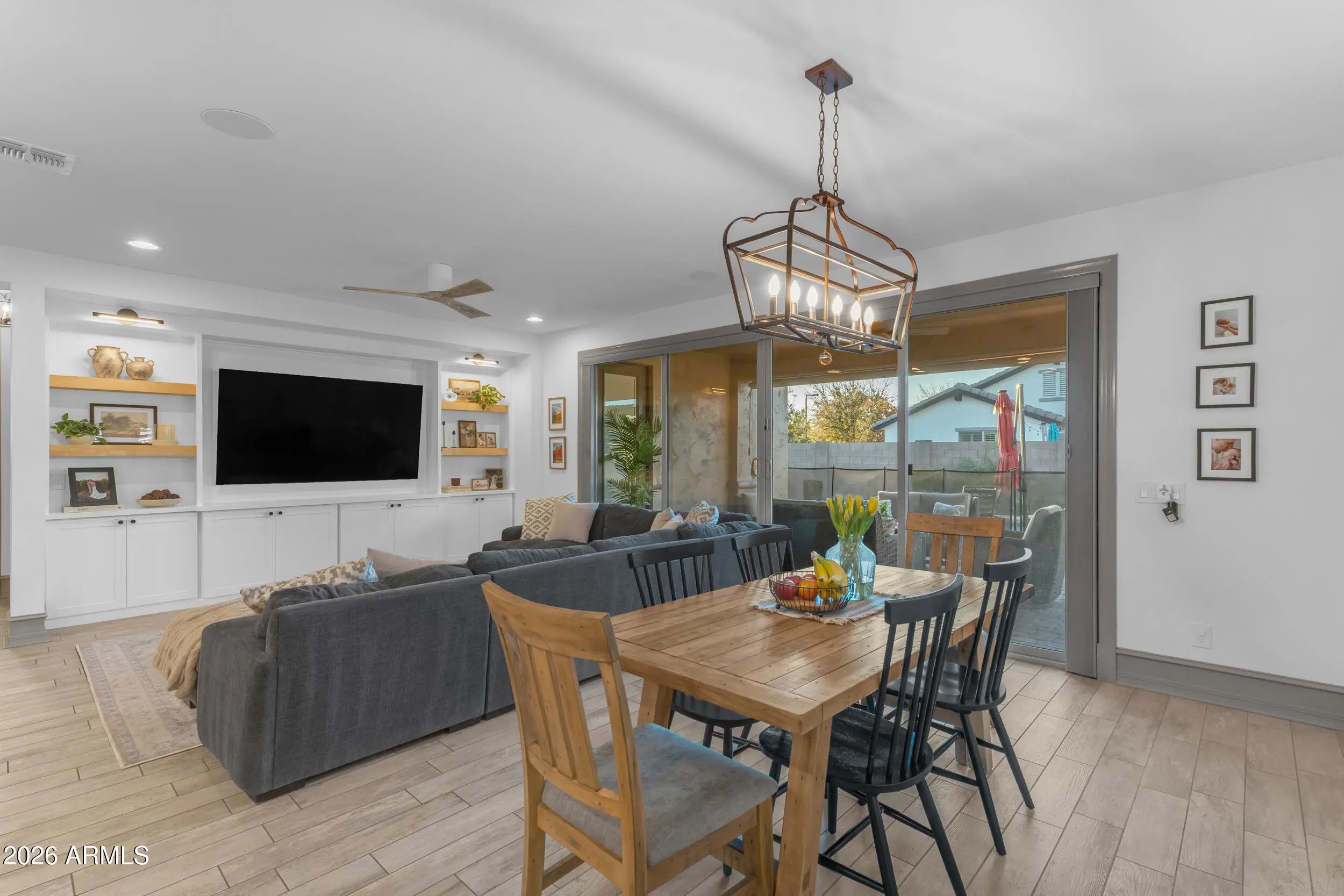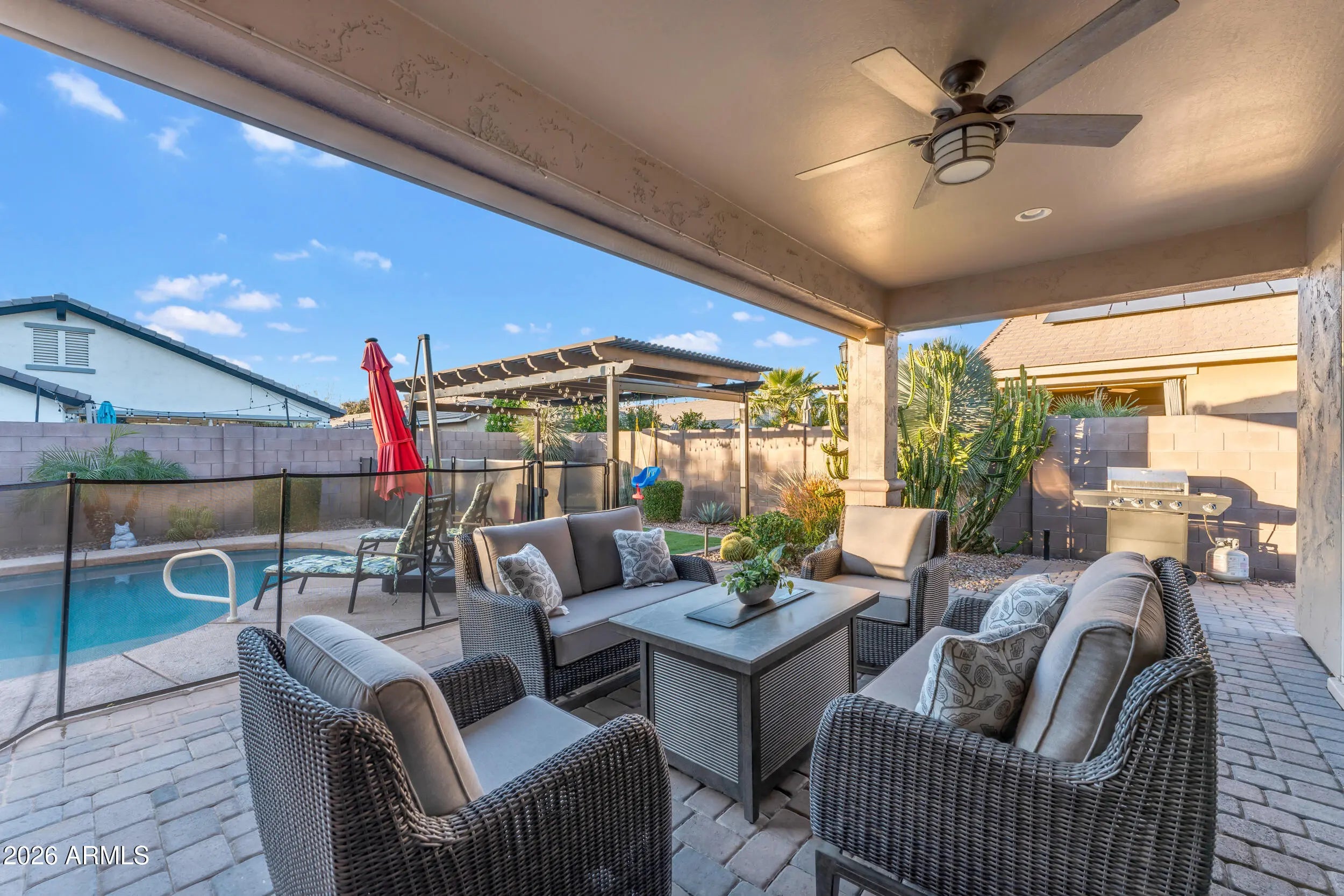 Located on a premium corner lot in the sought-after Queen Creek Station, this refined 3-bedroom, 2-bath residence with a private den offers nearly 2,000 square feet of thoughtfully curated living—just minutes from Queen Creek Marketplace for dining, shopping, and everyday conveniences. Fresh exterior paint delivers instant curb appeal, setting the tone from the moment you arrive. Inside, the home is light-filled and polished, anchored by wood-look ceramic tile, upgraded trim, and a custom-designed built-in in the living room that blends form and function with effortless style. The open-concept layout is ideal for both elevated entertaining and relaxed everyday living. The chef's kitchen features quartz countertops, upgraded cabinetry, and stainless steel appliances, creating a clean, modern aesthetic that feels timeless and intentional. The den, framed by French doors, offers a flexible retreatperfect for a home office, lounge, or guest space. A dramatic 16-foot atrium-style sliding glass door, paired with an automated shade, creates seamless indoor-outdoor flow while offering privacy and light control at the touch of a button. The backyard is a true private escape, centered around a saltwater pool with updated equipment. A commercial-grade misting system keeps the space cool and comfortable, while the tranquil pergola completes the resort-style setting. For today's lifestyle, the home also includes a Tesla EV charger, blending modern convenience with forward-thinking design. Impeccably maintained, thoughtfully upgraded, and positioned for both lifestyle and location,this home delivers sophistication, comfort, and everyday luxury in one exceptional package.