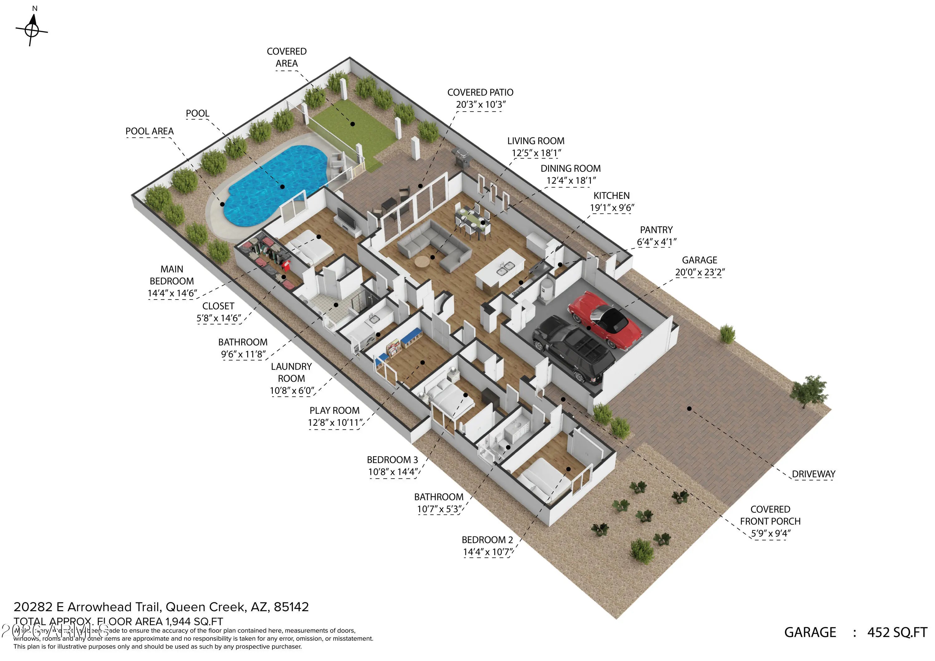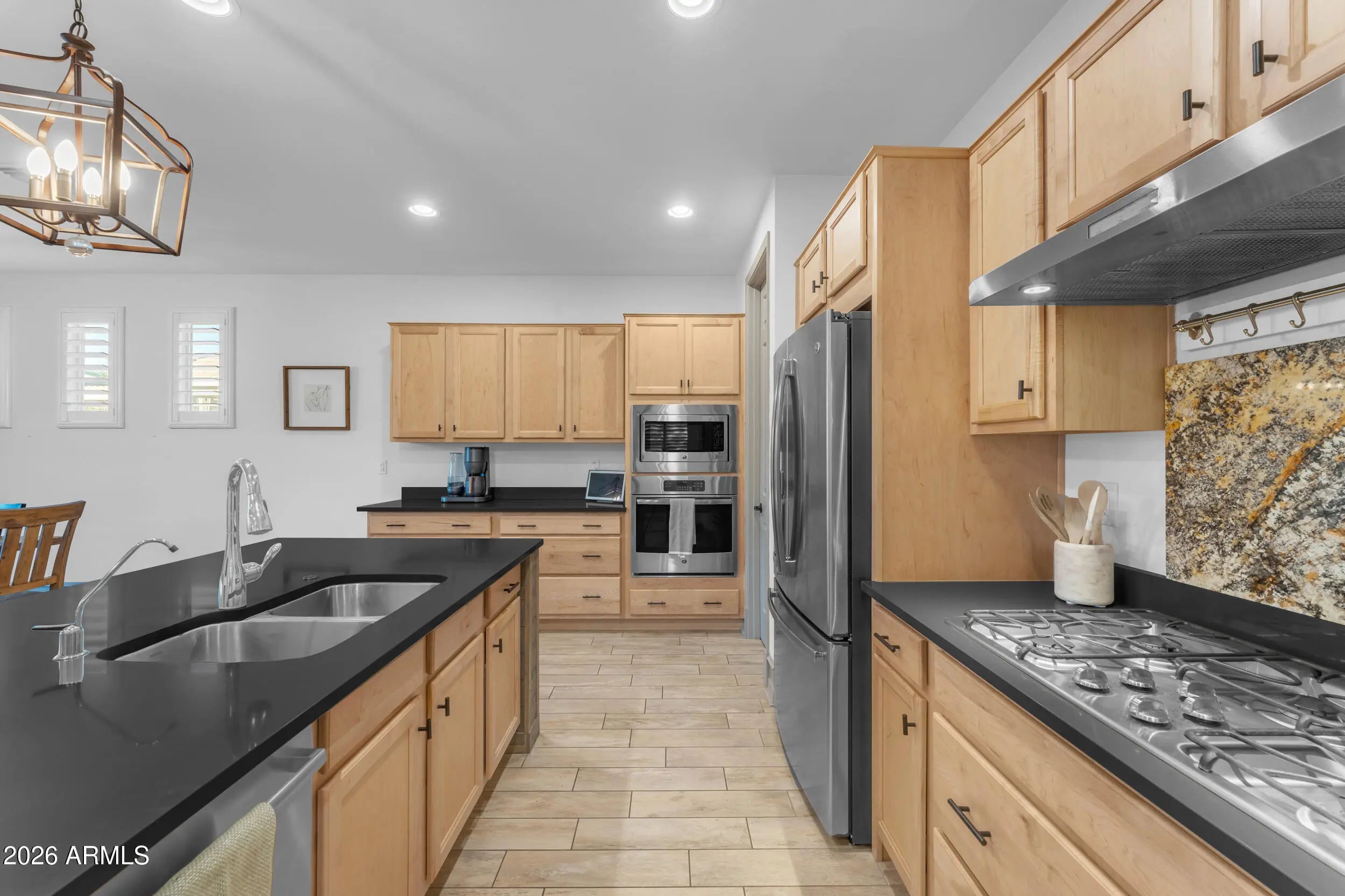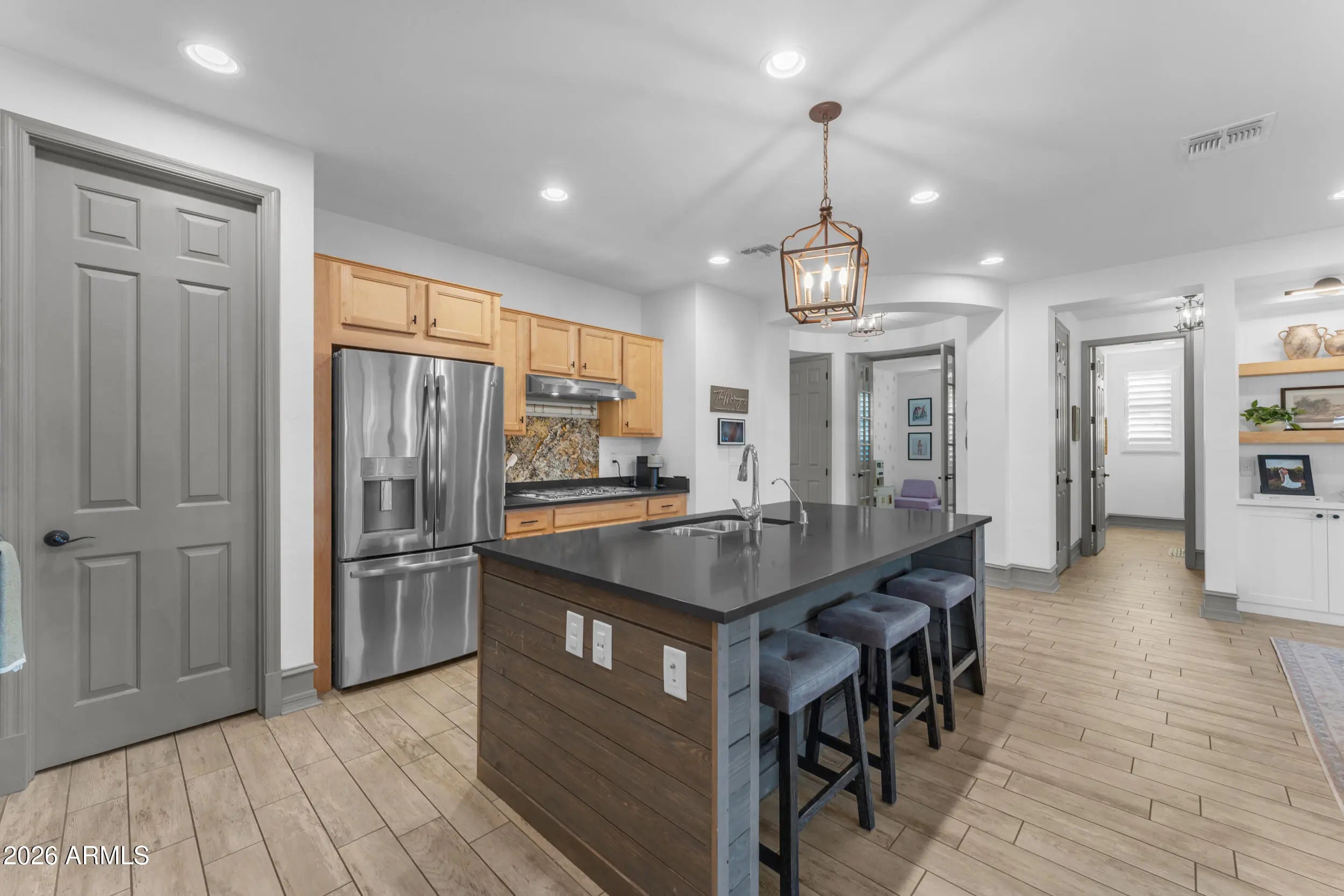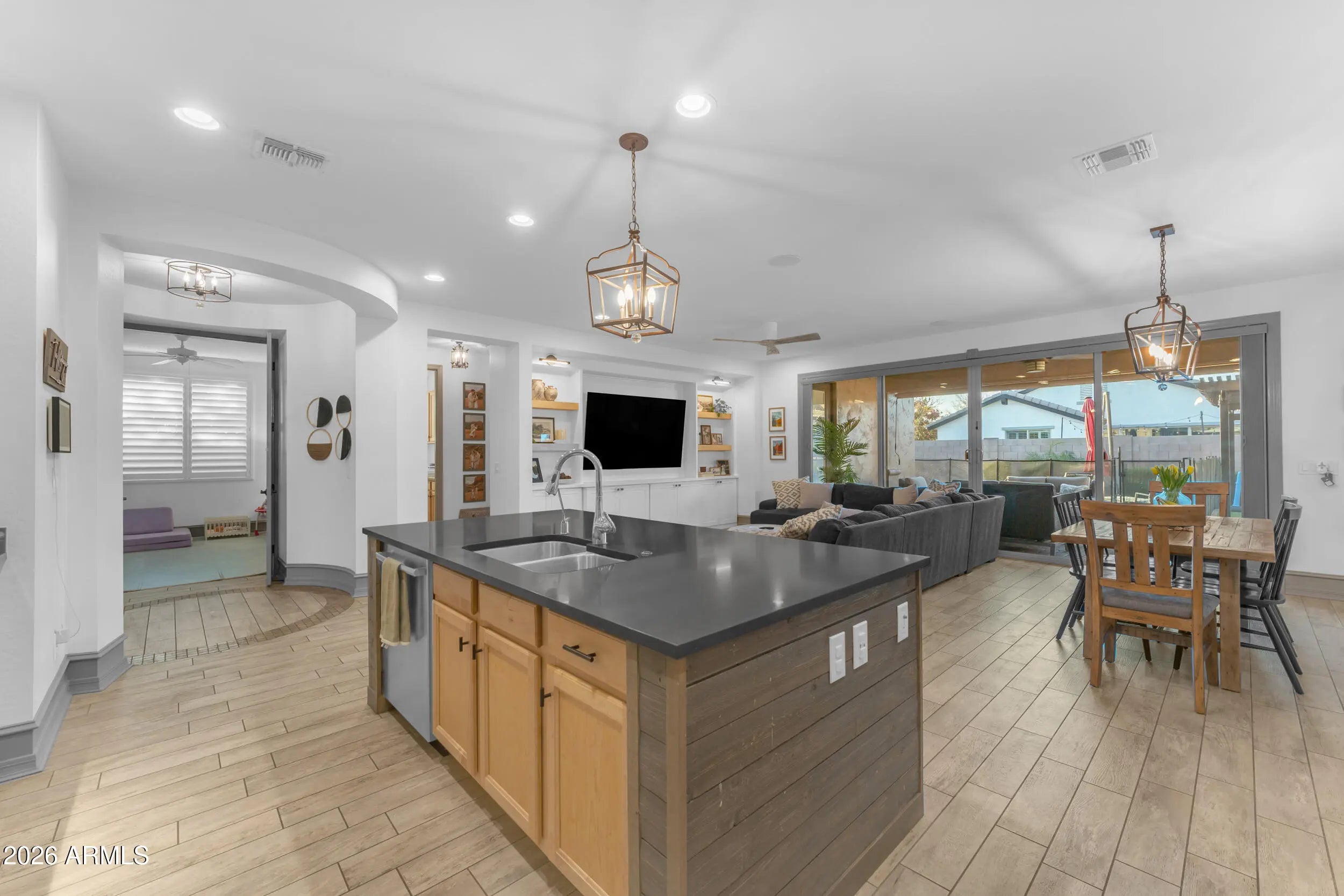 Located on a premium corner lot in the sought-after Queen Creek Station, this refined 3-bedroom, 2-bath residence with a private den offers nearly 2,000 square feet of thoughtfully curated living—just minutes from Queen Creek Marketplace for dining, shopping, and everyday conveniences. Fresh exterior paint delivers instant curb appeal, setting the tone from the moment you arrive. Inside, the home is light-filled and polished, anchored by wood-look ceramic tile, upgraded trim, and a custom-designed built-in in the living room that blends form and function with effortless style. The open-concept layout is ideal for both elevated entertaining and relaxed everyday living. The chef's kitchen features quartz countertops, upgraded cabinetry, and stainless steel appliances, creating a clean, modern aesthetic that feels timeless and intentional. The den, framed by French doors, offers a flexible retreatperfect for a home office, lounge, or guest space. A dramatic 16-foot atrium-style sliding glass door, paired with an automated shade, creates seamless indoor-outdoor flow while offering privacy and light control at the touch of a button. The backyard is a true private escape, centered around a saltwater pool with updated equipment. A commercial-grade misting system keeps the space cool and comfortable, while the tranquil pergola completes the resort-style setting. For today's lifestyle, the home also includes a Tesla EV charger, blending modern convenience with forward-thinking design. Impeccably maintained, thoughtfully upgraded, and positioned for both lifestyle and location,this home delivers sophistication, comfort, and everyday luxury in one exceptional package.
