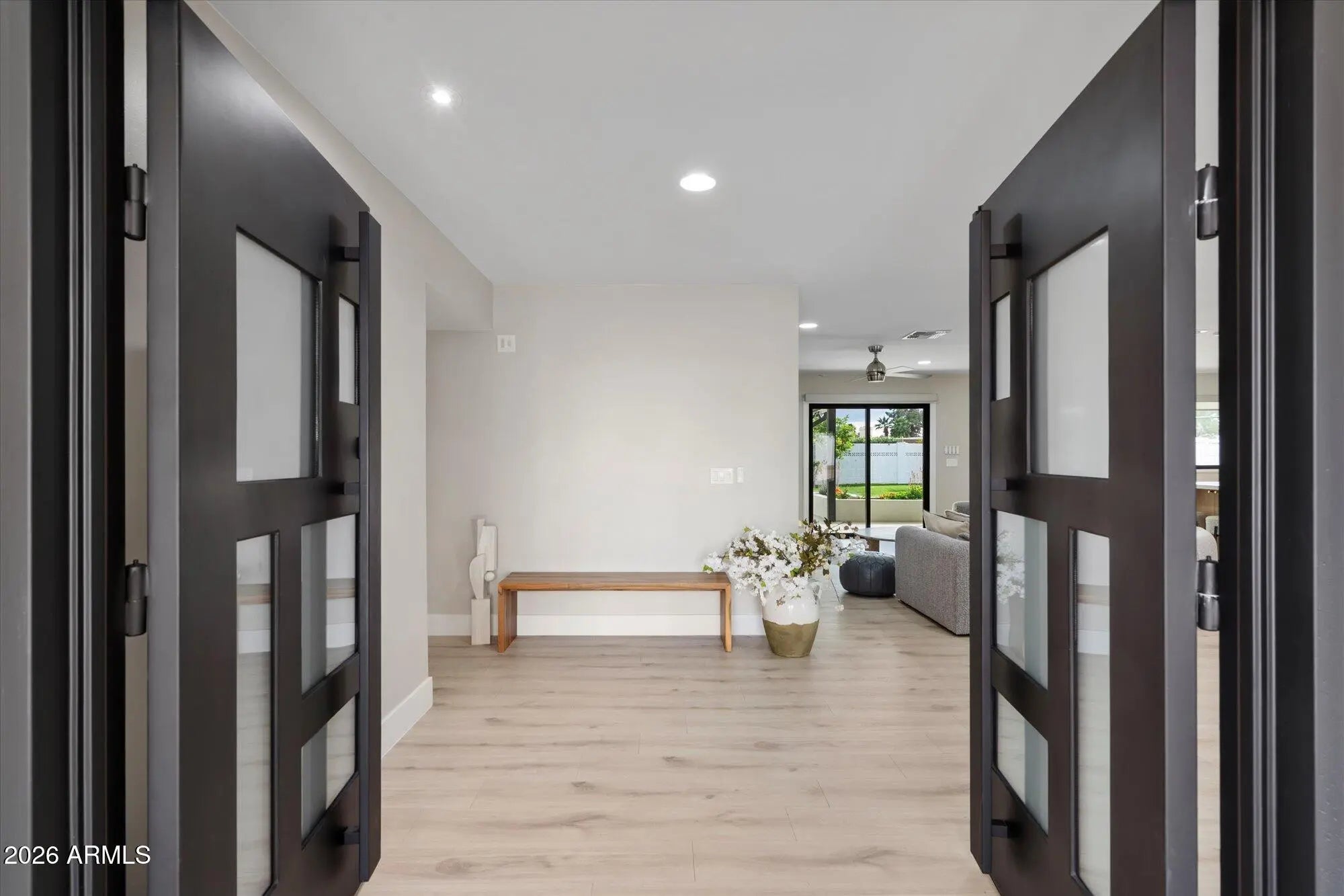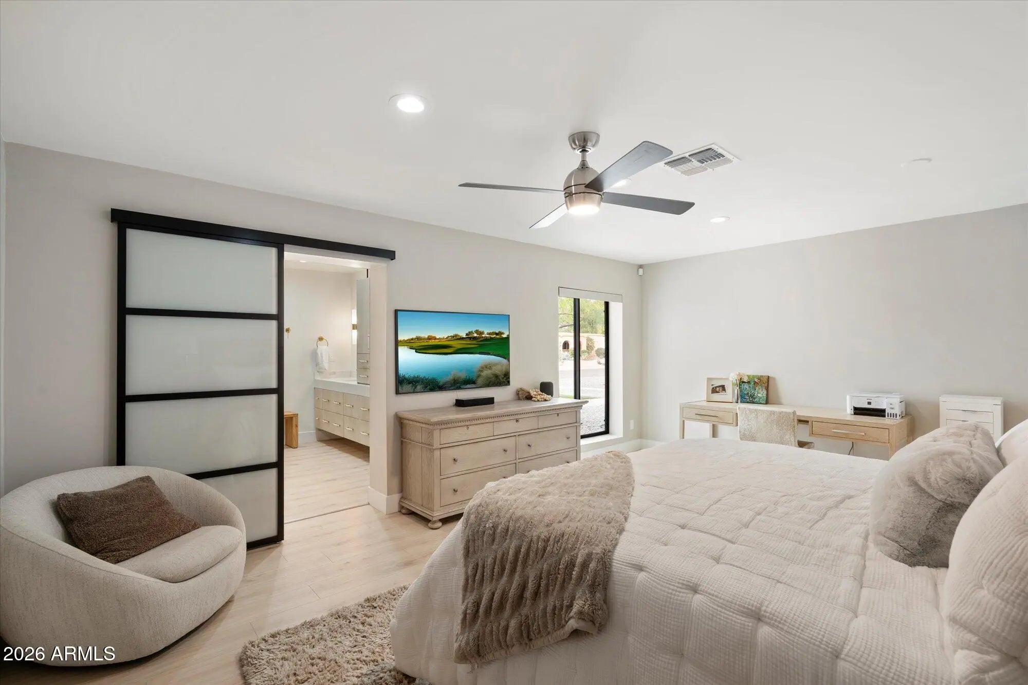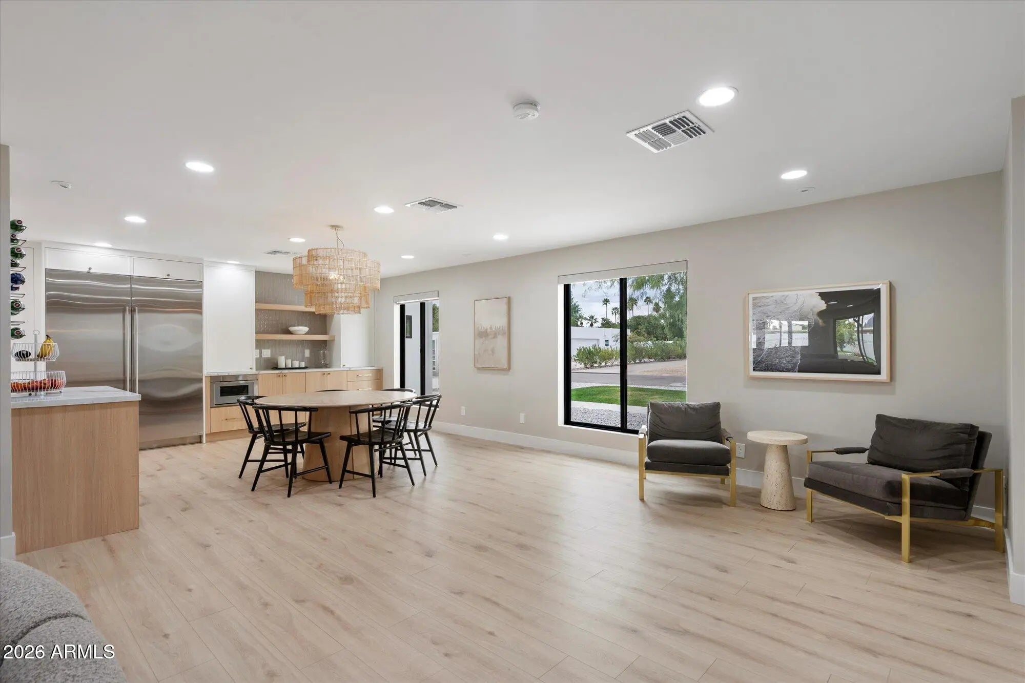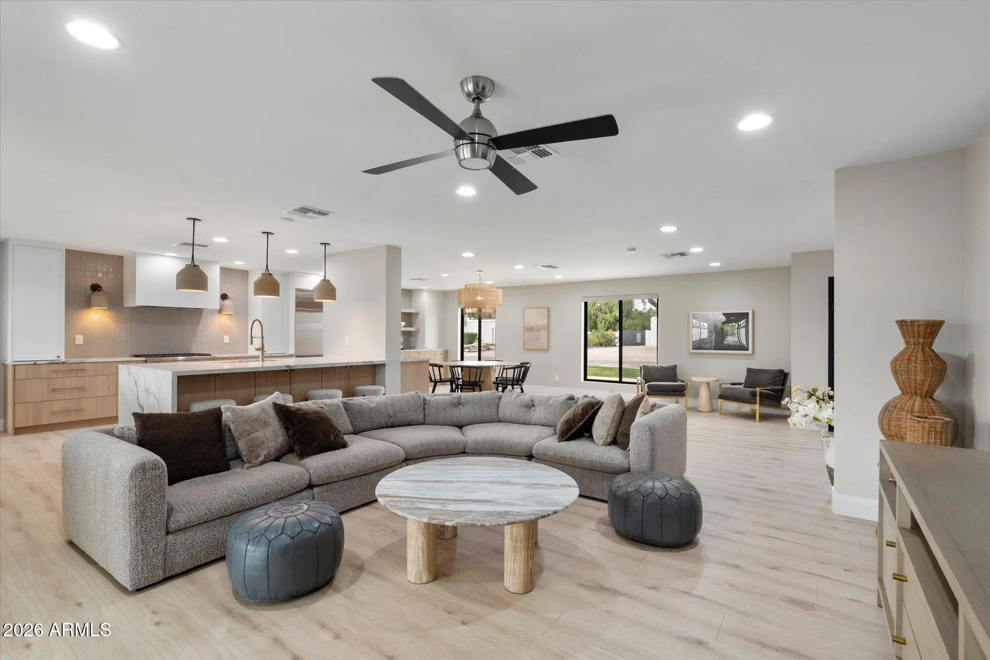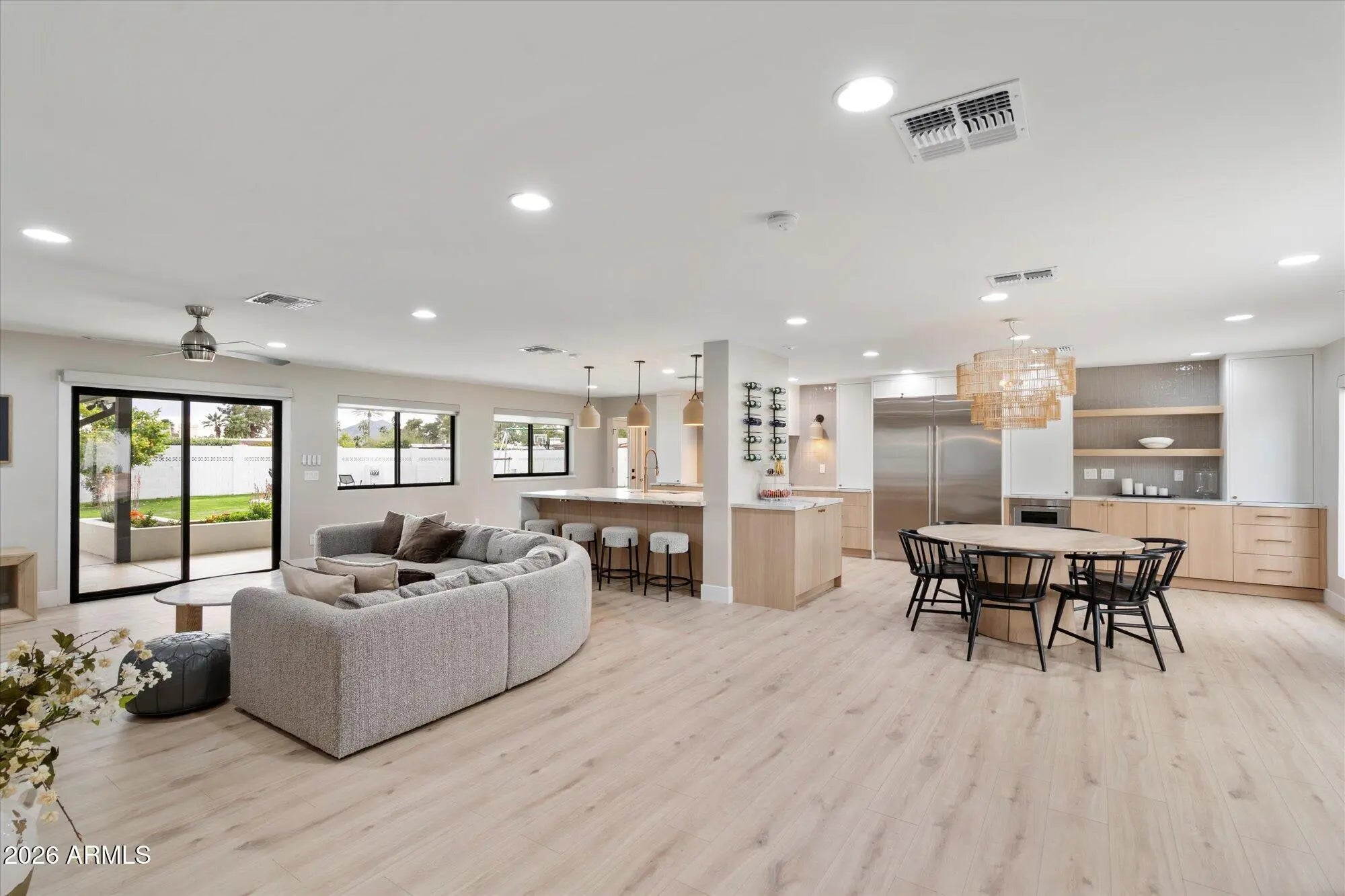 Welcome to this single-level home w a high-end $650,000 renovation in a desirable location w no HOA, delivering modern luxury & structural improvements throughout from 2024-2026, including structural work, full kitchen & bath rebuilds, & major systems such as roof, A/C, plumbing & electrical. This designer-grade home offers open floor plan living w two split primary suites w AZ designer closets, 3 additional bedrooms, plus a workout studio/office, w new flooring, lighting, shades & fans throughout. At the heart of the home is a $125K full custom kitchen featuring a custom wine wall, quartz countertops w a waterfall edge island, Sub-Zero fridge & KitchenAid appliance suite. Bathrooms offer designer finishes, w multiple programmable toilets. Additional highlights include a climate-controlled garage w epoxy floors, oversized covered patio w outdoor TV & speakers, grass backyard & Tuff Shed. A rare opportunity to own a comprehensively renovated, move-in-ready home w thoughtful design, quality craftsmanship & modern comfort.
