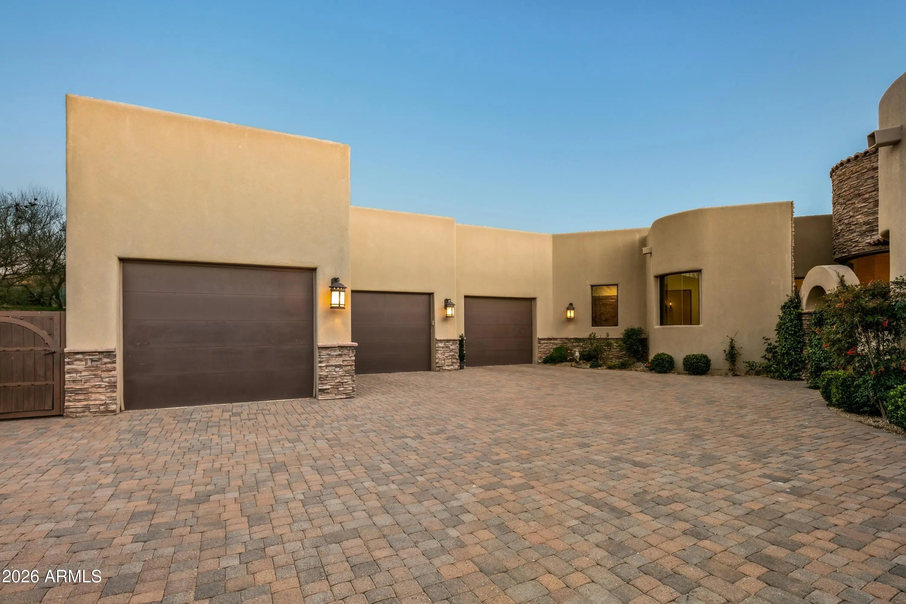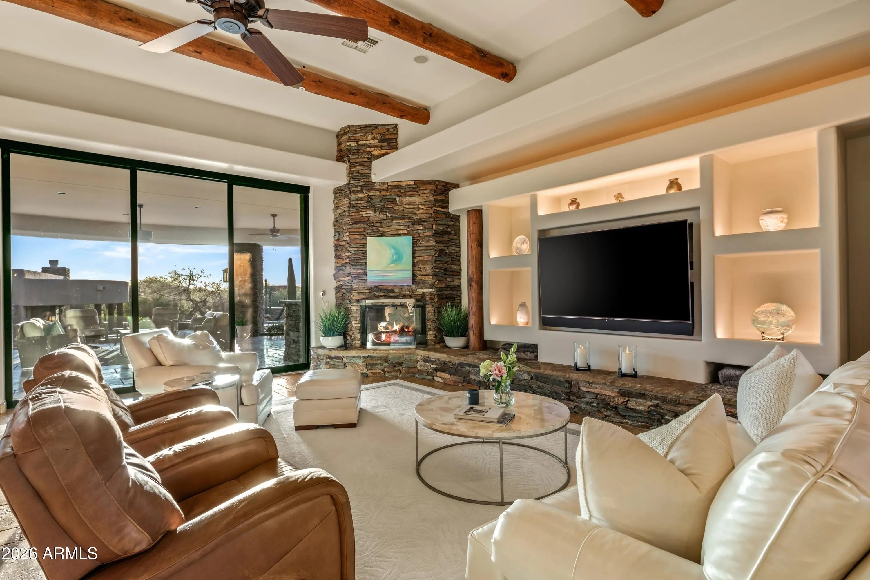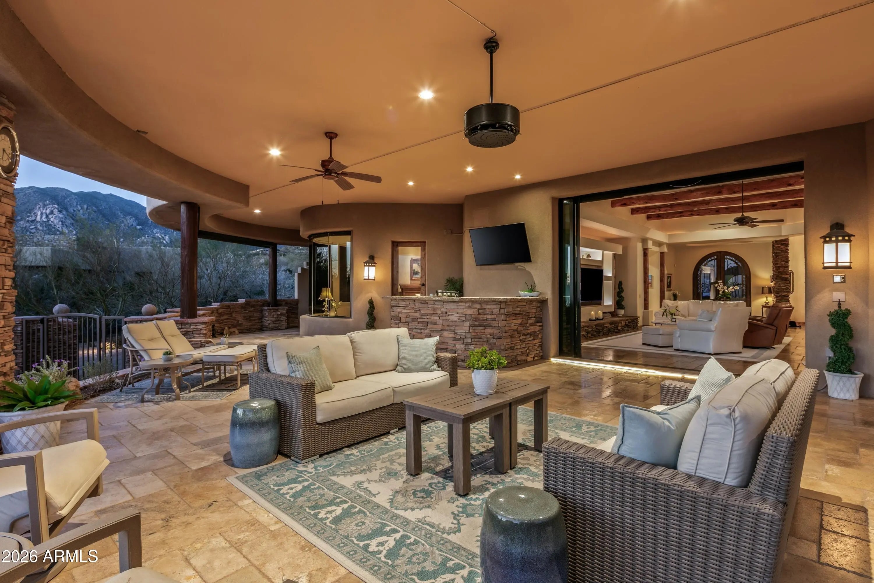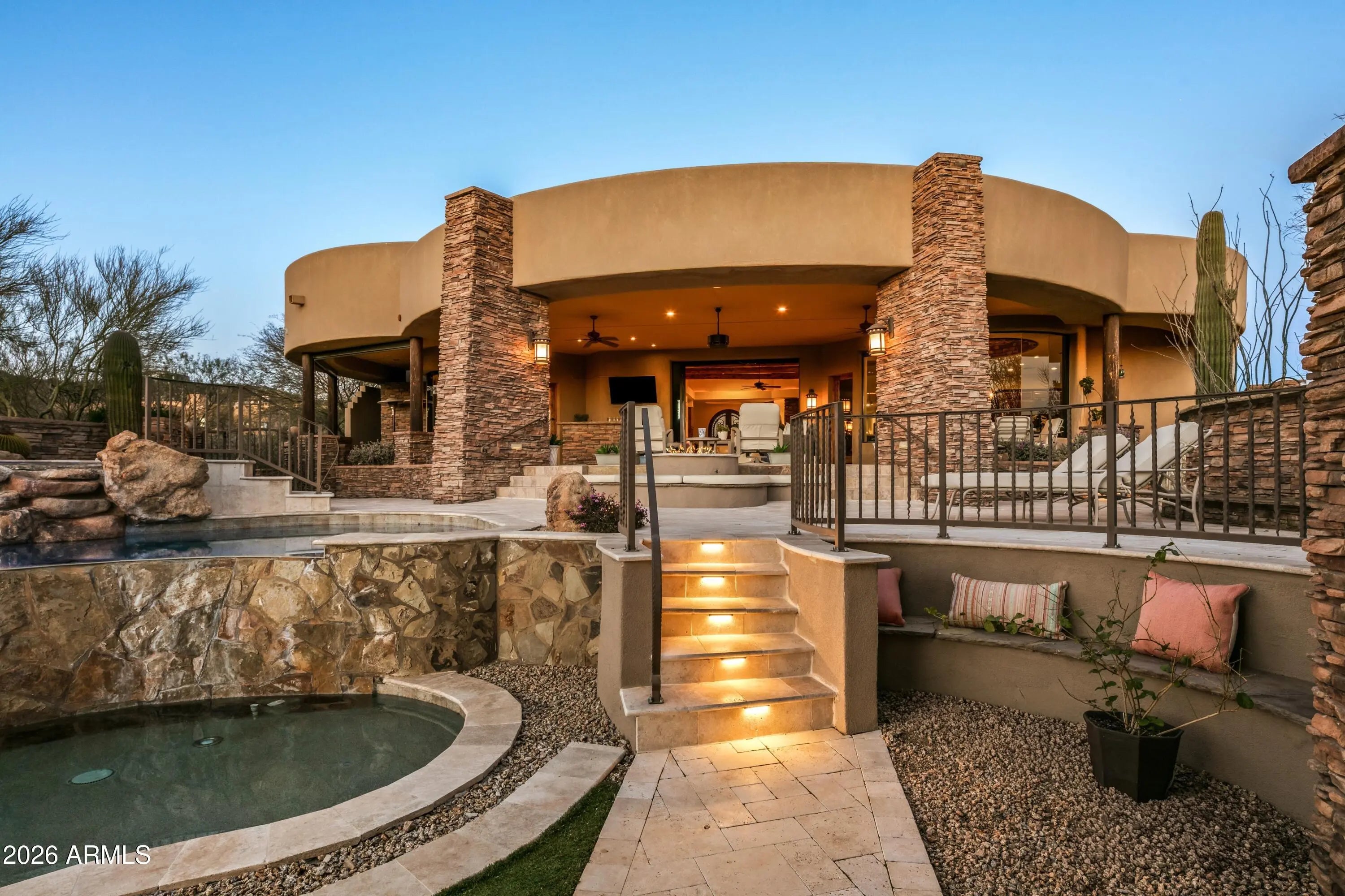 Golf Membership Available- Located in Desert Mountain's Upper Village of Apache Peak- Experience the essence of Desert Southwest Contemporary living in this remarkable residence, where modern sophistication meets the effortless comfort and fun of year-round outdoor enjoyment. Curved architectural lines define the home's character, creating a harmonious flow from room to room and encouraging a relaxed, open lifestyle. The outdoor environment lives as its own destination. A sweeping 1,600-sq-ft curved patio forms a seamless extension of the interior, promoting true one-level indoor/outdoor enjoyment. Here, conversation spaces, mountain vistas, and vibrant sunsets set the backdrop for alfresco dining, enhanced by a convenient wet bar just steps away. For a spectacular sunset experience head up the spiral staircase to the spacious roof-top deck for a panoramic 360 degree view of the southern hemisphere. Back to the main level, a few gentle steps down, gather around the firepit or unwind in the elevated spa with its water feature spilling into the pool below. The lower level continues the resort experience with the receiving pool, a golfer's putting green, and a private freestanding casitacomplete with den/bedroom with fireplace, mini-kitchen, full bath, and its own washer and dryer to ensure the ultimate guest comfort. Inside, the home centers around a flowing great-room design, where a mechanical telescoping glass wall fully opens to the resort yard. The U-shaped chef's kitchen, appointed with custom cabinetry, luxury appliances, and a generous island with bar seating, invites conversation as effortlessly as it supports culinary excellence. An open wet bar with seating and a walk-in, temperature-controlled wine cellar sets the stage for celebrations both grand and intimate. For formal gatherings, the dramatic dining roomframed with stone columns and crowned by a brick-dome ceiling and chandelieradds unforgettable ambiance. The palatial primary suite offers a private retreat with its own sitting area, mitered-glass windows, patio access, and a striking floor-to-ceiling stone fireplace. The spa-inspired bath features double vanities, two custom designer closets, a soaking tub, and a steam rooman oasis designed for unhurried serenity. A dedicated office with wood-plank flooring and built-in cabinetry is accessible from both the main corridor and the primary bath. Two well-appointed guest ensuites provide comfort and privacy, while a media room with six oversized theater chairs and large-screen TV delivers an immersive entertainment experience. Architectural artistry continues throughout with circular pueblo-style elements, stucco and stacked-stone columns, chiseled-edge tile floors, luxurious low-pile carpeting, quartz counters and vanities, carefully selected fixtures and chandeliers, and soaring ceilings highlighted with dramatic cove lighting. Recent updates introduce refreshed finishes that elevate the home even further. Located in the coveted Desert Mountain communityfeaturing seven golf courses, seven clubhouses, eight restaurants, 24 miles of private hiking trails, and proximity to the Tonto National Forestthis residence stands as a testament to inspired desert living. A place where beauty, comfort, and lifestyle come together effortlessly, inviting you to live each day to the fullest in North Scottsdale's most desirable setting.