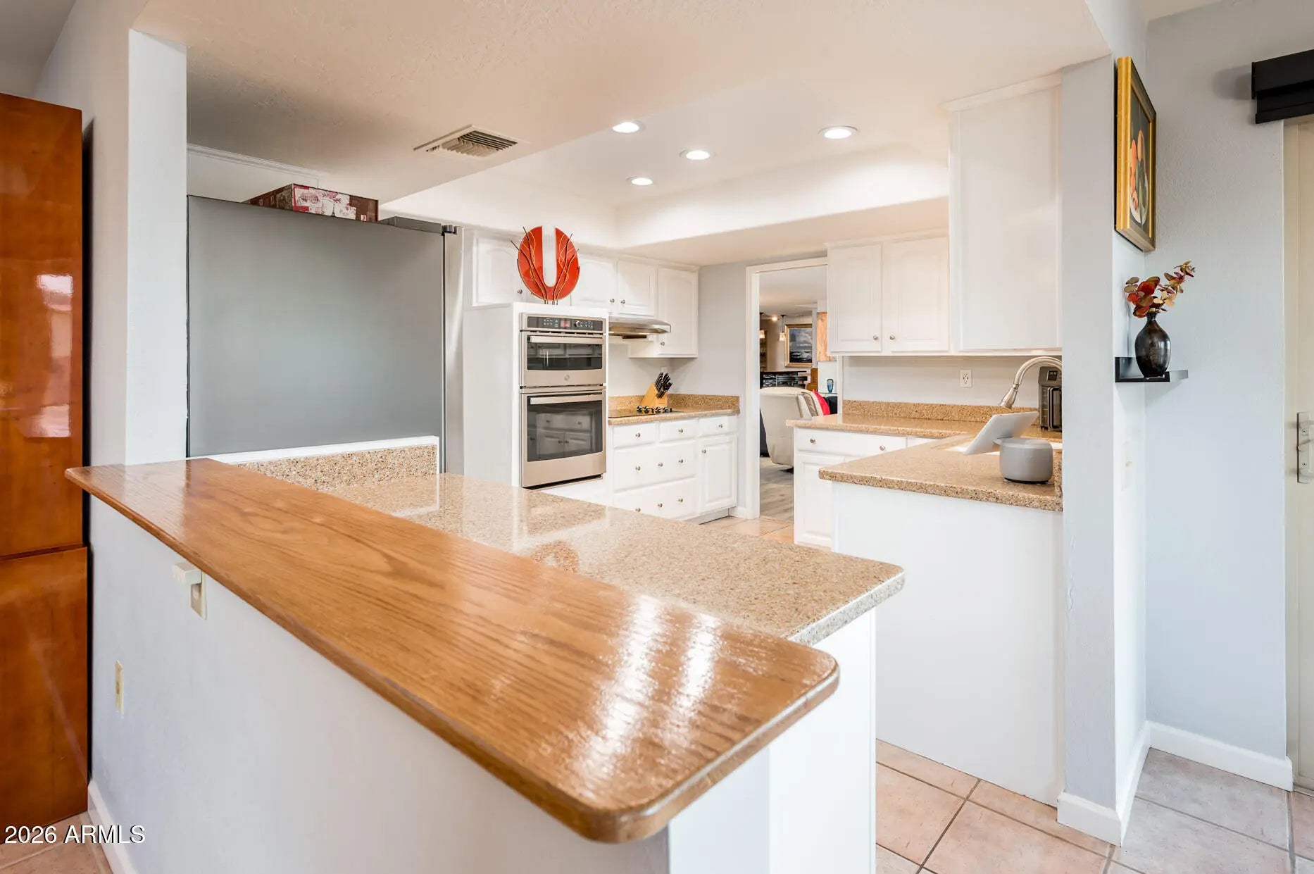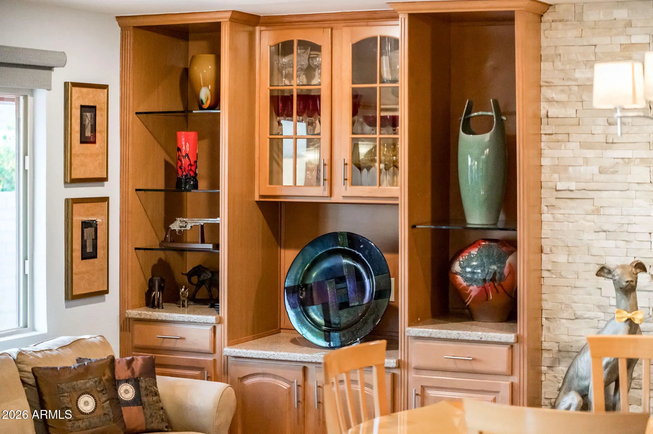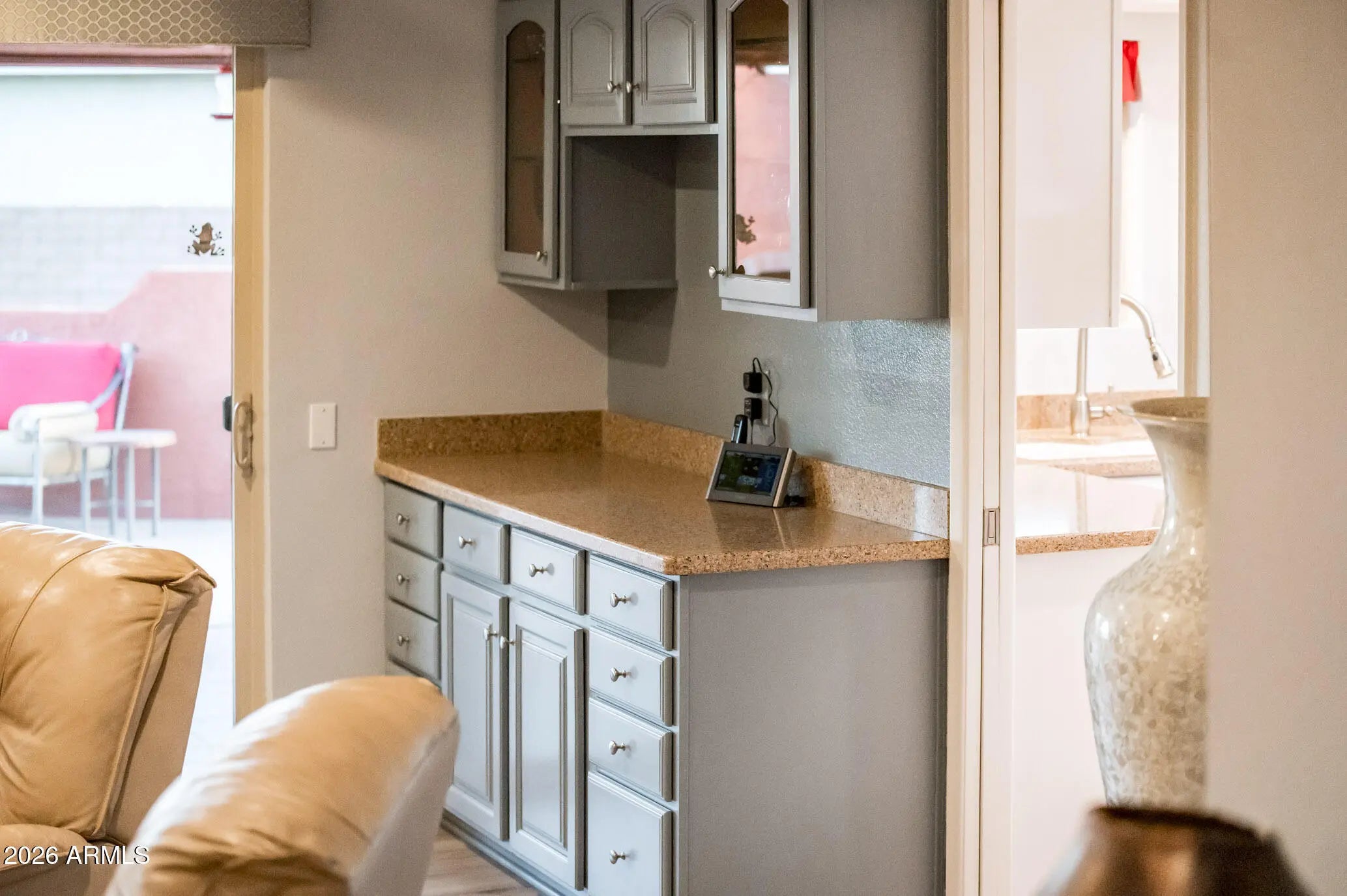 A reimagined and beautifully upgraded Seville Model, this residence blends custom high end finishes with an exceptional level of privacy on one of Sun City West's premier oversized cul de sac lots. Thoughtfully reconfigured, the home offers 3 Bedrooms, 2 Baths, an elegant Great Room with luxury built-ins, and a versatile Dining/Family Room anchored by a charming fireplace. A lavish bar area with private front courtyard access, great for entertaining or relaxing. The Primary Suite features its own private access and a spa inspired bath remodeled in 2019 with custom cabinetry and a beautifully redesigned shower. The Guest Bath received a full renovation in 2021, including a stylish walk-in shower. Flooring throughout the home was updated in 2016, adding to the cohesive, upscale feel. The kitchen is a true standout, finished with Silestone countertops, updated appliances including a wall oven and microwave (2021), refrigerator (2020), and a new cooktop and range hood (2022). Directly connected is an impressive custom walk-in pantry, designed with extensive storage and organization in mind, elevating both function and luxury for the home chef. Major mechanical updates include a 5 ton heat pump installed in 2022 with a 10 year warranty, addition of attic insulation. roof underlayment replaced in 2008 while maintaining the original tile for timeless appeal and replacement of the Hot Water Tank in 2021 Outdoor living shines with a covered patio, expanded paver terrace, and an inviting outdoor fireplace perfect for year round enjoyment. The private front courtyard enhances the home's welcoming presence and provides additional indoor outdoor flow. A rare opportunity to own a custom enhanced, meticulously maintained home in one of the most desirable pockets of Sun City West.