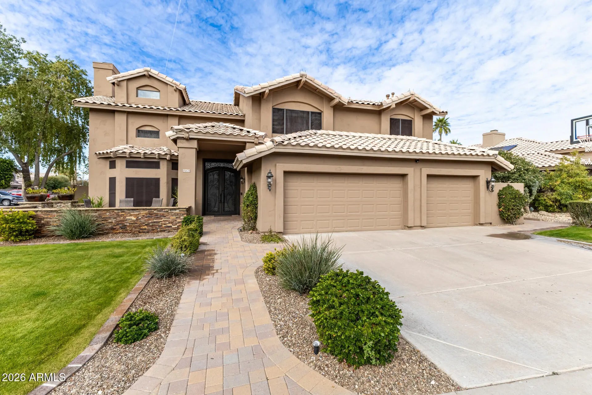CUSTOM HOME! Multiple offers received. Exquisite, corner-lot home in sought-after arbor Island. A custom courtyard and custom entry door welcome you to a light-filled interior w/ vaulted ceilings, plantation shutters, and cozy fireplace anchoring the living room. Entertain in the formal dining room or relax in the family room, both flanking an updated kitchen w/ stainless steel appliances, plentiful rich wood cabinetry, dining nook, granite counters, and tile backsplash. Custom Arcadia doors open to a resort-style backyard featuring a covered patio, built-in BBQ/bar, seating area w/ fireplace, and diving pool w/ rock waterfall. Upstairs offers three bedrooms, loft w/ built-in library, and a primary suite w/ balcony, spa-like bath, dual sinks and cedar-lined walk-in closet. See More... The finished basement has a bedroom and full bath, bonus room, and media room with TV/surround sound. Built-in garage storage completes this exceptional family home. Come see it!