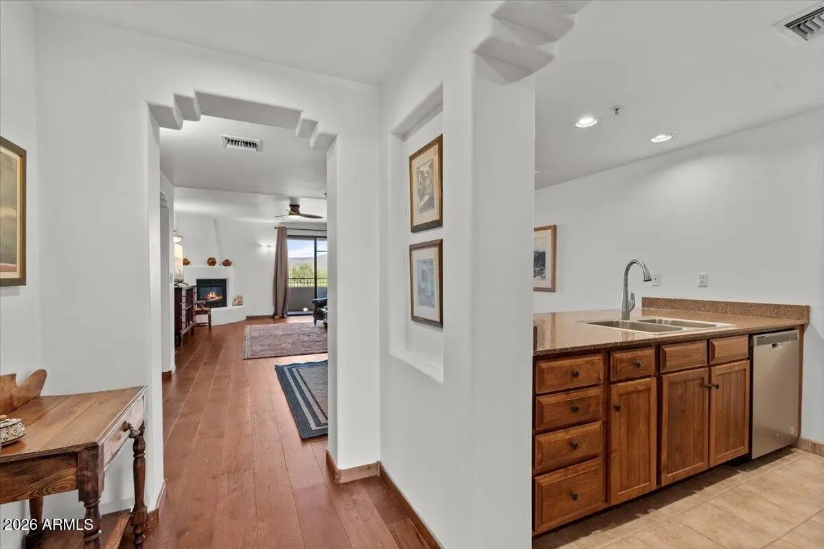 LEASED FEB-MAY 2026. Spectacular Panoramic Mountain & Golf Course Views in a gorgeous natural desert setting! This perfectly positioned upper-level condo offers breathtaking views from every room & patio. Recently updated w/ new furnishings & hardwood floors, this delightful residence comes fully furnished, offering a large & versatile floorpan w/ two spacious master suites & a second living/family room. A short stroll to the fabulous community amenities which include a large resort style pool, spa, putting green, & newly remodeled clubhouse. The community offers many social activities & gatherings. Walking distance to Civana Wellness Resort & Spa & the lovely town of Carefree. Less than 2 miles to historic Western downtown Cave Creek w/ many restaurants, bars & shopping options.