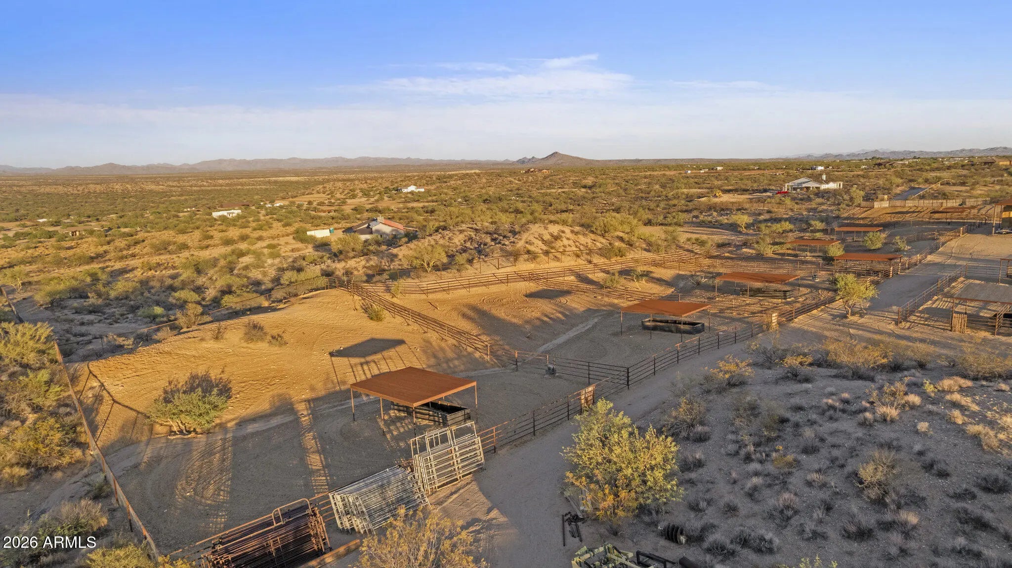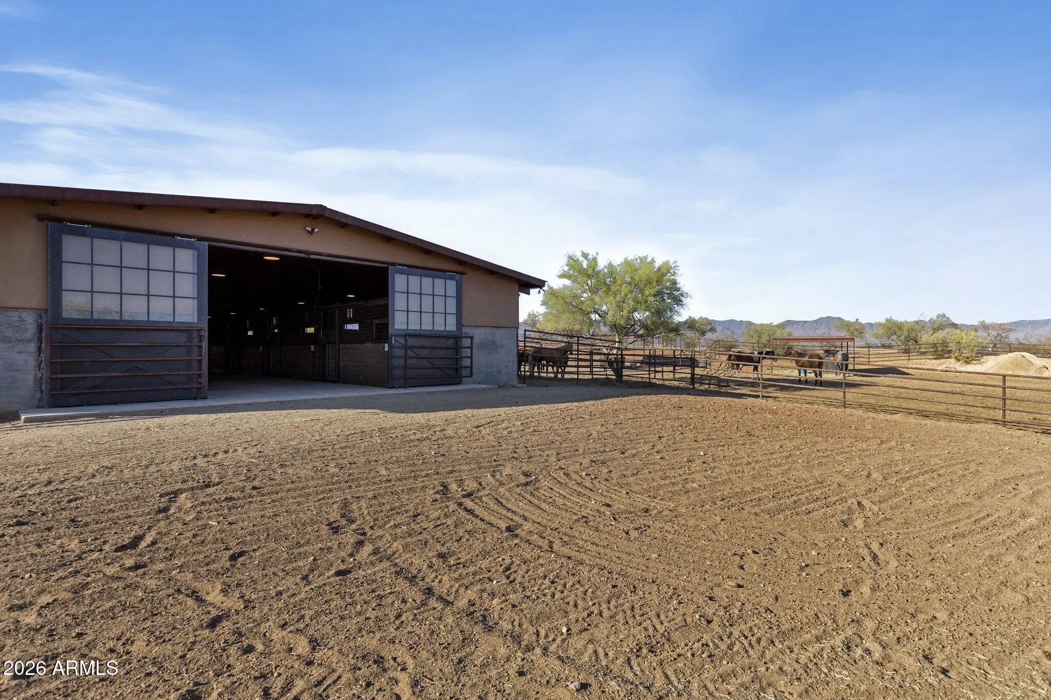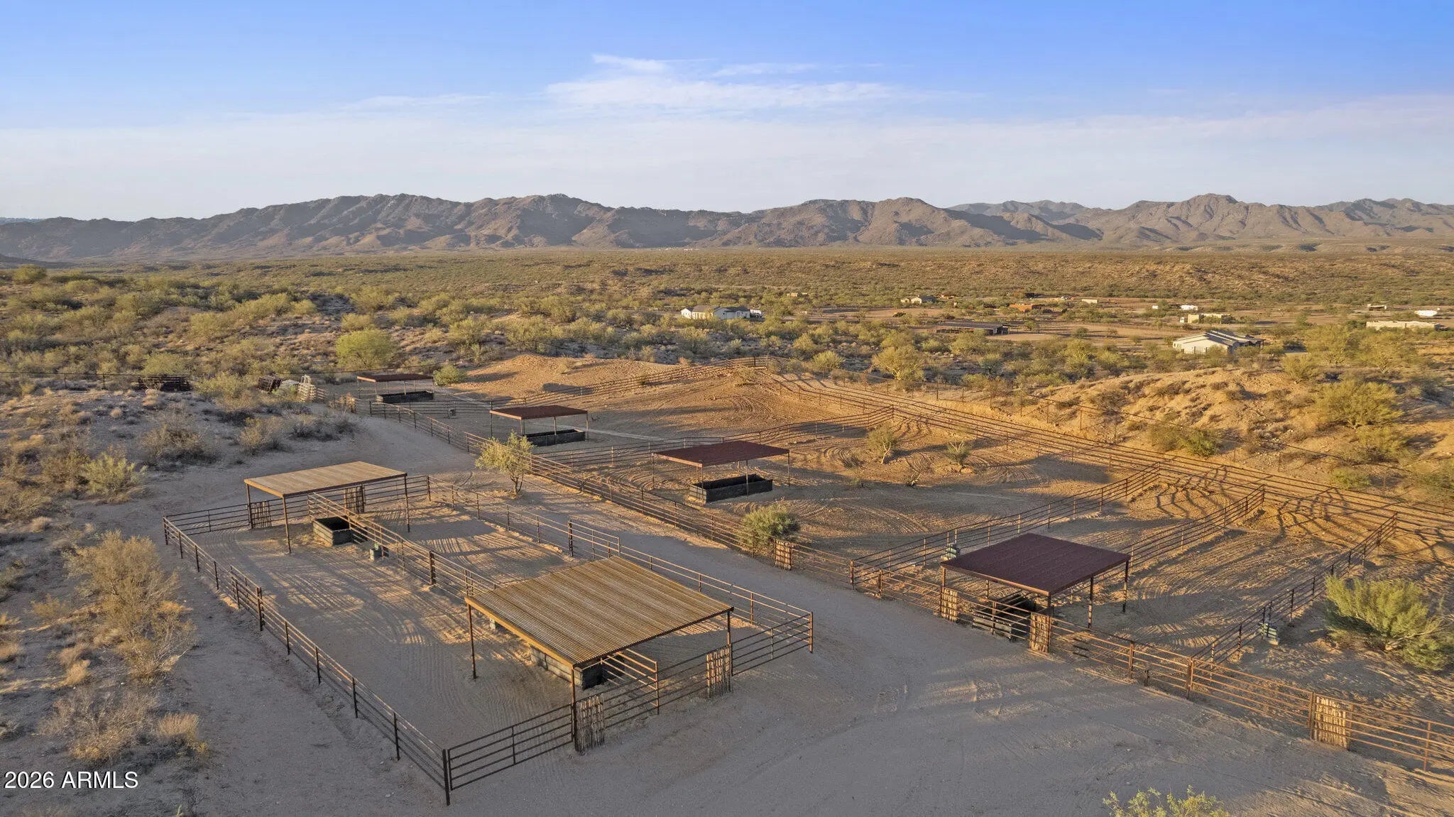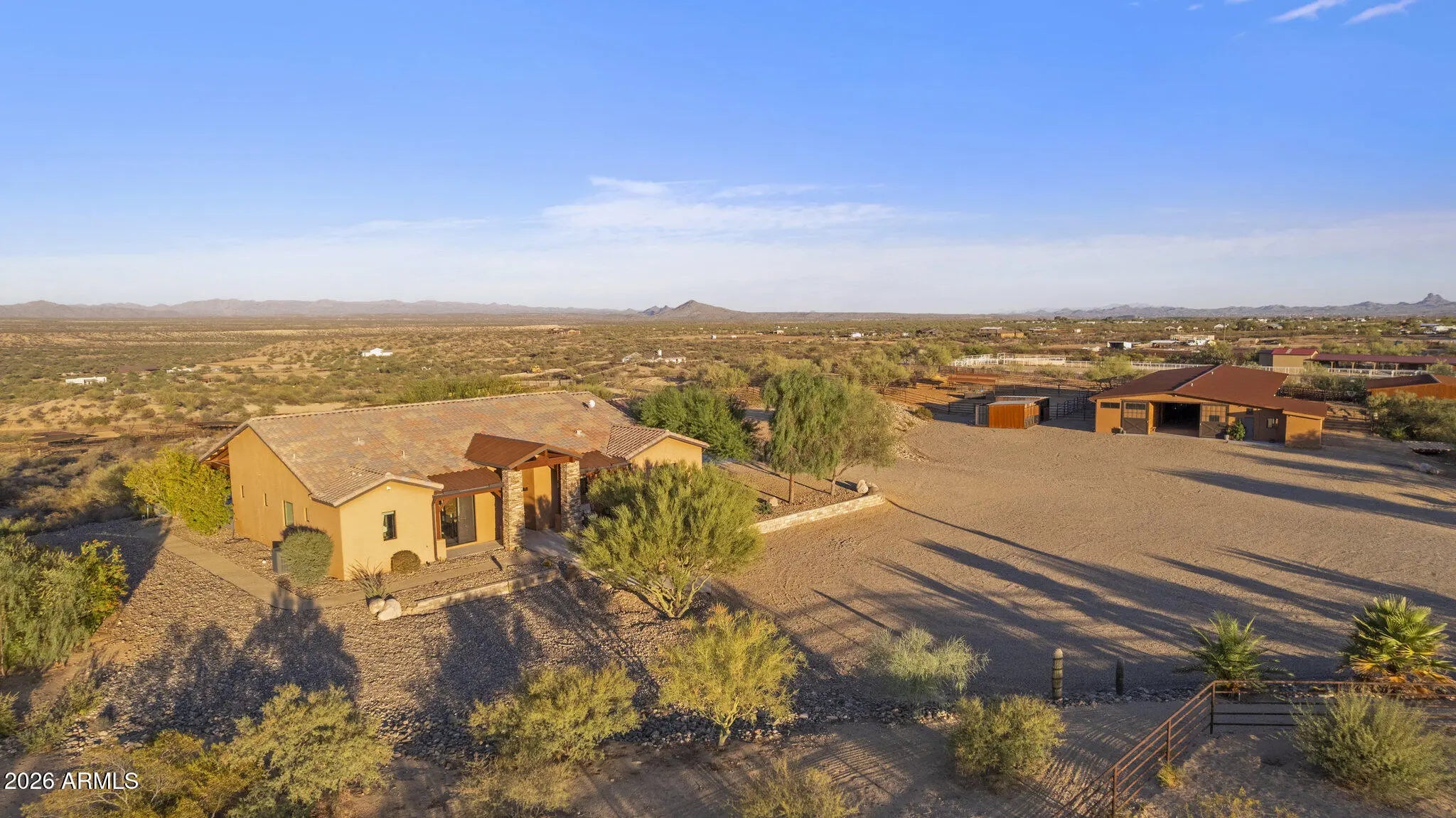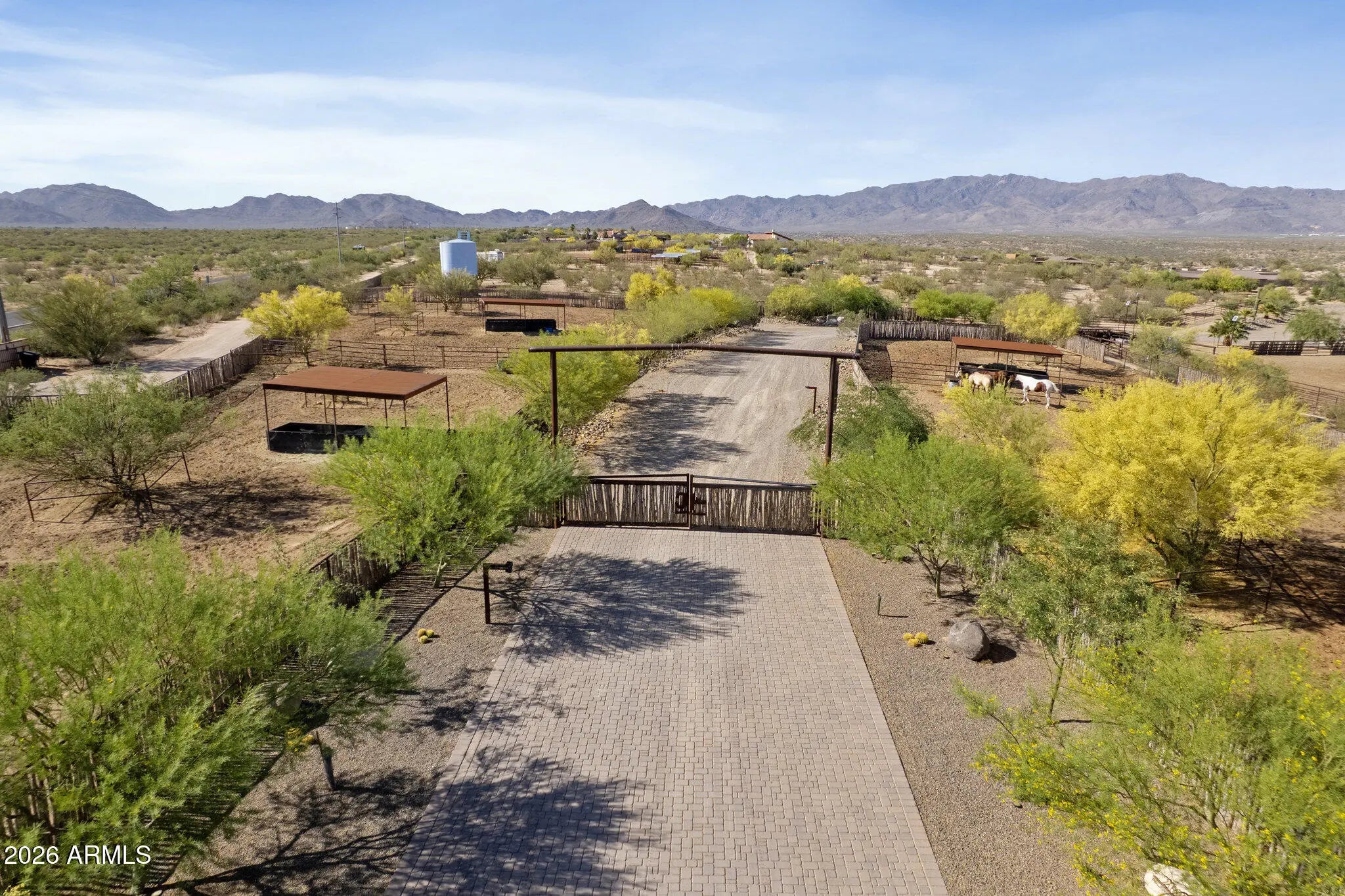 Gated 17.6-acre private equestrian ranch near Wickenburg with breathtaking mountain and desert views and no visible neighbors. This secluded luxury horse property is ideal for ropers, trainers, and show horse enthusiasts, offering a turnkey training facility and premier equine amenities. The 14-stall barn features 15x15 matted stalls with 15x20 runs, fans, heaters, equine performance lighting, and red light therapy. Two professional arenas include a 135x280 roping arena and ranch trail arena. Over 15 turnout pens provide ample space for horses and cattle. A highly rated well system supplies a 5,000-gallon holding tank with constant pressure pump. The 2018 custom home includes knotty alder cabinetry, gourmet gas range, and citrus grove. Bright interiors showcase unobstructed mountain views Room for multiple home sites and future expansion.