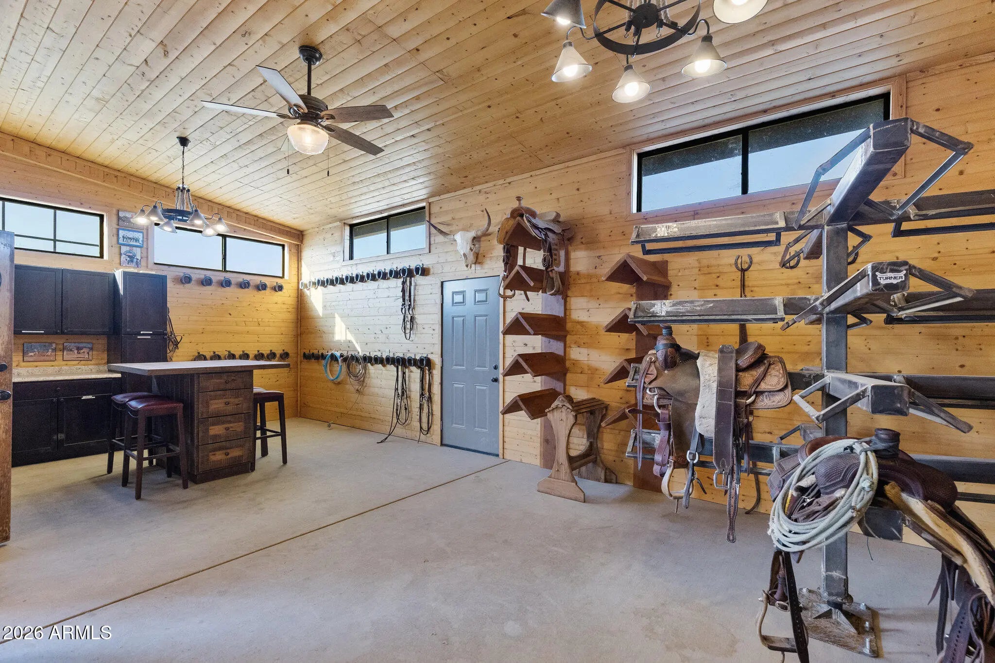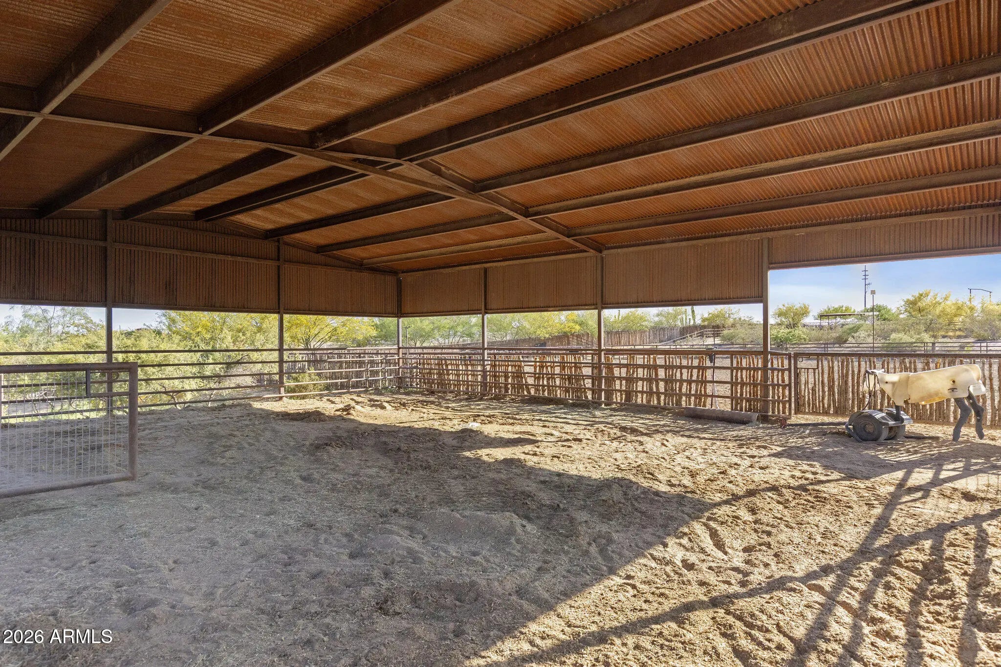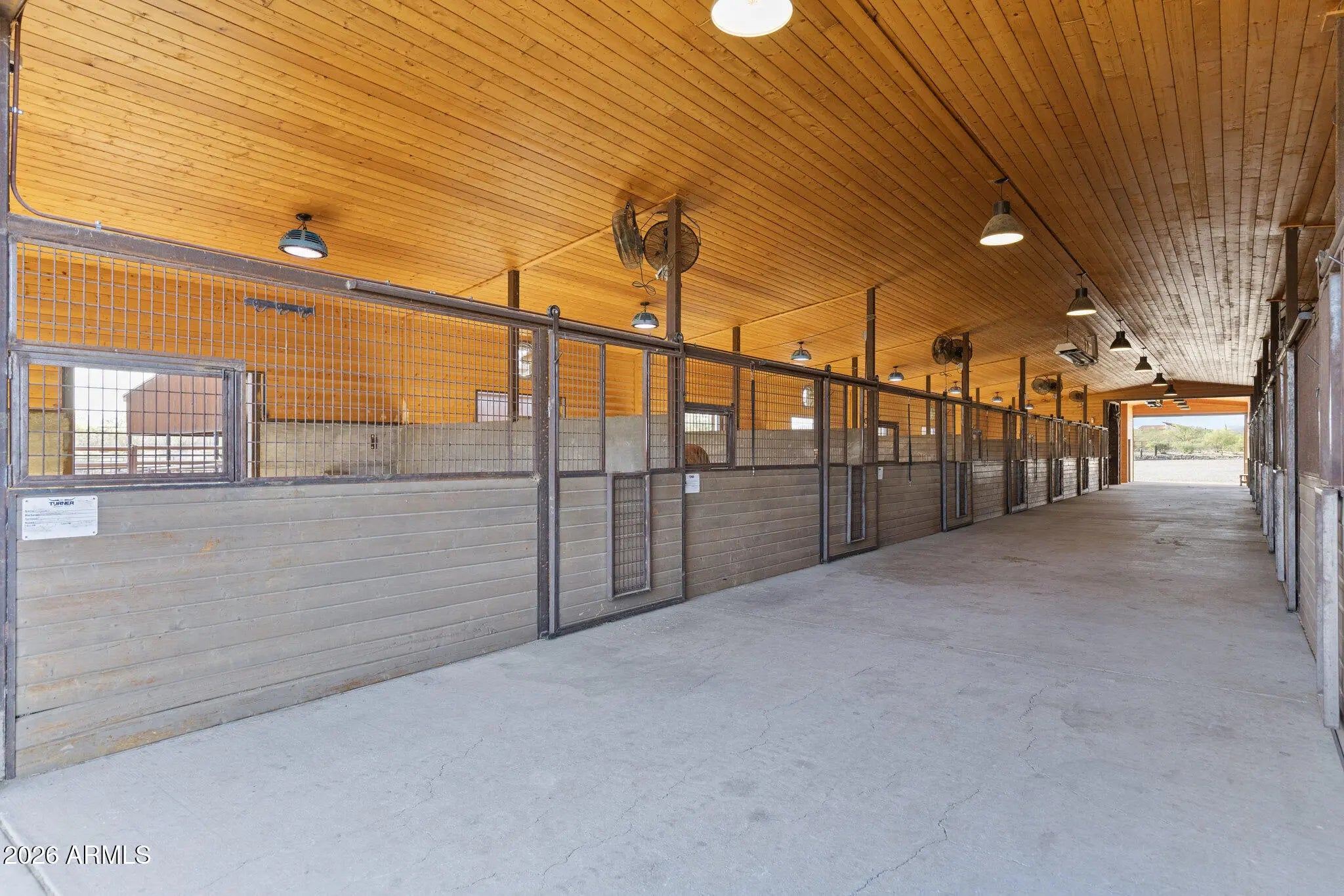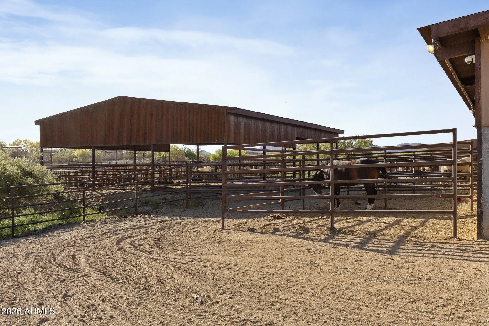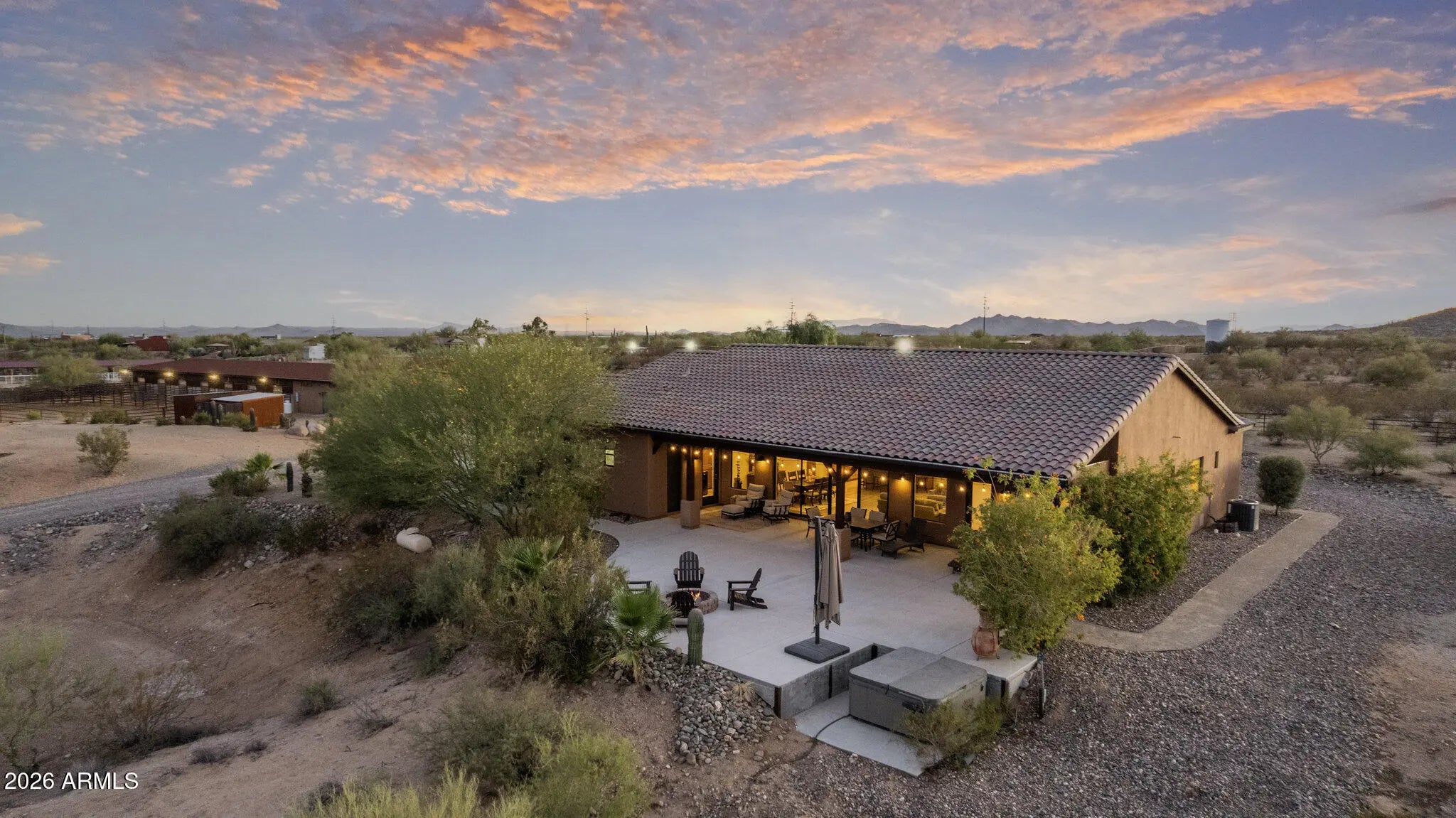 Gated 17.6-acre private equestrian ranch near Wickenburg with breathtaking mountain and desert views and no visible neighbors. This secluded luxury horse property is ideal for ropers, trainers, and show horse enthusiasts, offering a turnkey training facility and premier equine amenities. The 14-stall barn features 15x15 matted stalls with 15x20 runs, fans, heaters, equine performance lighting, and red light therapy. Two professional arenas include a 135x280 roping arena and ranch trail arena. Over 15 turnout pens provide ample space for horses and cattle. A highly rated well system supplies a 5,000-gallon holding tank with constant pressure pump. The 2018 custom home includes knotty alder cabinetry, gourmet gas range, and citrus grove. Bright interiors showcase unobstructed mountain views Room for multiple home sites and future expansion.