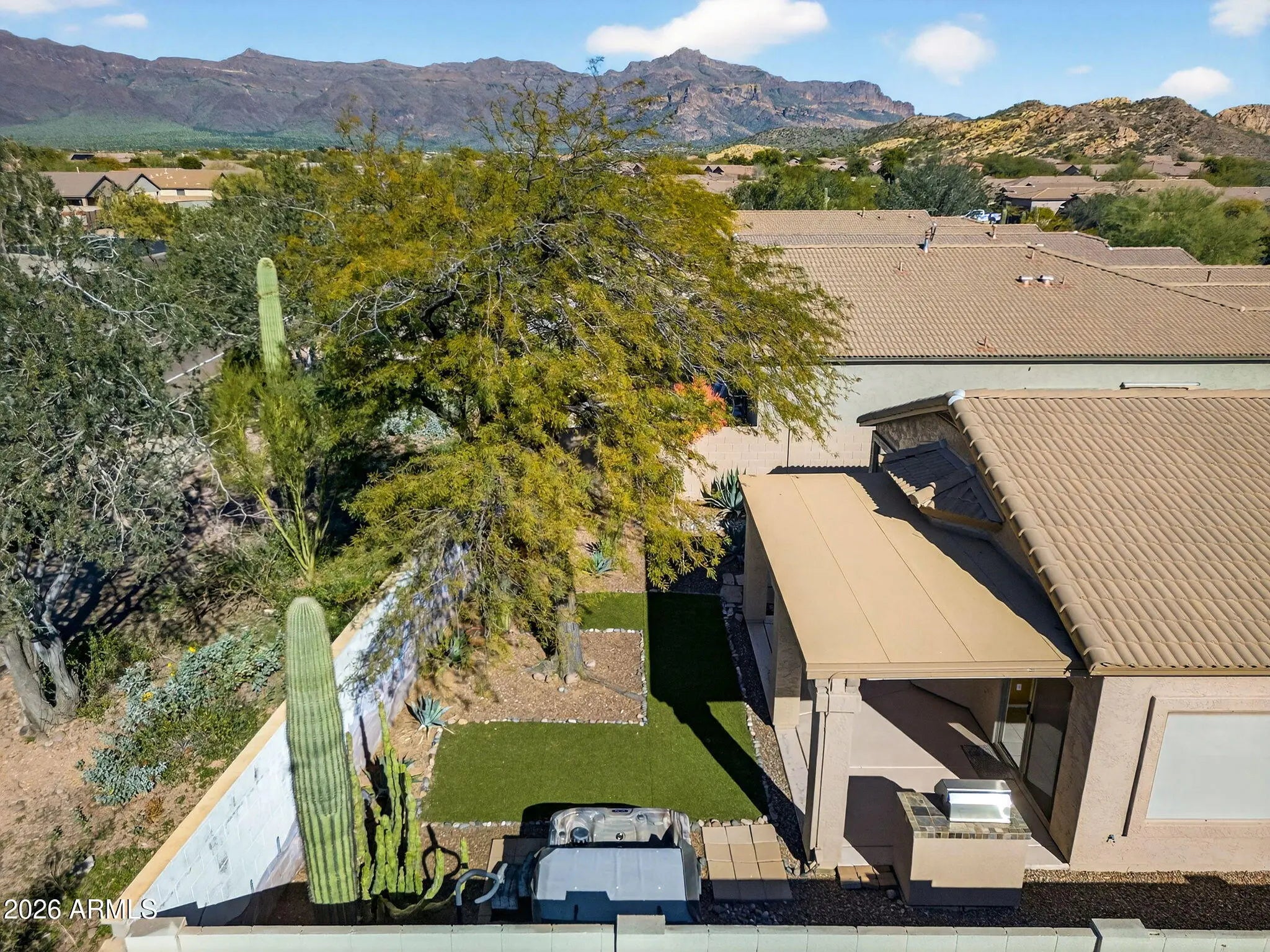 This 3br,2ba home in the heart of Gold Canyon, offers the perfect blend of comfort, convenience, and scenic surroundings. Enjoy beautiful mountain views and a prime location just moments from Superstition Mountain Golf & Country Club, ideal for golf enthusiasts and those who appreciate resort-style living. The home features a functional and inviting layout, with comfortable living spaces designed for everyday living and entertaining. Step outside to a private backyard retreat complete with a built-in BBQ and an above-ground hot tub, perfect for relaxing under the Arizona skies or hosting friends and family. Residents enjoy access to a community pool and walking trails, enhancing the active outdoor lifestyle Gold Canyon is known for. The location is hard to beat...walking distance to grocery stores and local restaurants, plus quick access to US-60, making commuting and travel throughout the Valley exceptionally convenient. Updates include: new exterior paint in 2024, new HVAC in 2021, water softener installed in 2024, all appliances purchased in 2020 and hot tub installed in 2020. Whether you're looking for a full-time residence, winter retreat, or low-maintenance lifestyle near golf, dining, and outdoor recreation, this home offers it all in one of Gold Canyon's most desirable settings.