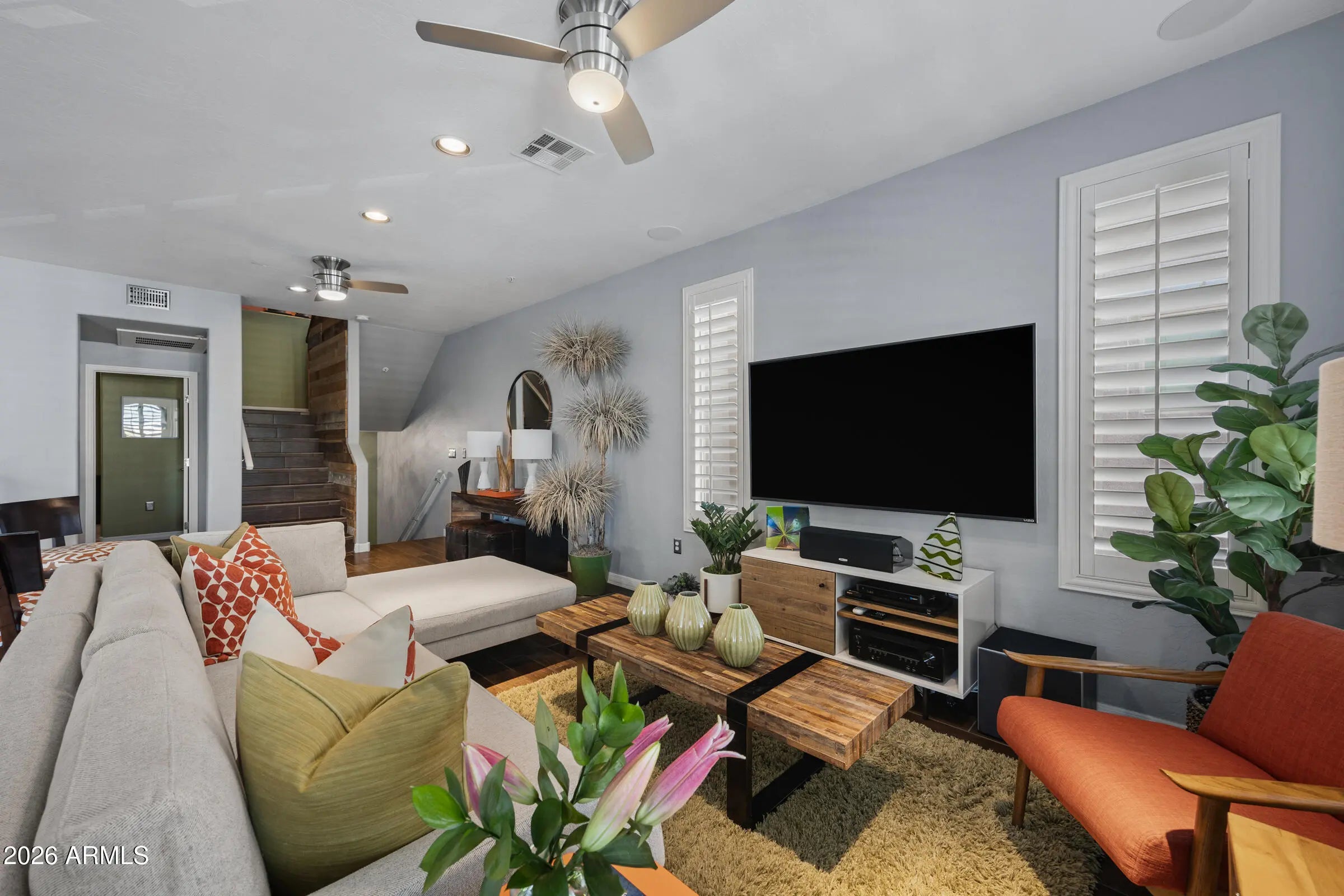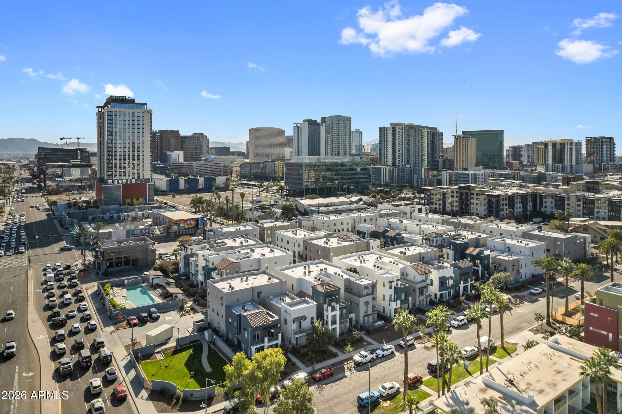 Highly upgraded 3-story townhome w/nearly 2,000 SF of refined urban living at 7th St & I-10. Designed for buyers seeking a lock-&-leave lifestyle w/elevated finishes & rare downtown conveniences. A fully remodeled kitchen, rich wood flooring, surround sound, shutters & dramatic second-level loft overlooks the main living area—ideal for a home office, studio, or additional lounge. All baths have been upgraded with tile & striking floor-to-ceiling glass. ALL THREE HVAC units were recently replaced & include full transferable warranty, providing peace of mind. Rare 2-car attached garage completes the package. Community offers DOG PARK comm pool, green space w/BBQ. HOA fee incl water, sewer, & trash. Walk to Chase Field, Roosevelt Row, ASU & UofA campus. This home shows exceptionally well