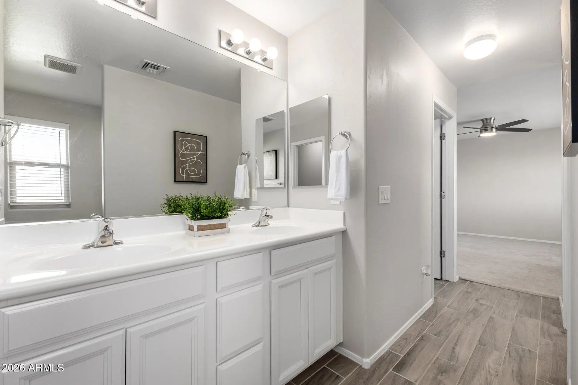 Welcome to this beautiful home located in the gated Roosevelt Park community. Offering 3 bedrooms, 2 bathrooms, and a 2-car garage, this residence is located within a gated community with community pool, The interior features white cabinetry with granite countertops, white subway tile backsplash and tile plank flooring in all the right spaces, and a neutral color palette throughout. The home comes fully equipped with all appliances, including a washer, dryer, and refrigerator, making it truly move-in ready. Enjoy added privacy with no neighbors behind, along with access to a community pool. Ideally situated near schools, shopping, and dining, with quick access to the I-10 and Loop 101, this is a wonderful opportunity you won't want to miss. Priced to sell!