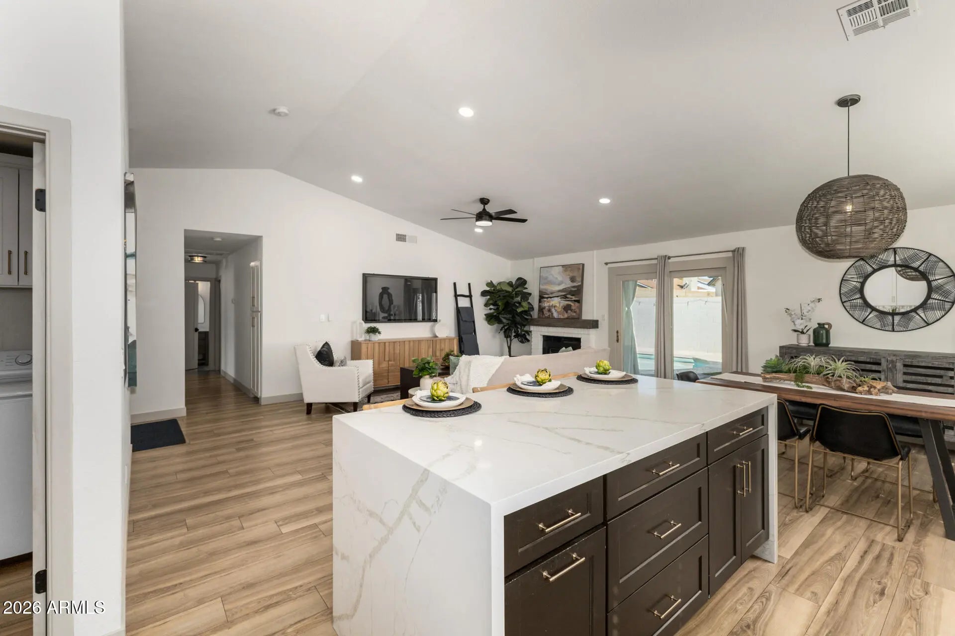 Located in Scottsdale's sought-after 85254 ''Magic Zip Code''. Beautifully remodeled single-level 3-bedroom, 2-bath Scottsdale home with a private pool, fully renovated in 2023. The open floor plan features wood flooring, fresh neutral paint, recessed lighting, upgraded fixtures, and a cozy fireplace. The designer kitchen offers Calacatta-style waterfall quartz countertops, white shaker cabinetry with custom hardware, tile backsplash, stainless steel appliances, and an adjacent dining area. The light-filled primary suite includes dual closets and a spa-style bath with soaking tub, marble tile surround, and upgraded vanity. Enjoy a private backyard with fenced pool, covered patio, and low-maintenance desert landscaping.