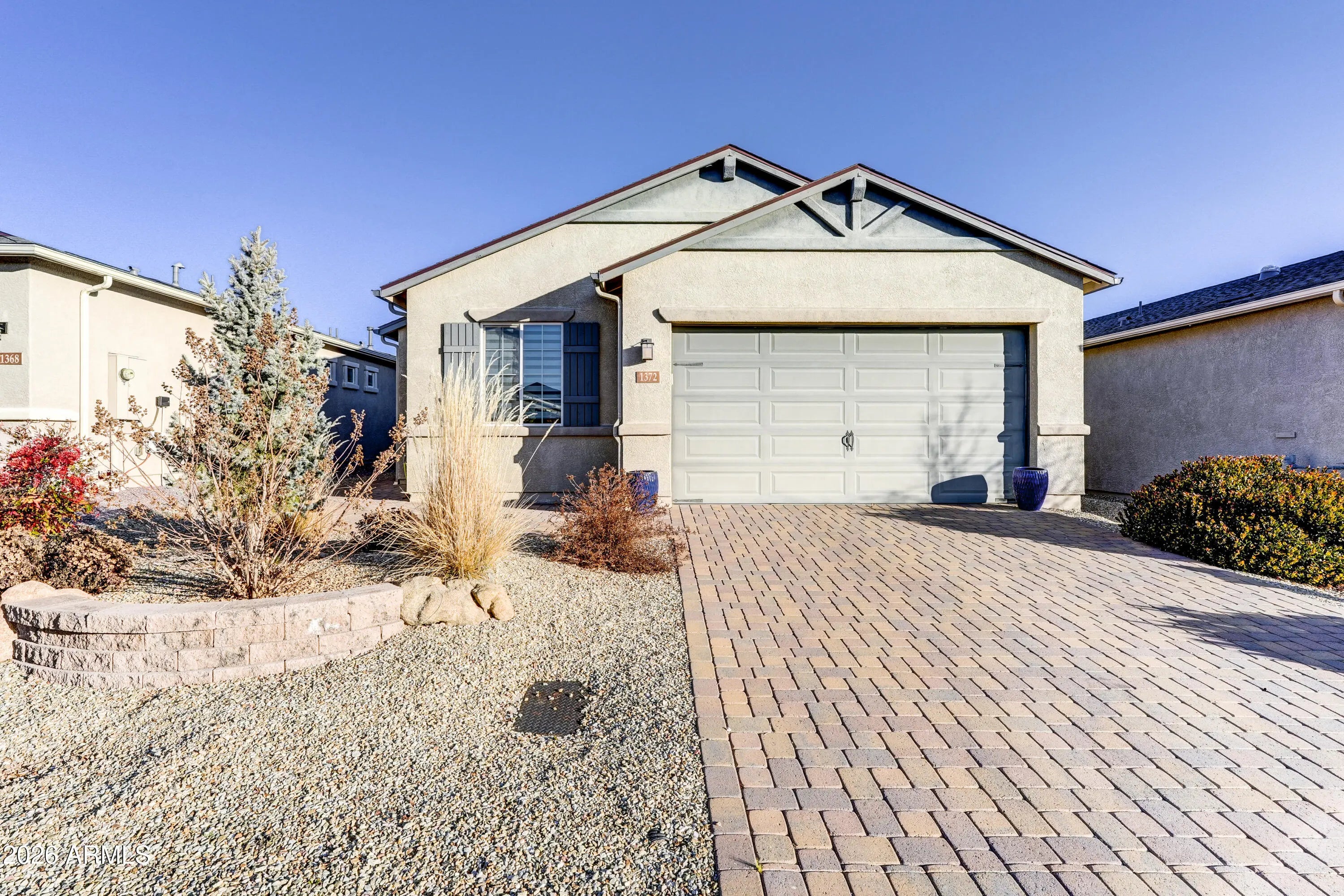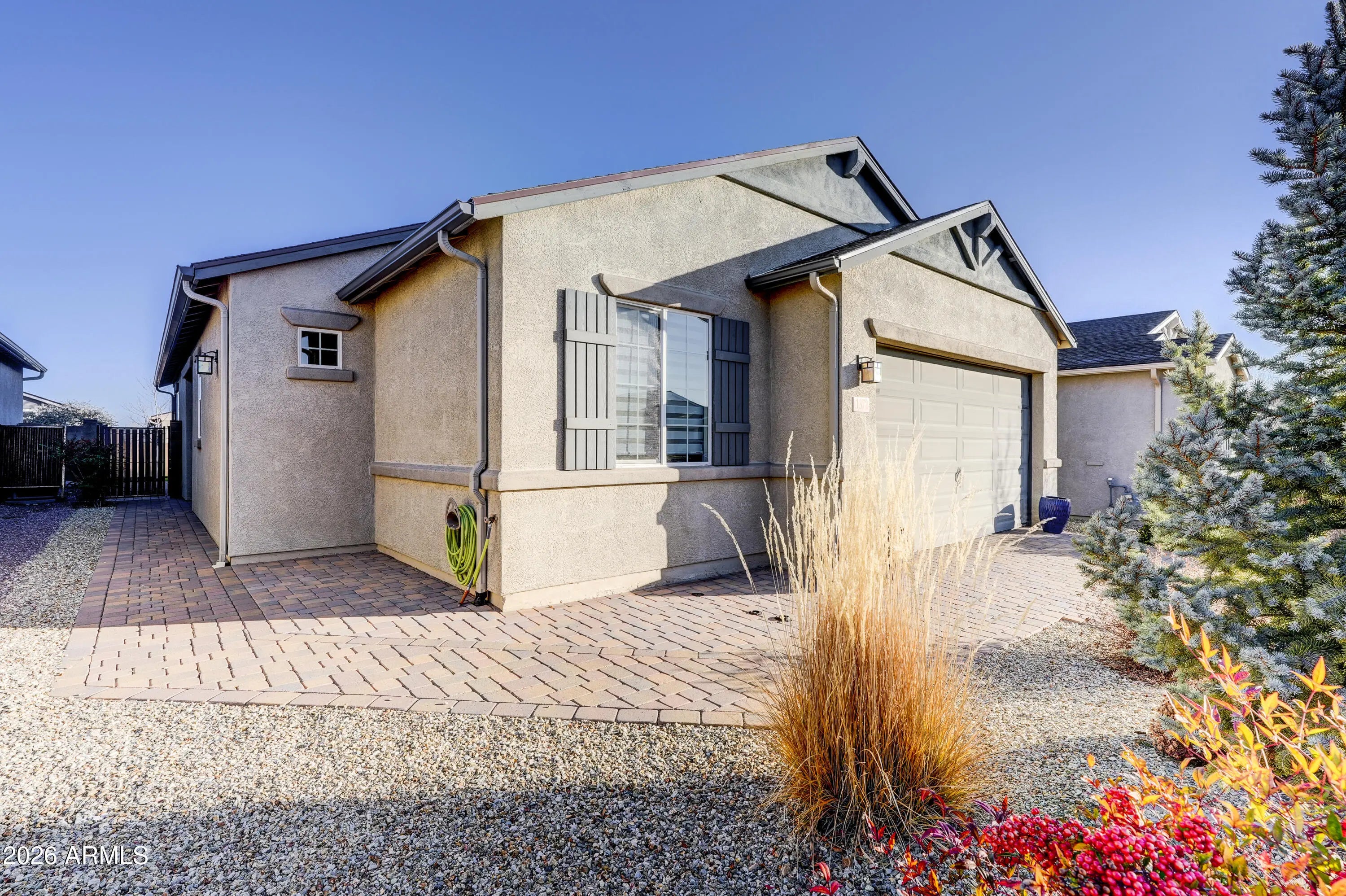Absolutely charming 2 Bedroom, 2 Bath, split floorplan home with low maintenance interior and exterior. This 1380 sqft open-concept home is turnkey with many upgrades throughout. Featuring pale grey soft close kitchen cabinets and drawers, high end Quartz countertops, gas range, gorgeous wood-look tile floors throughout except for the 2nd bedroom, tasteful Levolor cloth blinds, water softener and hot water recirculator. Don't miss the laundry room with its dog wash sink or the extra deep 2 car garage! The lovely back yard is professionally landscaped with Turf grass and extended pavers all for your enjoyment!