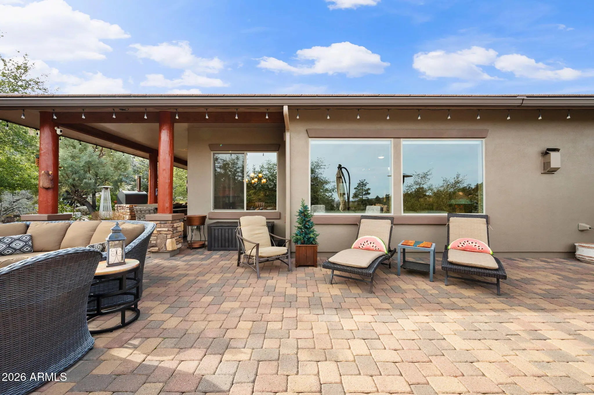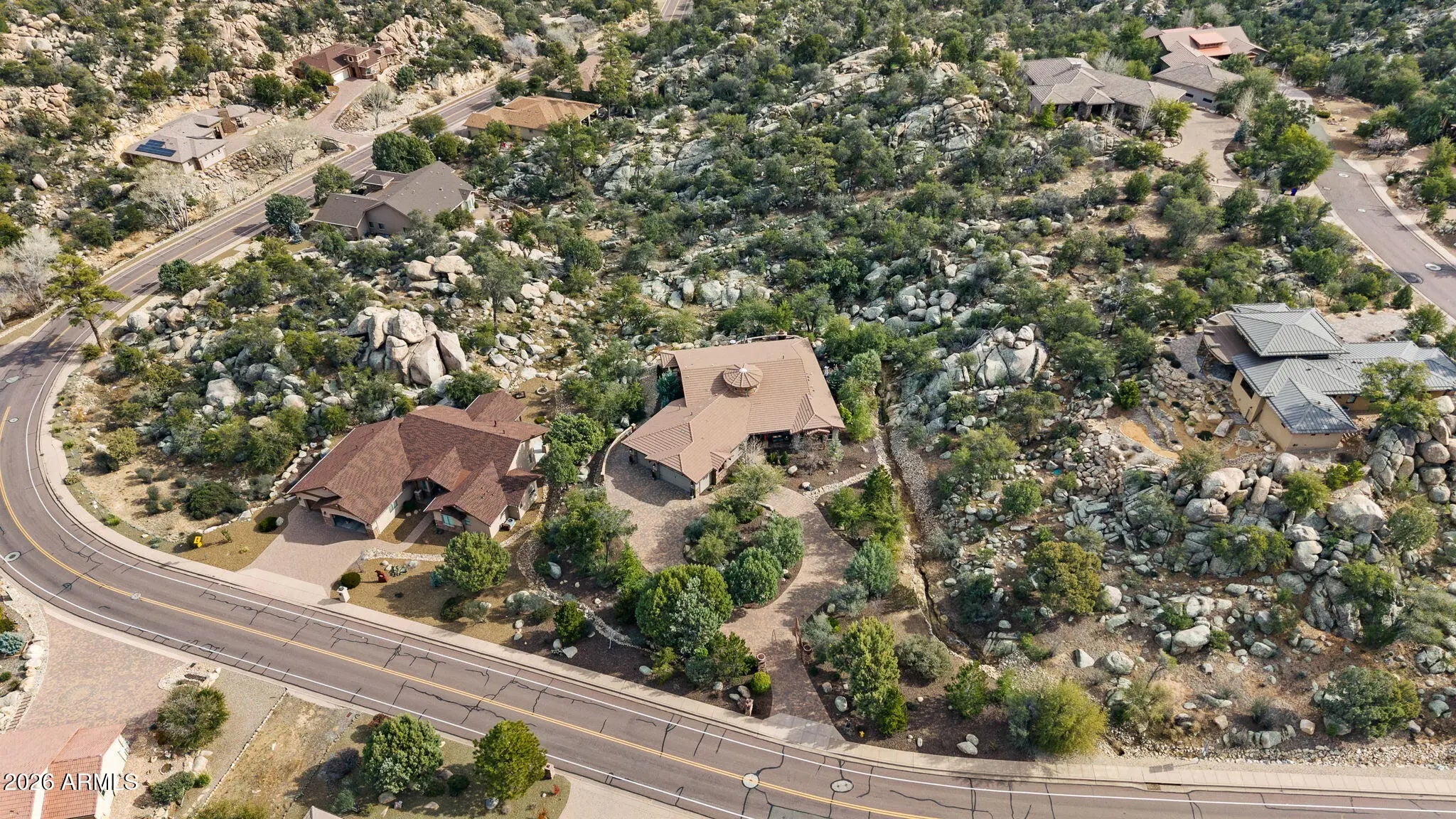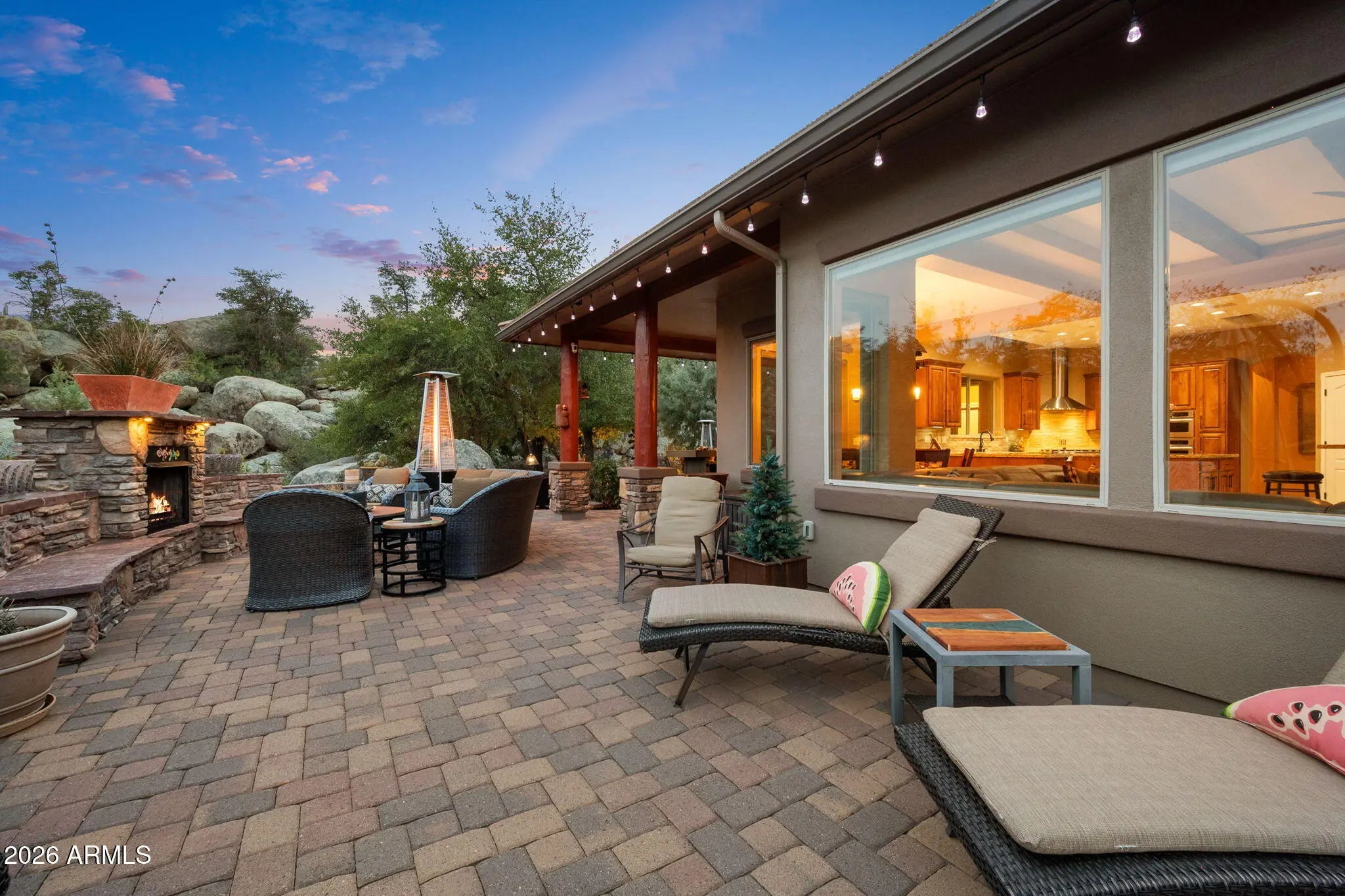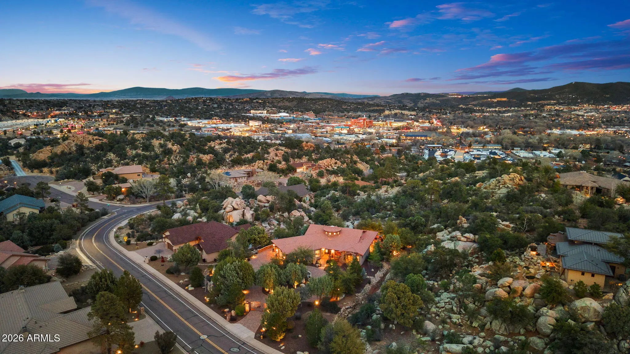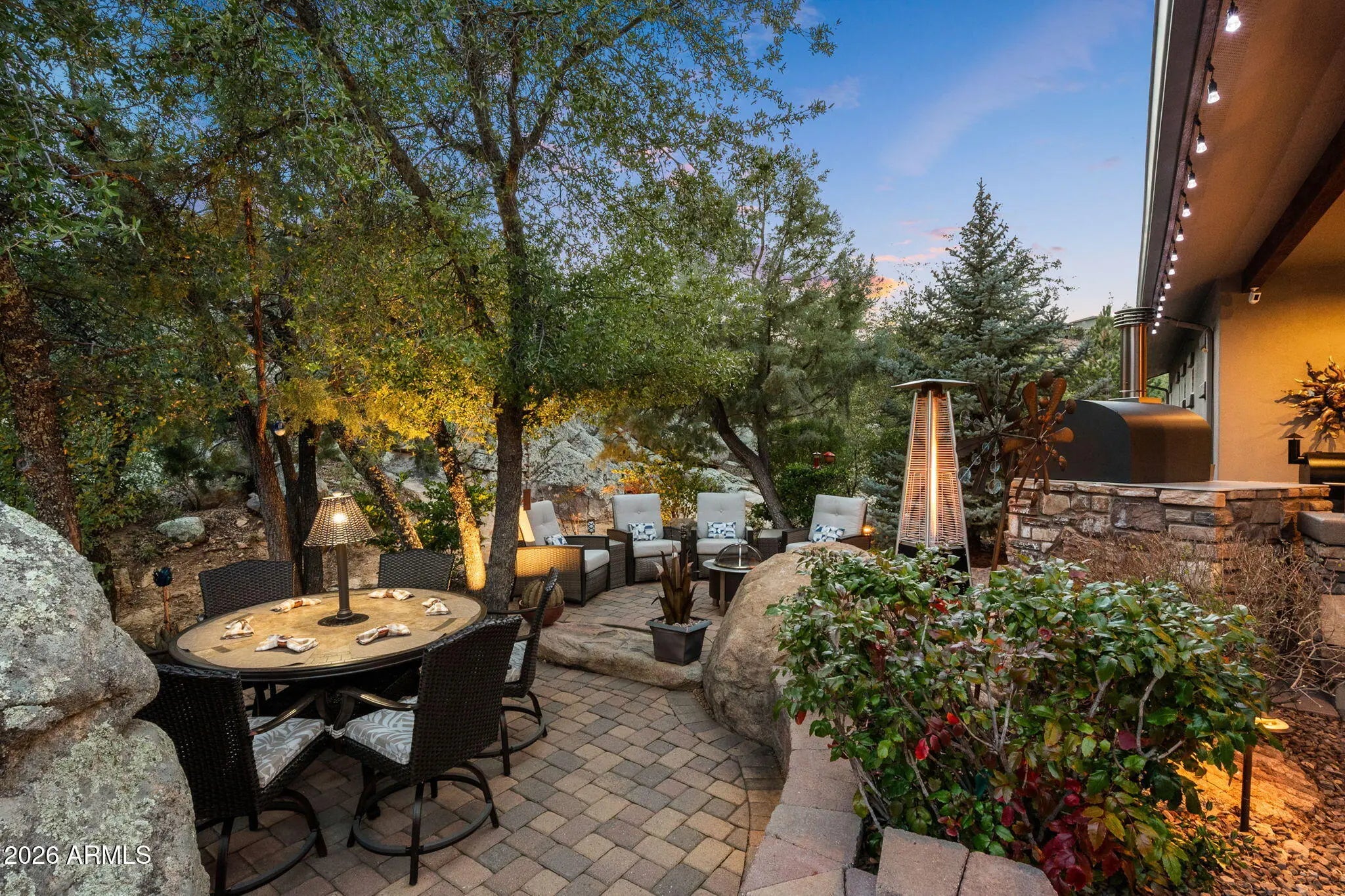Tucked within The Preserve at Prescott, this exceptional custom home offers a rare blend of privacy, tranquility, and convenience—delivering a peaceful, remote feel while remaining just 5-10 minutes from major shopping, downtown Prescott, and Yavapai Regional Medical Center. Situated on one of the largest homesites in the community (approximately 1.2 acres), the residence is thoughtfully positioned well back from the street, creating unmatched seclusion. A remote controlled entry, a paver-accented circular driveway weaves gracefully around dramatic natural rock outcroppings, setting the tone for the architectural experience that follows. Designed with both everyday living and entertaining in mind, the home features multiple indoor and outdoor gathering areas that seamlessly connect to the surrounding landscape by mature alligator junipers, Colorado blue spruce, indigenous pines, native oaks. Enjoy expansive views toward central Prescott, an inviting outdoor fireplace, and a serene backyard enriched by towering boulders, extensive outdoor lighting, digitally- controlled drip irrigation and a seasonal creek, all contributing to a truly peaceful setting. The outdoor kitchen is a standout feature, offering a traditional, top-of-the-line Kitchen-Aide BBQ with rotisserie and a large Traeger smoker style BBQ equipped with a programmable cooking/cell phone food monitoring feature, an authentic Forni Italian pizza oven, a bar area, and an outdoor refrigeratorperfectly suited for hosting and al fresco dining. Inside, the home makes a striking first impression with a grand entry highlighted by a 23-foot rotunda ceiling, a Canadian-sourced antler chandelier, and a custom Navajo-crafted granite tile floor medallion. The gourmet kitchen anchors the living space with an impressive 30-square-foot center island, surrounded by top-of-the-line built-in appliances, a wine refrigerator, trash compactor, and a double-door Sub-Zero refrigeratorideal for both entertaining and daily use. The primary suite offers a private retreat complete with his and hers walk-in closets, his and her sinks and make-up bar, a spacious shower, freestanding soaking tub, dedicated exercise room, and a cedar lined built-in sauna, creating a spa-like experience at home. A second primary suite offering a private bedroom and bath adorned with quartz finishes, full-size shower and walk-in closet further complement this thoughtfully designed home With a semi-wooded setting, rolling terrain, and a thoughtfully designed custom build, this property captures the essence of The Preserve at Prescottwhere natural beauty, privacy, and refined living come together in one of Prescott's most desirable communities.