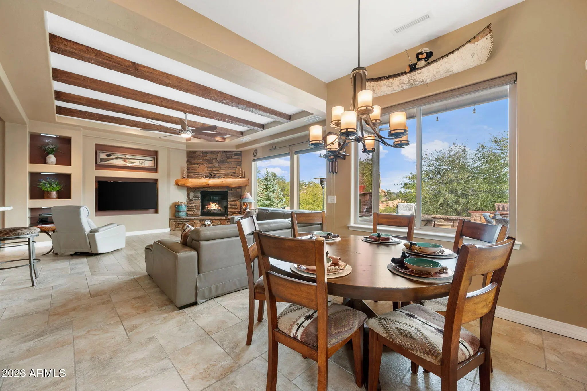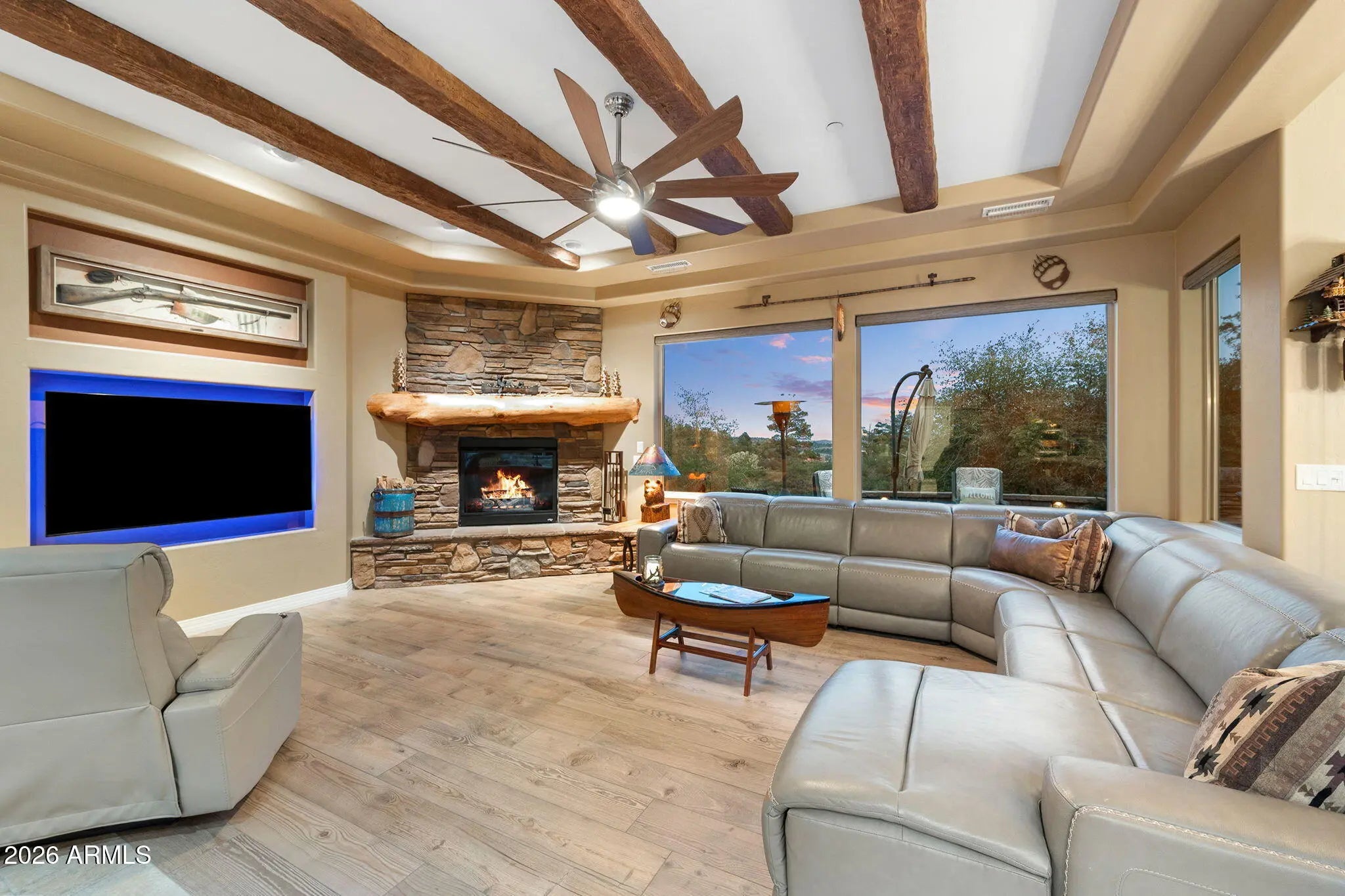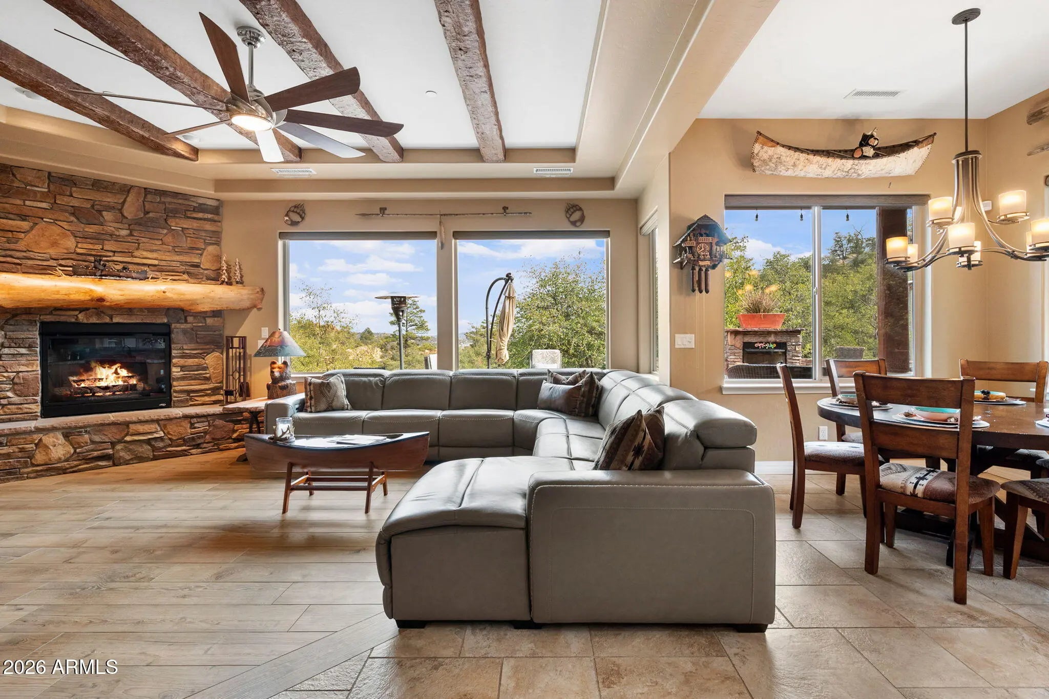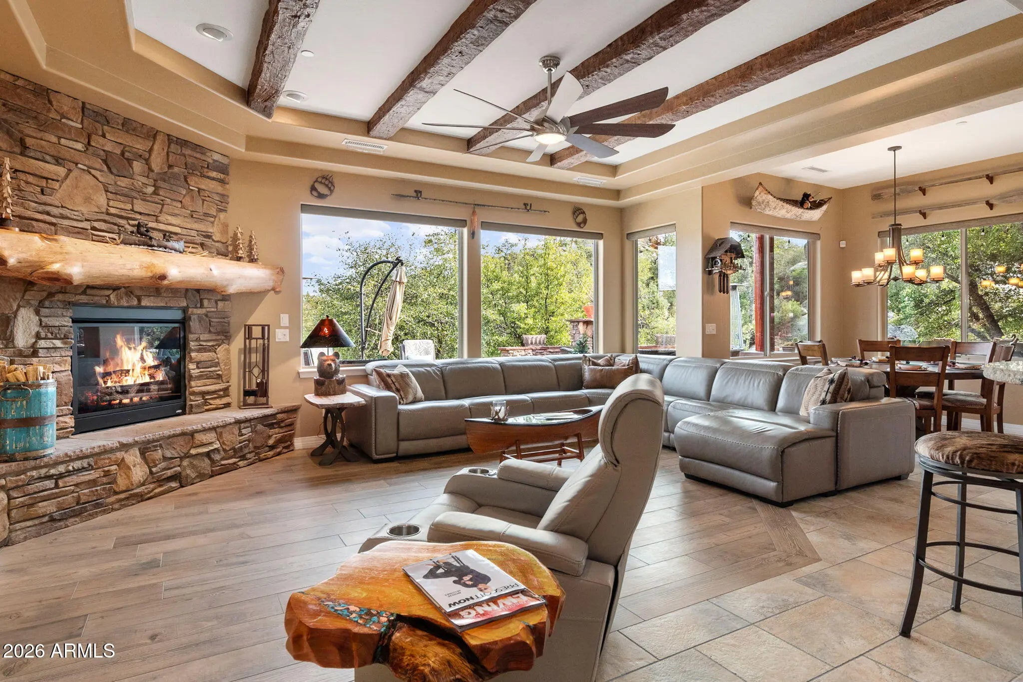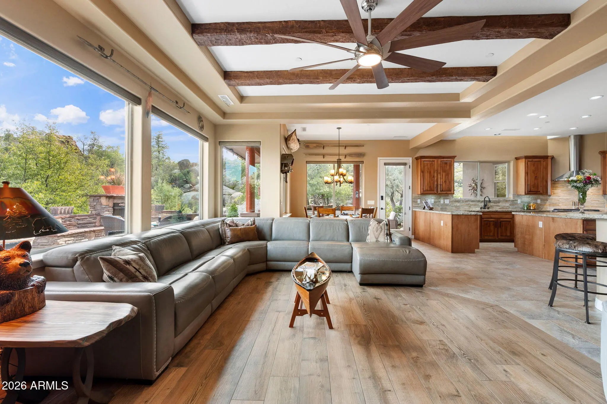 Tucked within The Preserve at Prescott, this exceptional custom home offers a rare blend of privacy, tranquility, and convenience—delivering a peaceful, remote feel while remaining just 5-10 minutes from major shopping, downtown Prescott, and Yavapai Regional Medical Center. Situated on one of the largest homesites in the community (approximately 1.2 acres), the residence is thoughtfully positioned well back from the street, creating unmatched seclusion. A remote controlled entry, a paver-accented circular driveway weaves gracefully around dramatic natural rock outcroppings, setting the tone for the architectural experience that follows. Designed with both everyday living and entertaining in mind, the home features multiple indoor and outdoor gathering areas that seamlessly connect to the surrounding landscape by mature alligator junipers, Colorado blue spruce, indigenous pines, native oaks. Enjoy expansive views toward central Prescott, an inviting outdoor fireplace, and a serene backyard enriched by towering boulders, extensive outdoor lighting, digitally- controlled drip irrigation and a seasonal creek, all contributing to a truly peaceful setting. The outdoor kitchen is a standout feature, offering a traditional, top-of-the-line Kitchen-Aide BBQ with rotisserie and a large Traeger smoker style BBQ equipped with a programmable cooking/cell phone food monitoring feature, an authentic Forni Italian pizza oven, a bar area, and an outdoor refrigeratorperfectly suited for hosting and al fresco dining. Inside, the home makes a striking first impression with a grand entry highlighted by a 23-foot rotunda ceiling, a Canadian-sourced antler chandelier, and a custom Navajo-crafted granite tile floor medallion. The gourmet kitchen anchors the living space with an impressive 30-square-foot center island, surrounded by top-of-the-line built-in appliances, a wine refrigerator, trash compactor, and a double-door Sub-Zero refrigeratorideal for both entertaining and daily use. The primary suite offers a private retreat complete with his and hers walk-in closets, his and her sinks and make-up bar, a spacious shower, freestanding soaking tub, dedicated exercise room, and a cedar lined built-in sauna, creating a spa-like experience at home. A second primary suite offering a private bedroom and bath adorned with quartz finishes, full-size shower and walk-in closet further complement this thoughtfully designed home With a semi-wooded setting, rolling terrain, and a thoughtfully designed custom build, this property captures the essence of The Preserve at Prescottwhere natural beauty, privacy, and refined living come together in one of Prescott's most desirable communities.