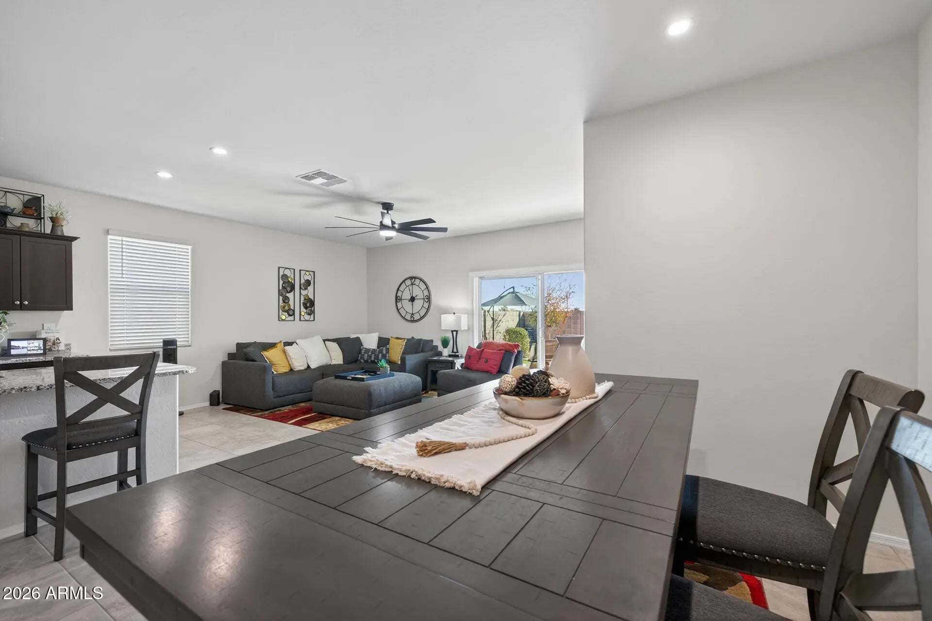 Ideal for a first-time homebuyer or investor, this well cared for one-owner home offers 3 bedrooms and 2 baths across 1541 SqFt with a bright open great room layout that feels welcoming from the moment you step inside. The kitchen stands out with rich espresso maple cabinets topped with crown molding, granite countertops, stainless appliances, a pantry, and an island with a breakfast bar that creates the perfect spot for casual dining. Sliding glass doors extend the living space to a comfortable covered patio with roll-down shades and a ceiling fan, while the backyard is designed for easy enjoyment with an expansive paver patio, built-in seating, a gazebo covering, and low maintenance artificial turf ideal for kids and pets. The primary retreat provides a peaceful escape with an en- suite bath featuring a dual sink vanity, oversized shower, linen shelving, and a generous walk-in closet. Additional highlights include tile flooring throughout the main living areas and baths, carpeted bedrooms, ceiling fans, neutral decor, and a 2-car garage.