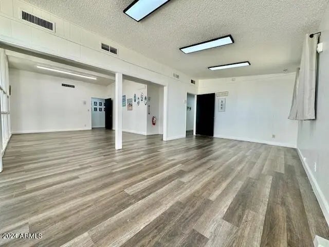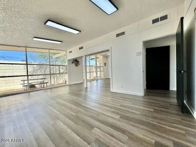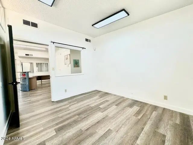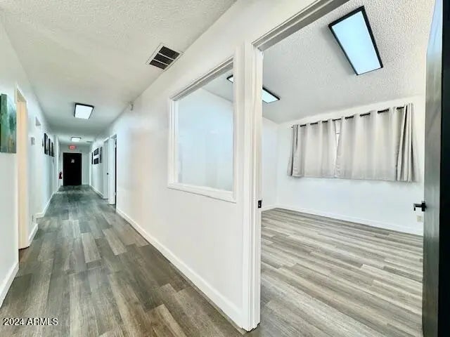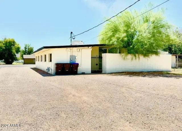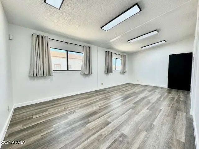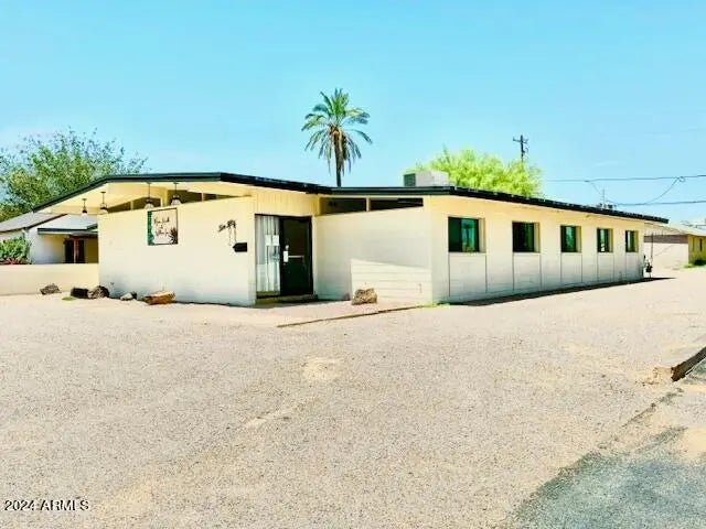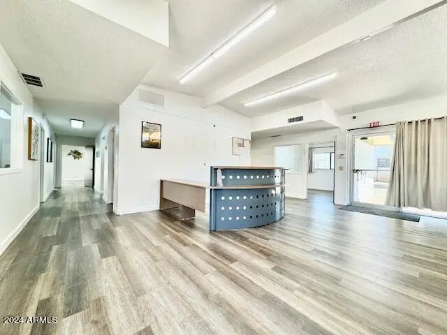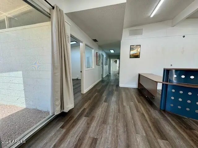 Discover the ideal office building in an Opportunity Zone in Coolidge. The building's exterior impresses with beautiful street presence, featuring new light fixtures and a freshly painted façade. Inside, a spacious reception area awaits, ready to accommodate seating or a full reception desk, creating a welcoming environment for clients and visitors. It offers two expansive rooms, ideal for classrooms or large conference areas and five primary offices, all consistently styled with modern paint, flooring, and energy-efficient LED lighting. The large classroom space is enhanced by natural light streaming through floor-to-ceiling windows, offering a serene view of a private courtyard. The gated courtyard connects to the back parking lot, providing both convenience and privacy