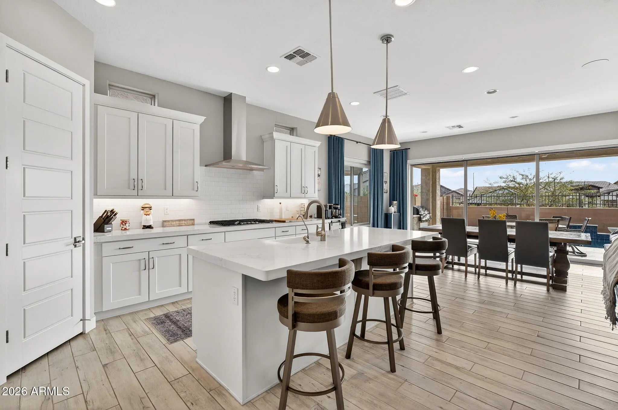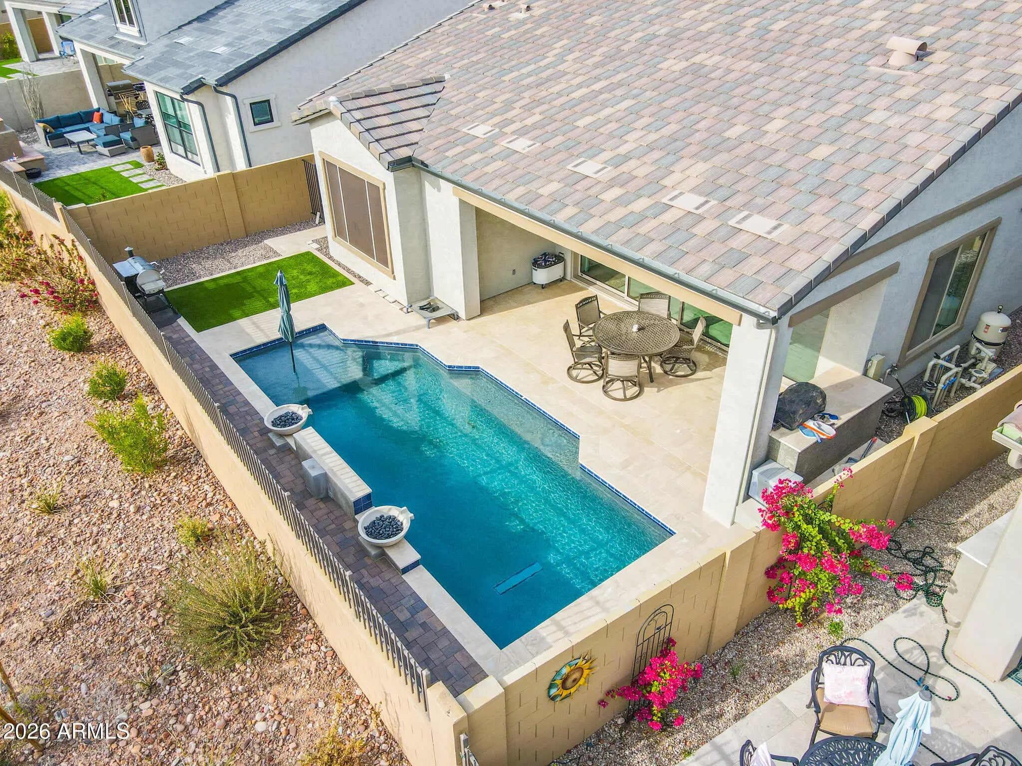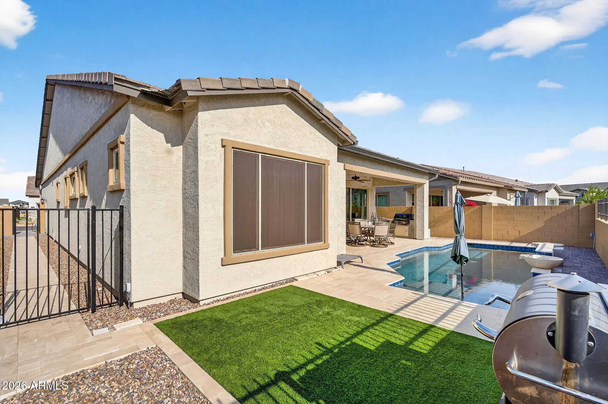 Welcome to this stunning, single-level luxury home built in 2023 and located in the highly desirable Red Rock Reserve by Blandford Homes. This 3 bedroom, 2.5 bathroom residence offers 2,035 square feet of thoughtfully designed living space and a rare 3-car tandem garage. Step inside through the dramatic iron entry door to an open and airy floor plan featuring plank tile throughout, 8-foot interior doors, oversized baseboards, and an expanded great room highlighted by a breathtaking 20-foot wall of glass. The gourmet kitchen is a showstopper with upgraded Regal White cabinetry, quartz countertops, soft-close drawers, and a premium KitchenAid 36-inch gas cooktop package. The primary suite offers a spa-inspired bath with a large walk-in shower, modern rectangular sinks, and framed mirrors. Over $20,000 in custom window coverings are included, featuring electronic shades on the wall of glass. Additional upgrades include a water softener and reverse osmosis system. Outside, enjoy an $80,000 resort-style backyard complete with a private pool, water features, In ground cleaning system, pavers, artificial turf, and a built-in BBQ, all set against incredible mountain views. Just under a mile to freeway access and surrounded by exceptional community amenities including a clubhouse, heated pool and spa, fitness center, pickleball, basketball court, hiking and biking trails, and more. This home delivers luxury, location, and lifestyle in one exceptional package.