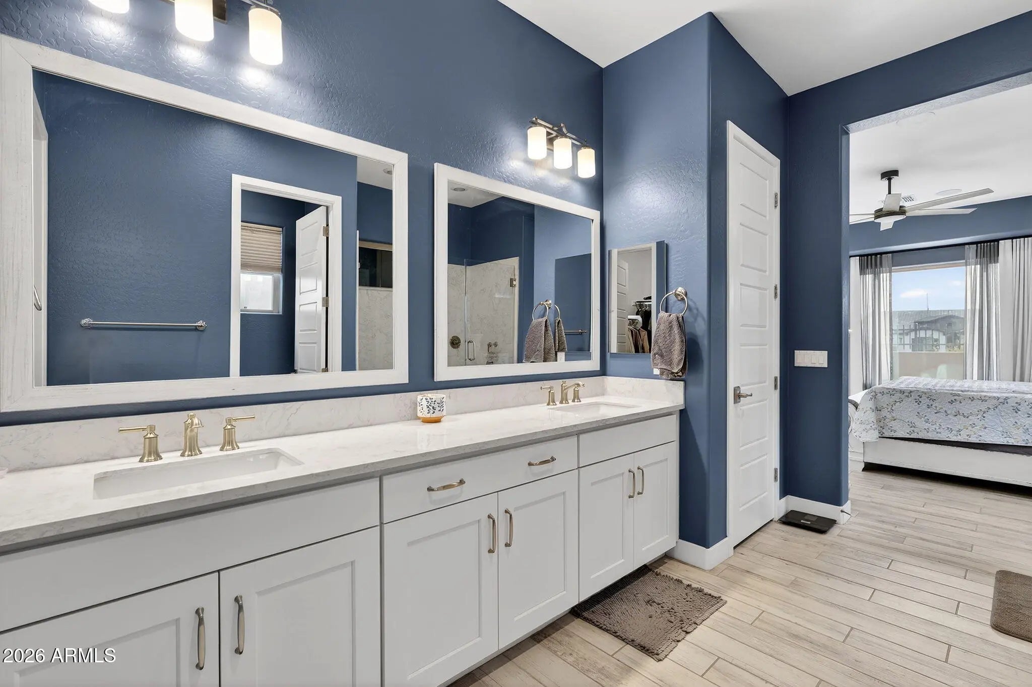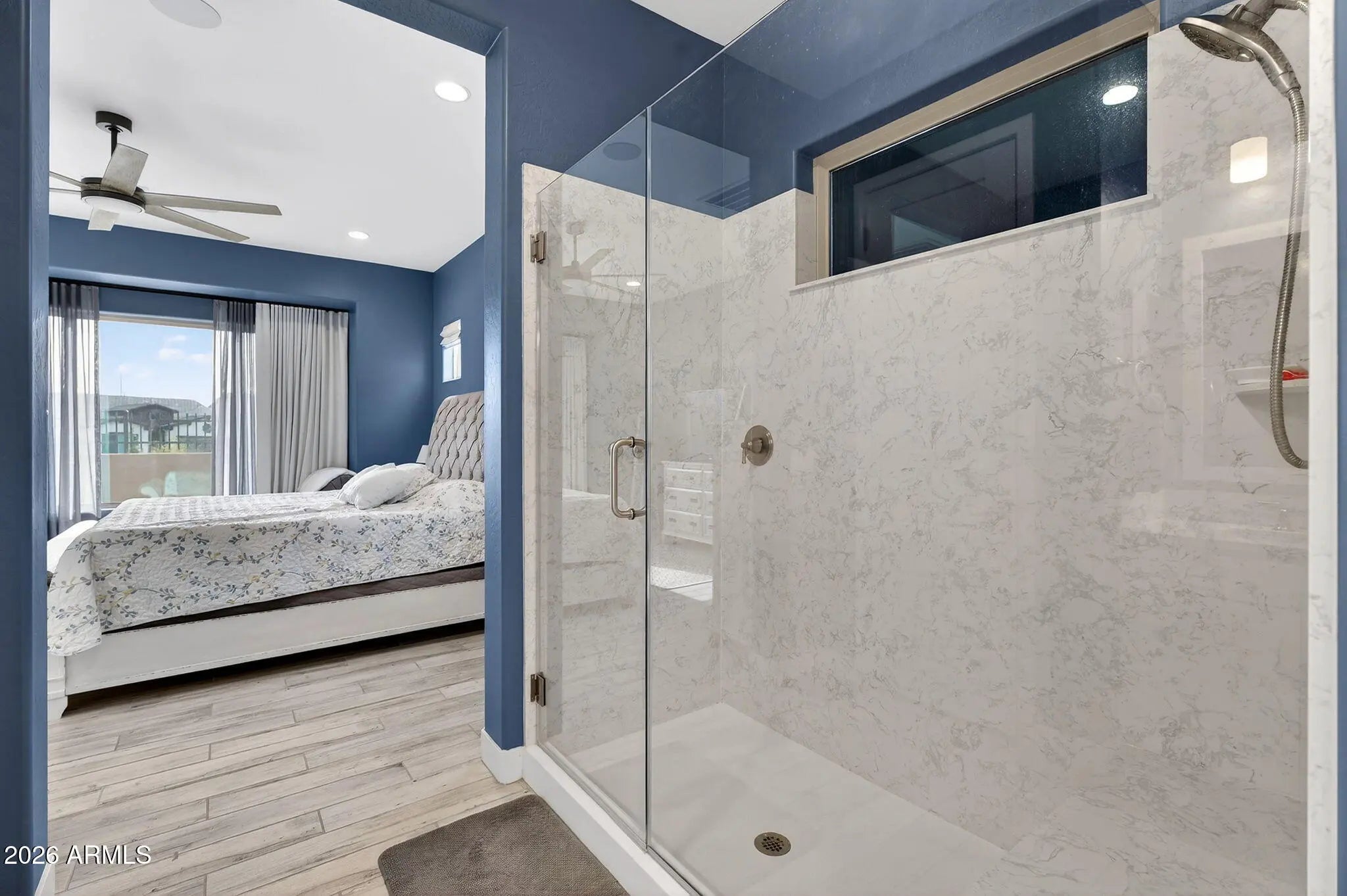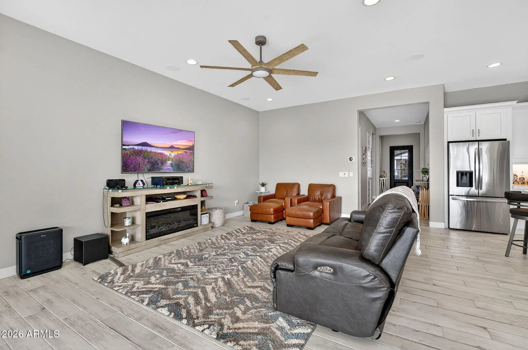 Welcome to this stunning, single-level luxury home built in 2023 and located in the highly desirable Red Rock Reserve by Blandford Homes. This 3 bedroom, 2.5 bathroom residence offers 2,035 square feet of thoughtfully designed living space and a rare 3-car tandem garage. Step inside through the dramatic iron entry door to an open and airy floor plan featuring plank tile throughout, 8-foot interior doors, oversized baseboards, and an expanded great room highlighted by a breathtaking 20-foot wall of glass. The gourmet kitchen is a showstopper with upgraded Regal White cabinetry, quartz countertops, soft-close drawers, and a premium KitchenAid 36-inch gas cooktop package. The primary suite offers a spa-inspired bath with a large walk-in shower, modern rectangular sinks, and framed mirrors. Over $20,000 in custom window coverings are included, featuring electronic shades on the wall of glass. Additional upgrades include a water softener and reverse osmosis system. Outside, enjoy an $80,000 resort-style backyard complete with a private pool, water features, In ground cleaning system, pavers, artificial turf, and a built-in BBQ, all set against incredible mountain views. Just under a mile to freeway access and surrounded by exceptional community amenities including a clubhouse, heated pool and spa, fitness center, pickleball, basketball court, hiking and biking trails, and more. This home delivers luxury, location, and lifestyle in one exceptional package.
