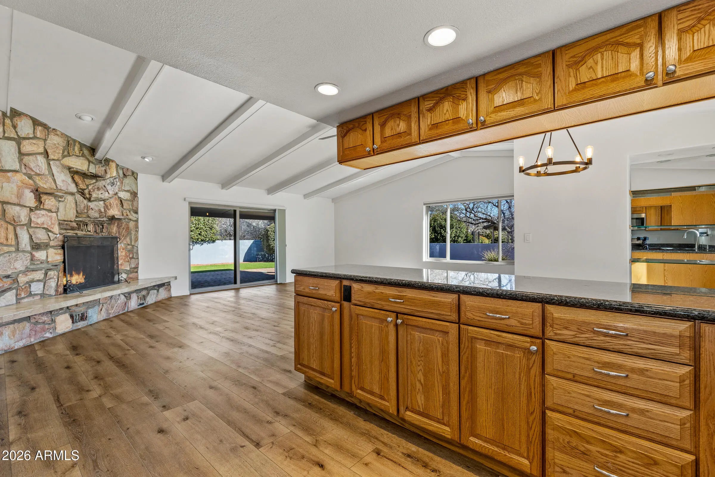 Charming 2 bedroom, 2 bath home featuring many improvements. New OWNED solar power system for reduced power bills, new luxury vinyl flooring, new motorized blinds, new light fixtures and fans, updated kitchen and bathrooms with granite countertops, newer roof, and newer Rudd water heater. This single level home boasts an open concept living area that features a spacious modern kitchen that opens to a formal dining room and a great room highlighted with a beautiful stone front wood burning fireplace and vaulted beamed ceilings. The luxurious and spacious landscaped private backyard features new low maintenance artificial turf, a new extended patio, new lighting and updated vegetable garden irrigation. The private office in part of the garage is an extra bonus. Turn-key and move-in ready.