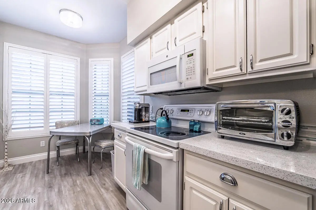 Beautiful remodeled FURNISHED Mirada unit has a private relaxing patio with no sidewalks nearby, perfect for morning coffee or entertaining! The gorgeous updated kitchen has newer appliances, quartz, and a quaint breakfast nook. Baths have been remodeled to feel spa like with large walk-in shower in main bath, quartz and all new fixtures. This fantastic 1st floor condo, has a newer AC, fresh paint, newer flooring, lighting, and shutters. All this and a close to unit parking spot with an easy walk to club house and pool. The Grand Amenities include four golf courses, tennis and pickleball, softball, hiking trails, workout facilities, restaurants, classes, and so much more. This is Arizona living at its finest!