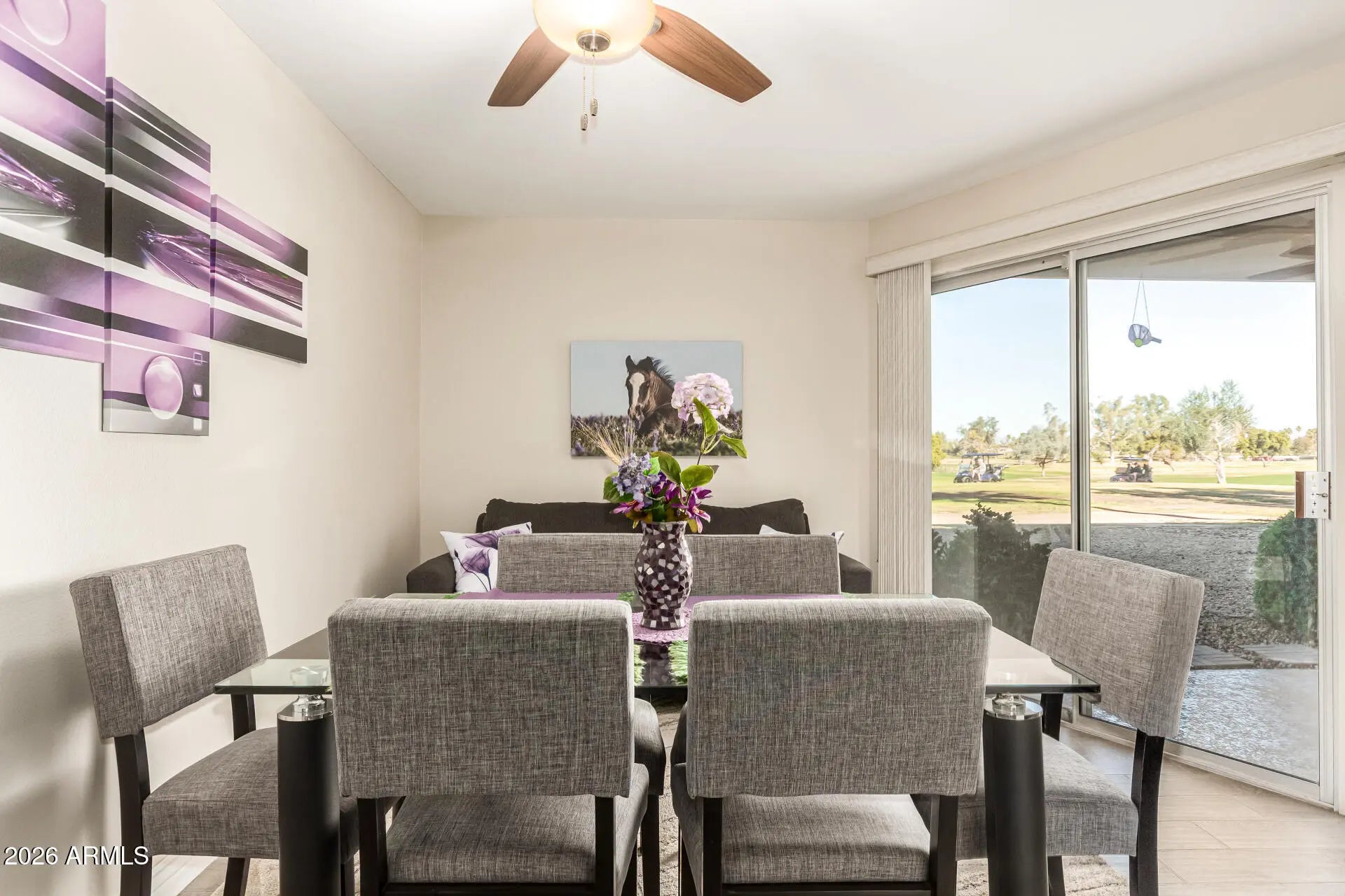 Beautiful ground-floor home perfectly situated on the golf course, offering stunning views from every room. This spacious 1-bedroom, 1-bath residence features 1,086 sq ft is tastefully updated and impeccably maintained. Improvements include wood-plank tile flooring, neutral interior paint, and updated baseboards throughout. The kitchen shines with crown molding, quartz countertops, and stainless steel appliances. Adjacent to the kitchen is an inviting eat-in dining area plus a versatile office space. The bedroom offers a peaceful retreat with sliding doors to the patio, golf course views, and a walk-in closet. Additional storage under the carport offers ample storage-perfect for bikes, gear, or even a golf cart. Offered fully furnished with a few exclusions.