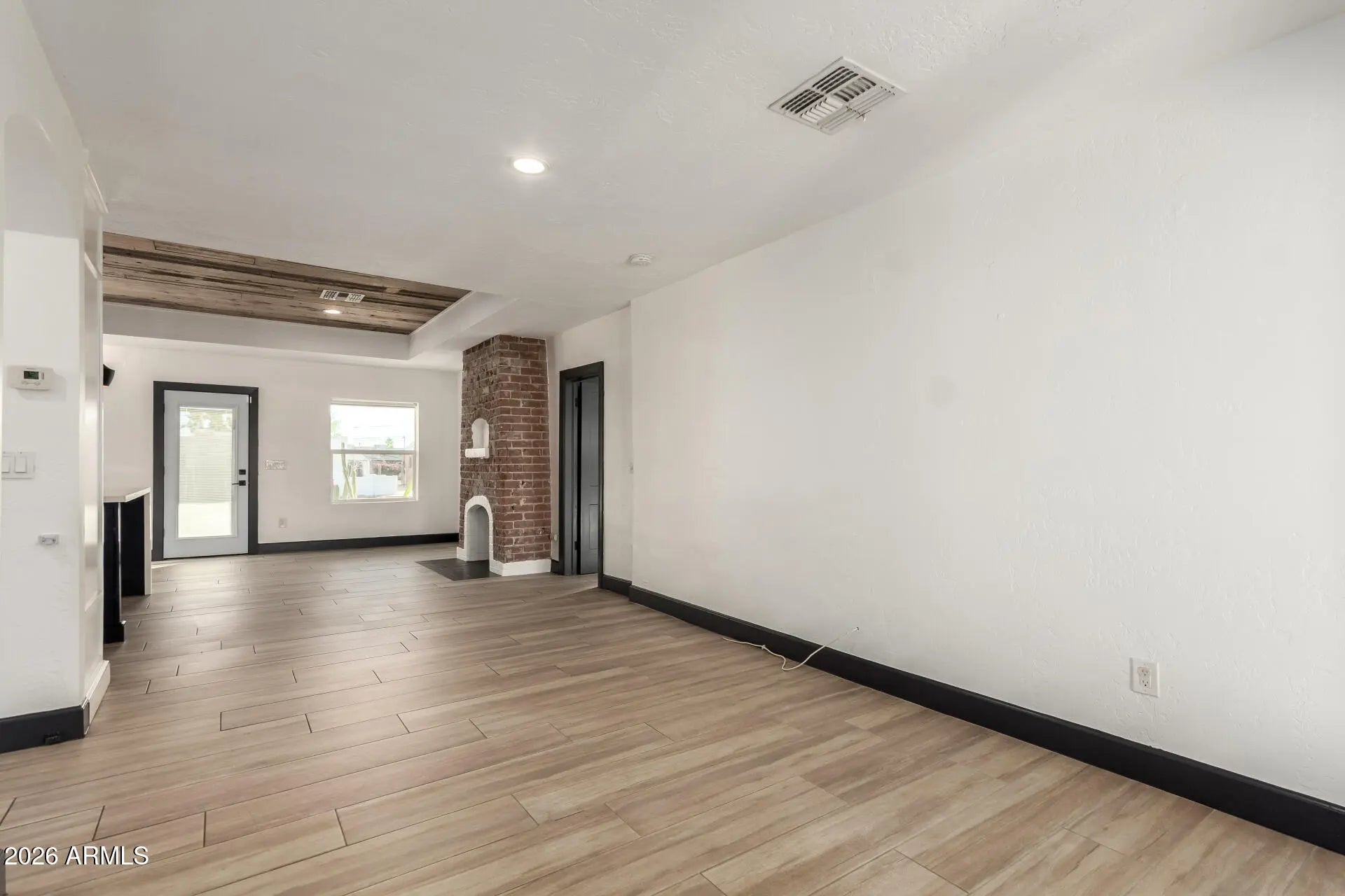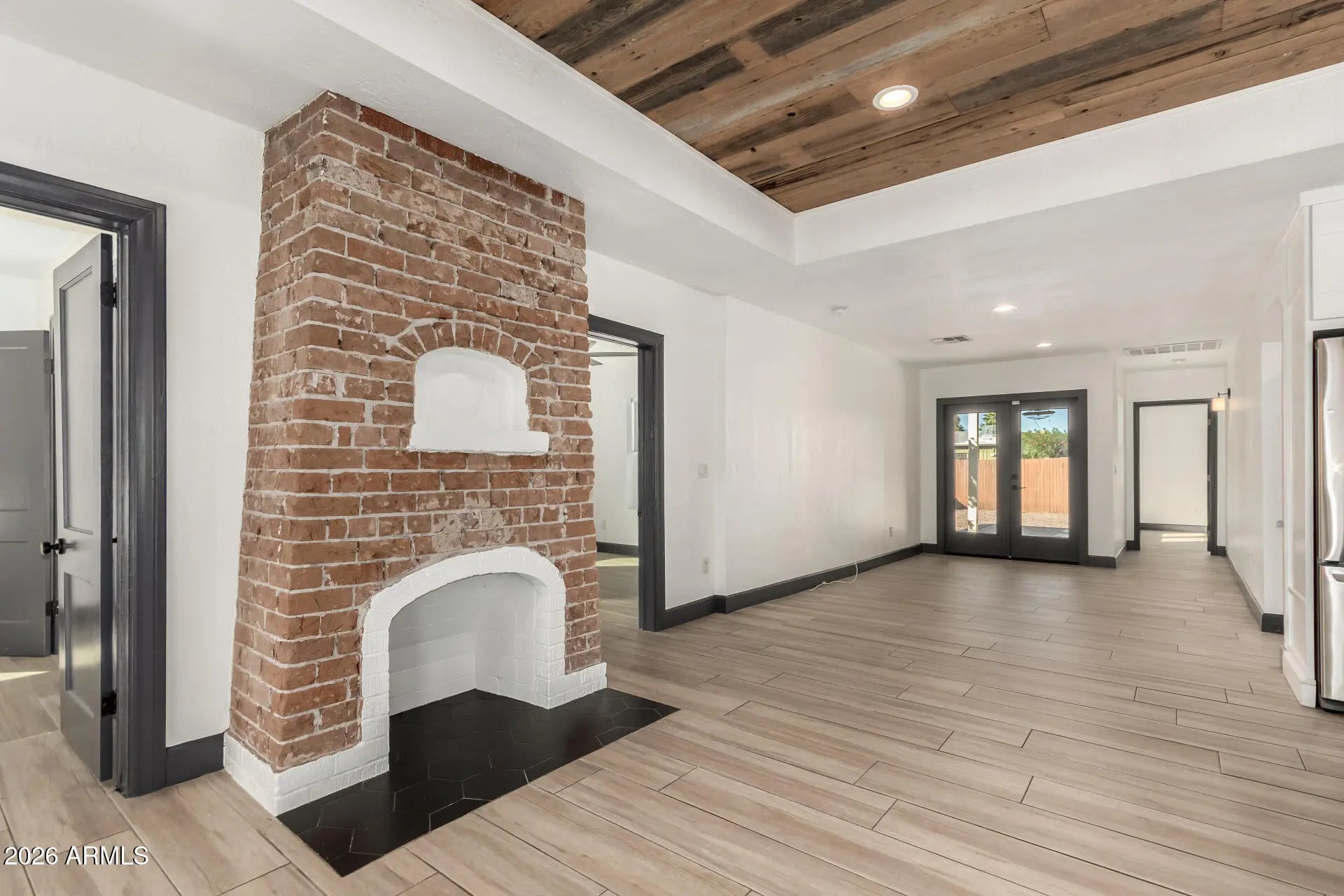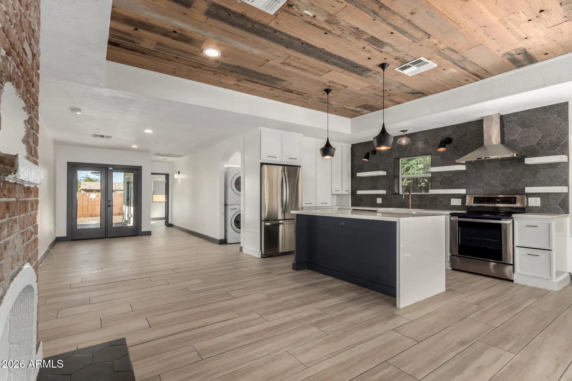 Historic Soul. Modern Heart. Discover a masterfully reimagined 1920s treasure where vintage charm meets high-octane design. The showstopper? A culinary kitchen featuring a custom tray ceiling crafted from repurposed wood salvaged from the original carriage house...paired perfectly with sleek waterfall-edge counters and designer lighting. The vibe continues in the living room, anchored by an exposed red brick fireplace framed in striking hexagon tile for a bold, textural edge. Every inch is curated for luxury, from the wood-look floors to the primary retreat with its own private garden exit. Outside, your private oasis awaits: a fully enclosed yard with a covered patio, lush lawn, and total privacy. Located minutes from the downtown buzz, this is the ultimate turnkey urban sanctuary!