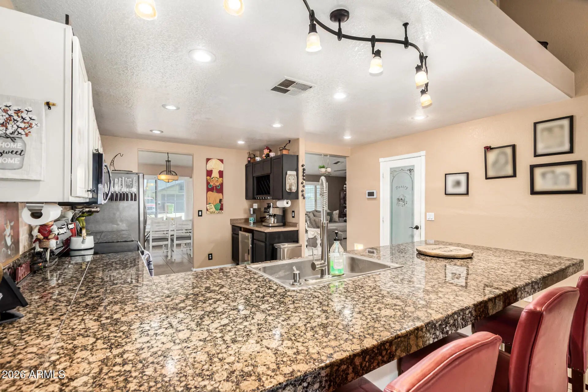 Location, location, location! Fall in love with this home that shows pride of ownership throughout every detail. Featuring a desirable split floor plan, RV gate, and no HOA. From the moment you step inside, you'll be welcomed by soaring vaulted ceilings and a spacious living room complete with built-in entertainment wall. The oversized kitchen is a dream, thoughtfully designed with a massive walk-in pantry, stainless steel appliances, granite countertops, coffee/wine bar and an expansive breakfast bar that opens to the light filled family room. The private primary suite is tucked away from the other bedrooms and features laminate wood flooring, a generous walk-in closet, dual vanity, and a tub shower combo to unwind. This home also offers a formal dining area where everyone gathers. Step outside to a pristine manicured backyard with an oversized covered patio and ample room for entertaining, outdoor toys, or simply relaxing under the Arizona sky. New Roof 2024 and New Water Heater 2026 and AC only 5 years old. All of this is conveniently located just steps from State Farm Stadium, Westgate Entertainment District, Desert Diamond Casino, top-notch dining, and shopping. Nearby Topgolf Glendale and the new upcoming VAI Resort. All conveniently located to the 101. This is a home you don't want to miss. Come see it today and imagine the possibilities.