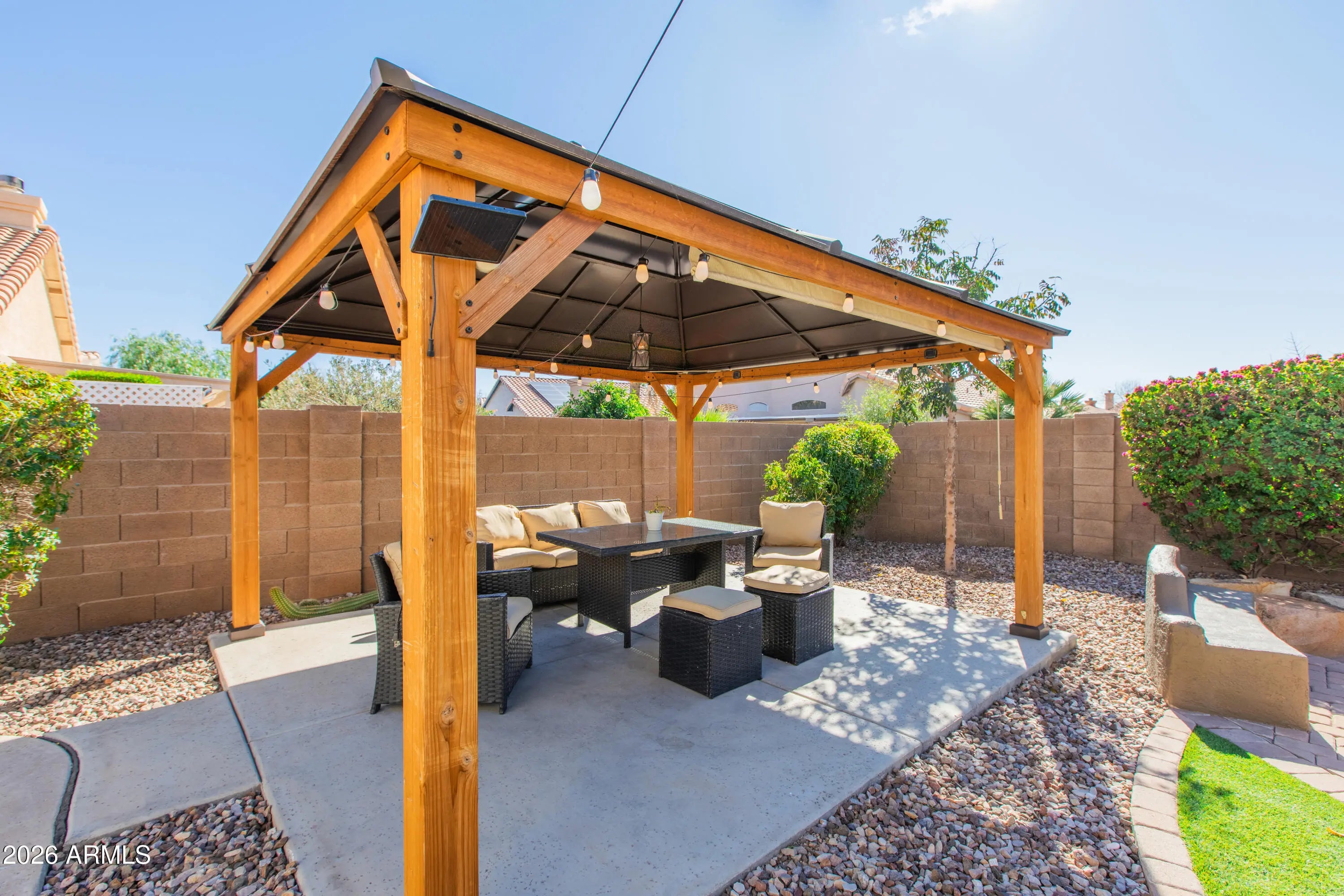 Welcome to this beautifully updated 4-bedroom, single-level home on a premium corner lot in Mesa with NO HOA! This rare find features a 3-car garage and a thoughtfully redesigned kitchen completed with the help of a professional designer. The kitchen is a true showstopper, offering stainless steel appliances, travertine countertops, an oversized island, walk-in pantry, wine fridge, and fresh two-tone painted cabinetry. Designer touches and added lighting in the living room, kitchen, and primary bedroom elevate the home's modern feel. Major systems have been recently updated, including a new roof, HVAC, and water heater (2023). Additional upgrades include new exterior paint (2023), fresh interior paint in the primary bedroom and bathroom, and an electric vehicle charging outlet. Updated bathrooms and a spacious walk-in primary shower add to the home's move-in-ready appeal. The backyard is designed for easy living and entertaining, featuring artificial turf, a built-in grill, gazebo, fire pit, and a gated dog run. Refrigerator, washer (2025) , and dryer convey, making this home truly turnkey. Ideally located near Rancho del Mar Park, shopping, dining, and just minutes from the US-60 and Loop-101, offering both convenience and lifestyle. With NO HOA, modern upgrades, and a fantastic Mesa location, this home checks every box- don't miss it!