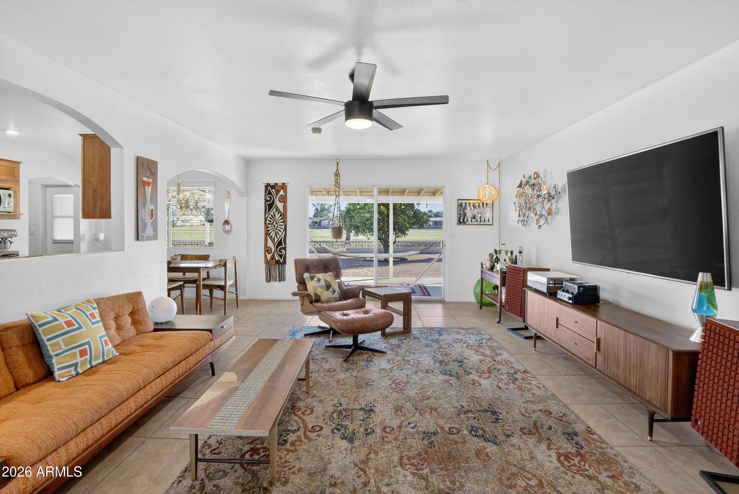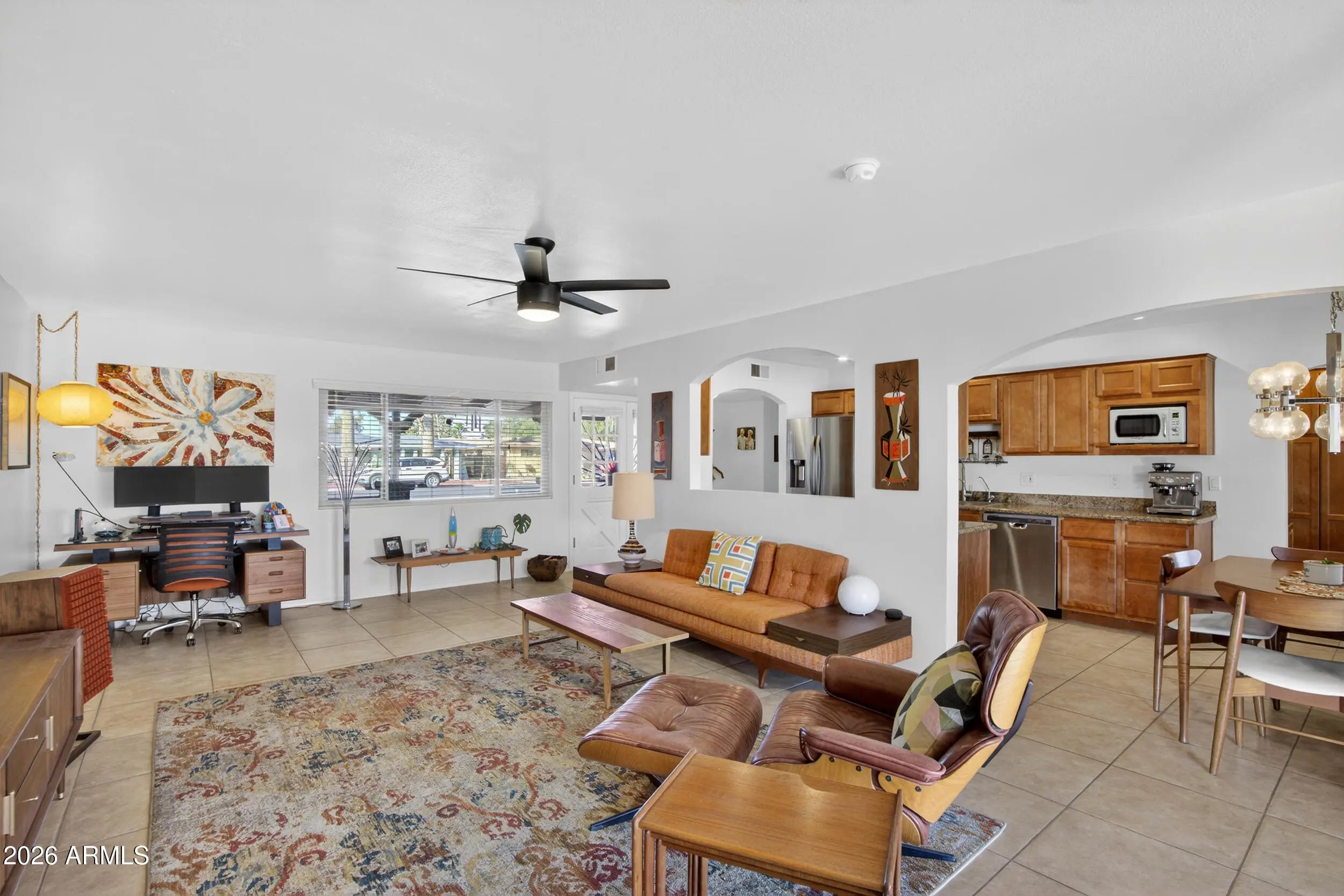 Welcome to this Mid-Century Modern home ideally situated on the Golden Hills Golf Club in Mesa, offering scenic golf-course views and a unique setting within a well-established neighborhood. This property sits on an over 9,000 sq ft lot, providing space, privacy, and a non-cookie-cutter design. Solid block construction with a covered patio and front porch enhances indoor-outdoor living. The home features three spacious bedrooms and three bathrooms, along with updated finishes and newer energy-efficient windows. The kitchen offers granite countertops, stainless steel appliances, ample cabinetry, and a large pantry. An oversized laundry room. Conveniently located near freeway access, shopping, and dining. A rare opportunity to own a distinctive Mid-Century property.