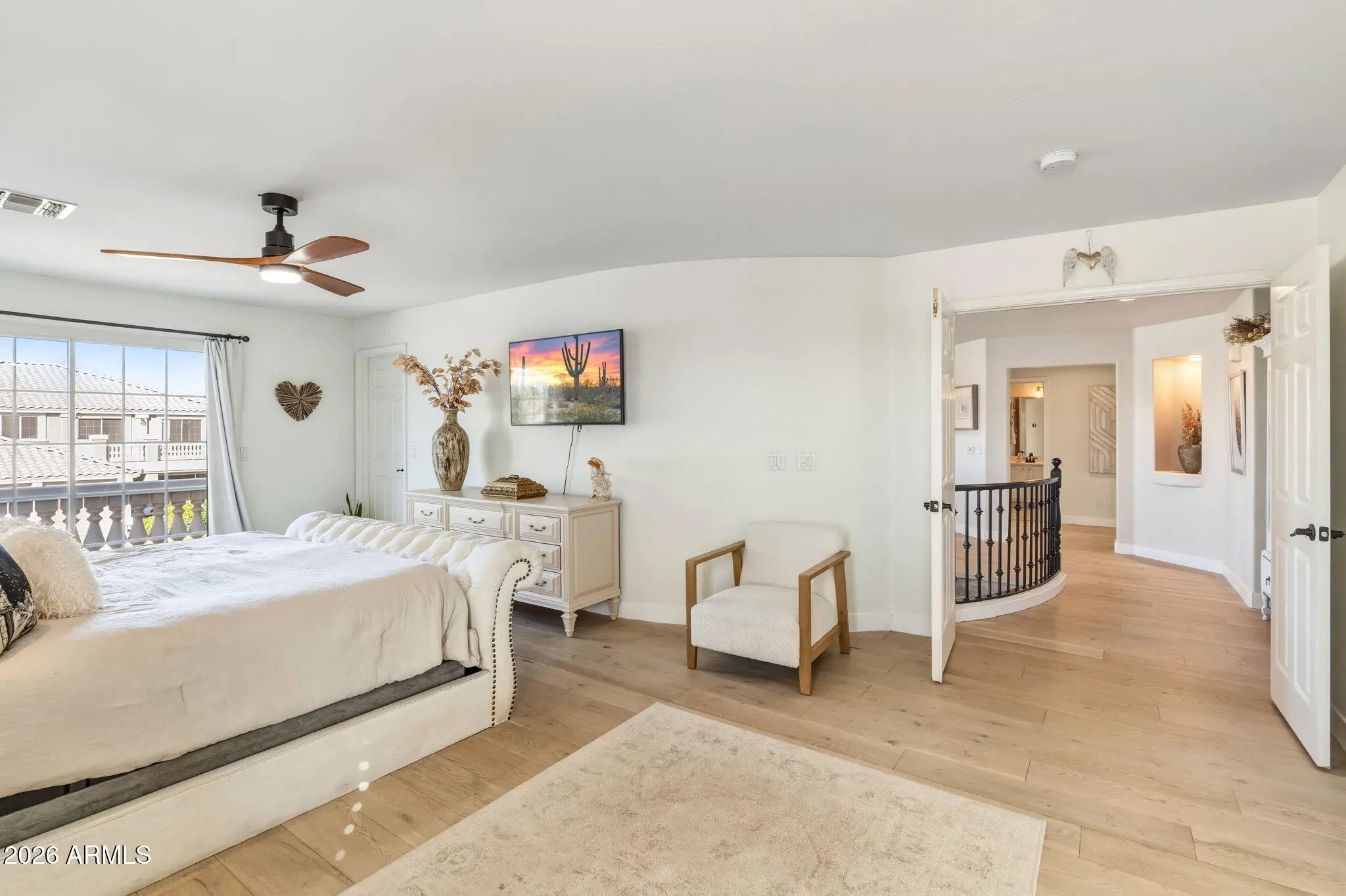 Modern comfort and move in ready! Enjoy the beauty of renovation done for you in a classic style that will never go out of style. Open airy floor plan seamlessly connects the spaces with ample room to host through multiple spaces inside and out. New hardwood floors carry throughout the entire home in a neutral palette. Large picture windows fill each space with natural light taking advantage of the north south exposure. Enjoy mountain views and sunsets from the balcony off the loft and primary suite or on the sun deck overlooking a lush resort backyard. Refinished kitchen cabinetry stun in a creamy white adorned with brushed brass hardware, elevated granite and a vintage toned backsplash capture that understated Studio McGee style. A mix of modern and textured fixtures throughout layer Flexible layout offers 4th bedroom downstairs with full bathroom for a multitude of lifestyle needs. Upstairs the spacious loft is the perfect flex room off the two secondary bedrooms. French doors lead into the expansive primary suite with a private balcony to the front and rear sun deck for morning coffee and private relaxation! Oversized backyard features grass, vibrant Ficus privacy wall, pebble play pool with picturesque waterfall & SLIDE! Extended covered patio with ceiling fans and plenty of decking for entertaining at its best! Side yard wide enough for storage shed and service door into the garage. New AC 2025, pool pump 2024, kitchen remodel 2025, new garage service door and deck door 2026, wood floors 2024/2025, interior paint 2024, soft water tank 2026. Minutes to multiple trailheads for hiking, Lifetime Fitness, Lake Pleasant shopping & dining, 101 / 17 quick access and 10 minutes to TSMC! Premiere cul-de-sac living on top of it all.