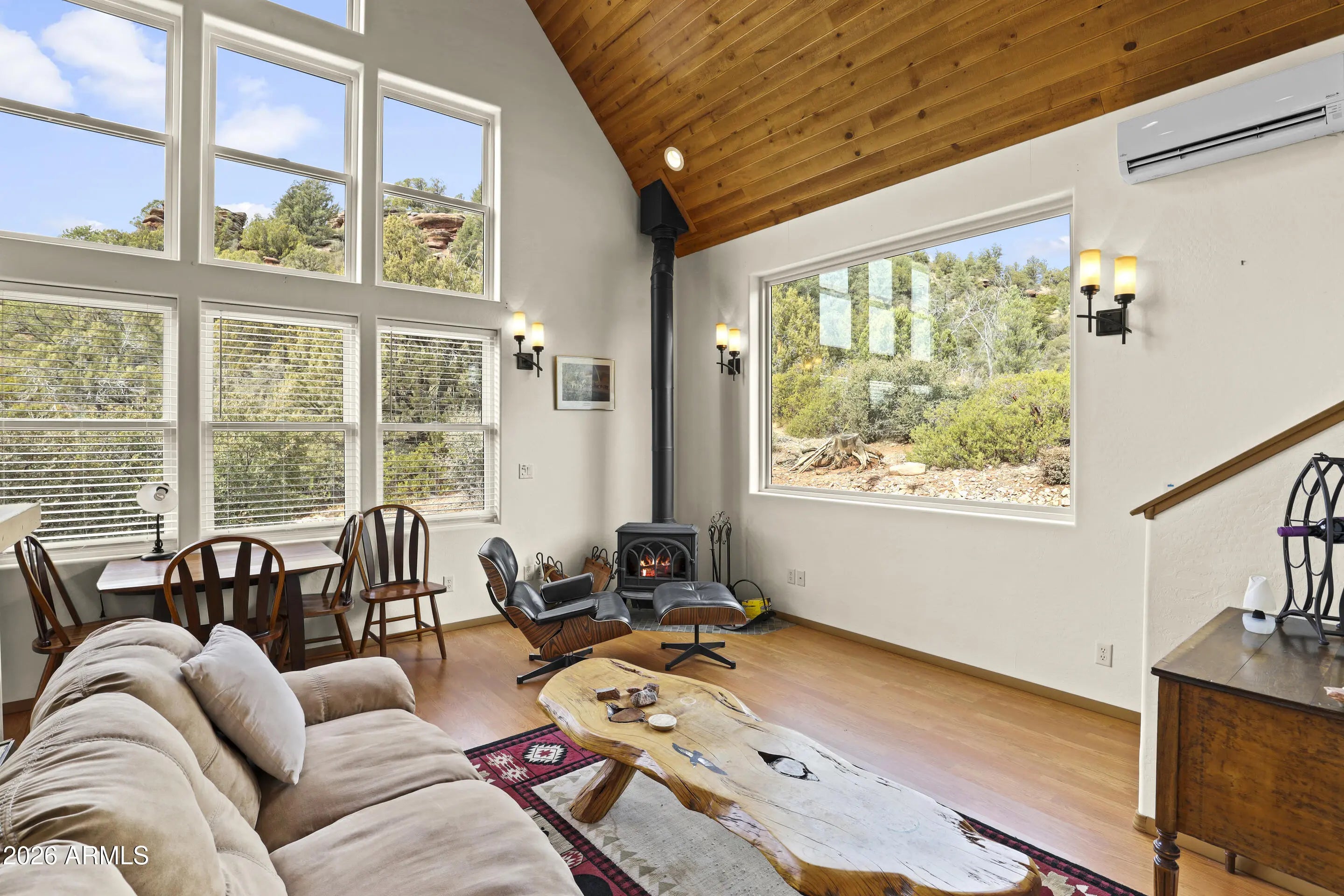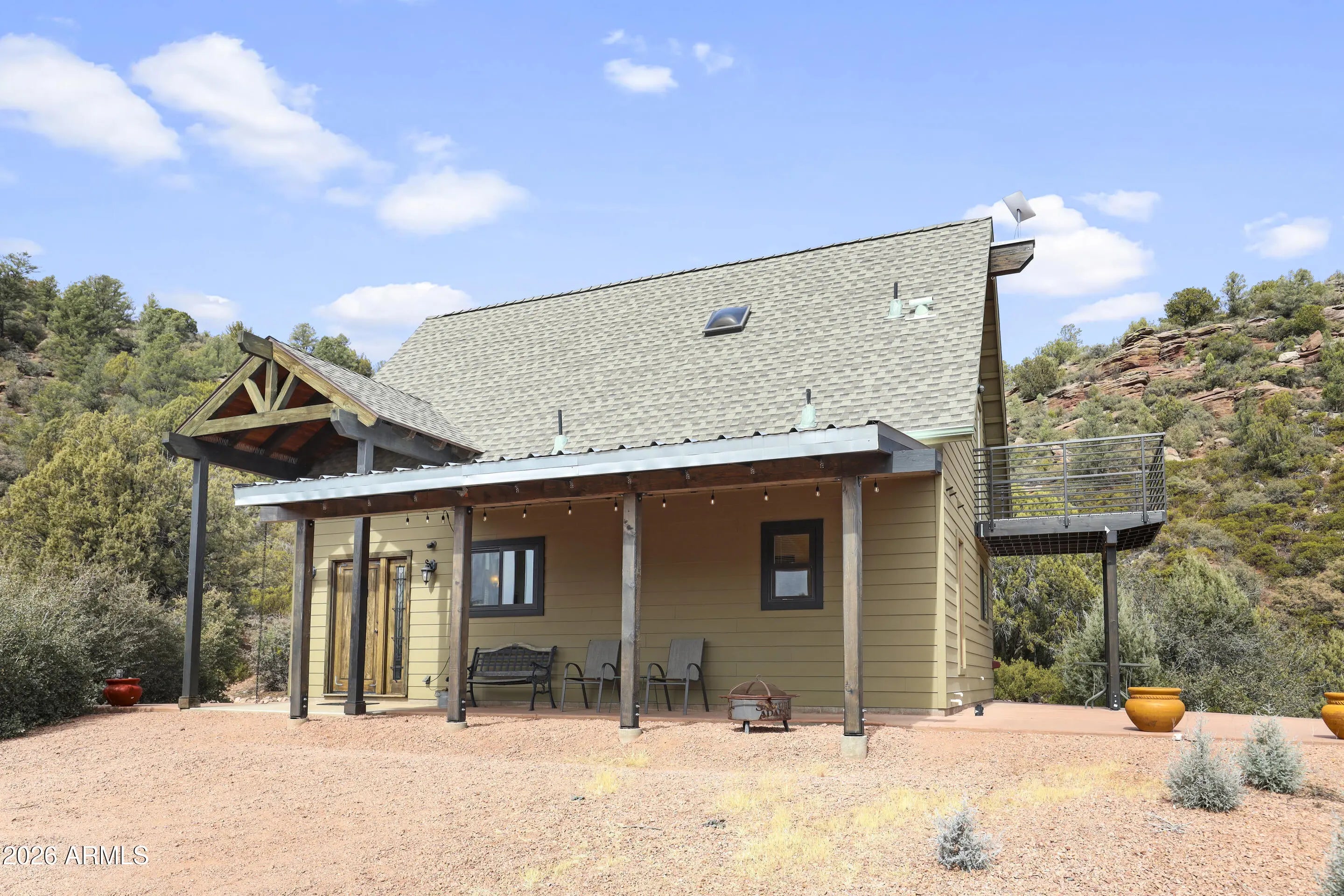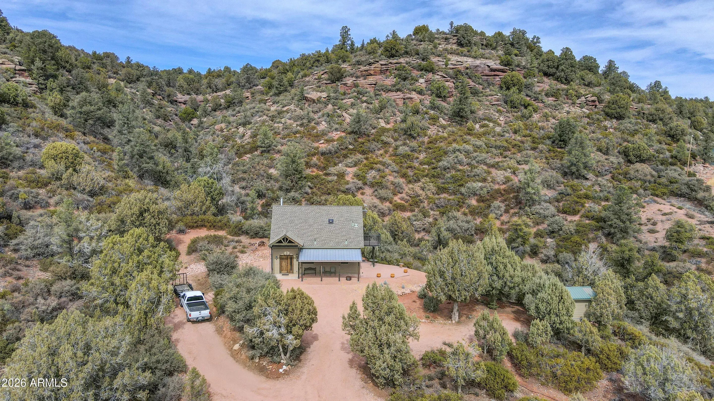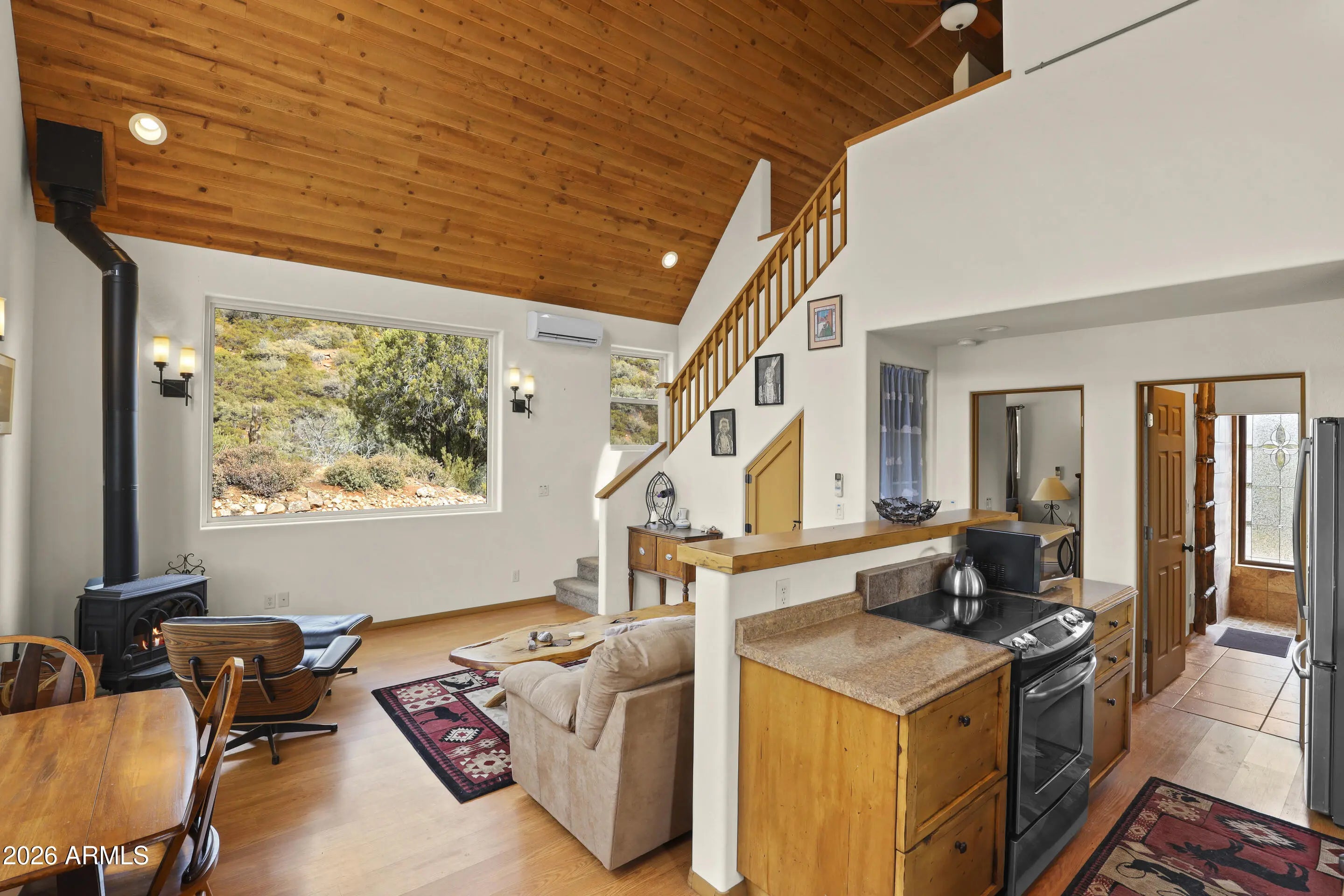 Rare opportunity to own a chalet styled home bordering National Forest! Enjoy unobstructed views, total privacy, and walking distance to the East Verde River. Your ultimate mountain lifestyle awaits. Remarkable privacy on 1.64 acres with the Tonto National Forest in your backyard. Main bedroom is on lower level with access to back patio and tranquil view of the forest. Walk-in shower, single vanity sink, stacked washer and dryer are in attached bathroom..Kitchen has an electric oven, refrigerator, microwave, real wood cabinets and a built-on dining table that folds against the breakfast bar. Wood stove in Great Room and windows galore for tons of natural light! Sleeping loft has access to a spacious deck to view stars and wildlife. Full bathroom upstairs as well as small built in desk area. Large concrete, wrap around patio for outdoor entertaining and a covered patio in front of the house. There is a small shed, extra parking and RV parking at the base of driveway. Home is being sold turn-key, with exception of a few personal items.